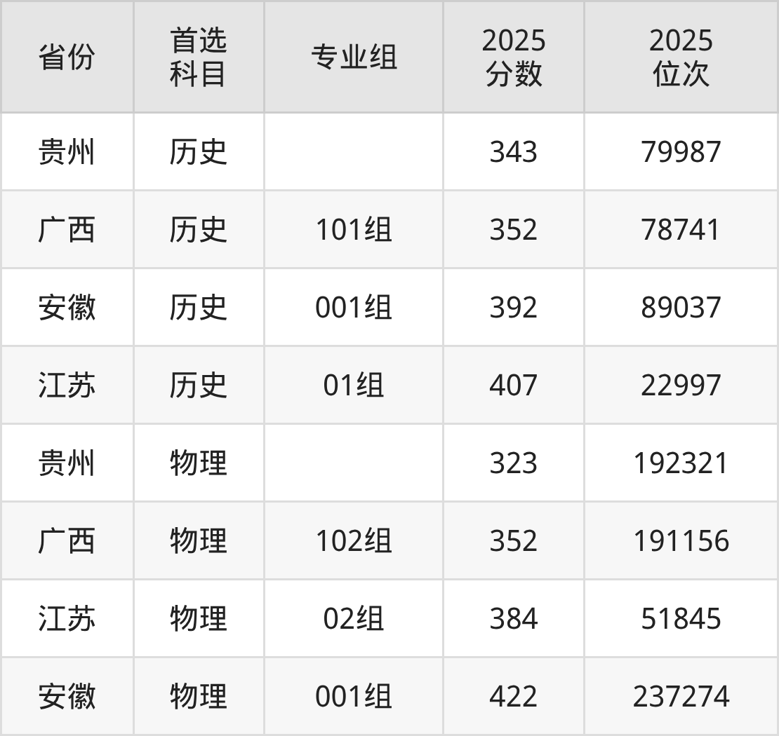 历史类最低分对应地区为贵州,录取位次为79987,超专科线163分;最高分对应地区为江苏(01组),录取位次为22997,超专科线187分。