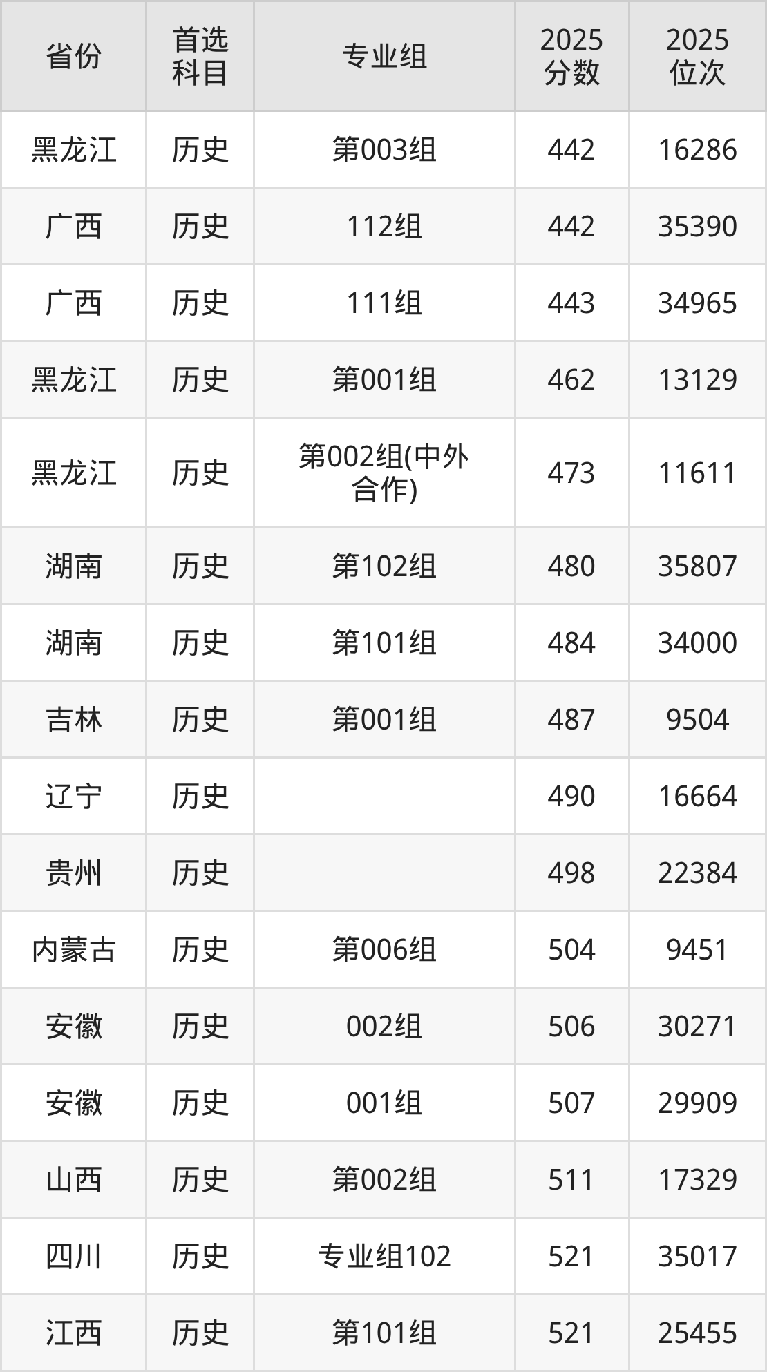 历史类最低分对应地区为黑龙江(第003组),录取位次为16286,超本科线37分;最高分对应地区为河北,录取位次为29738,超本科线71分。
