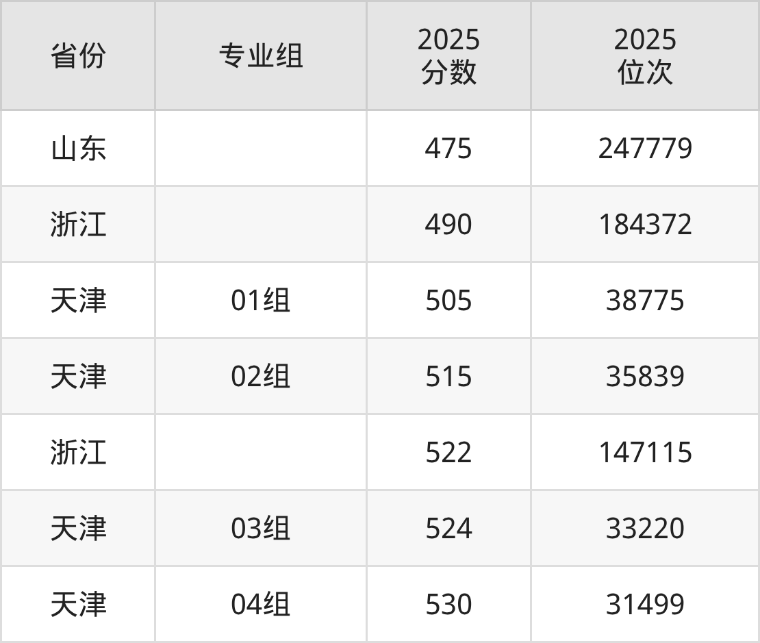 最低分对应地区为山东,录取位次为247779,超一段线34分;最高分对应地区为天津(04组),录取位次为31499,超本科线54分。