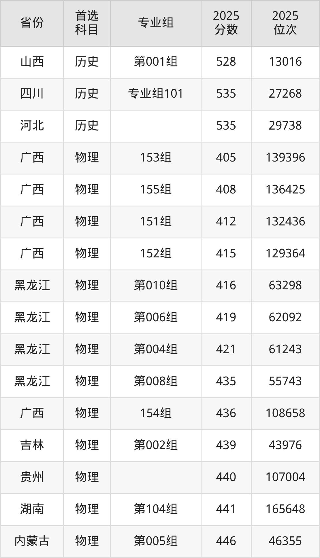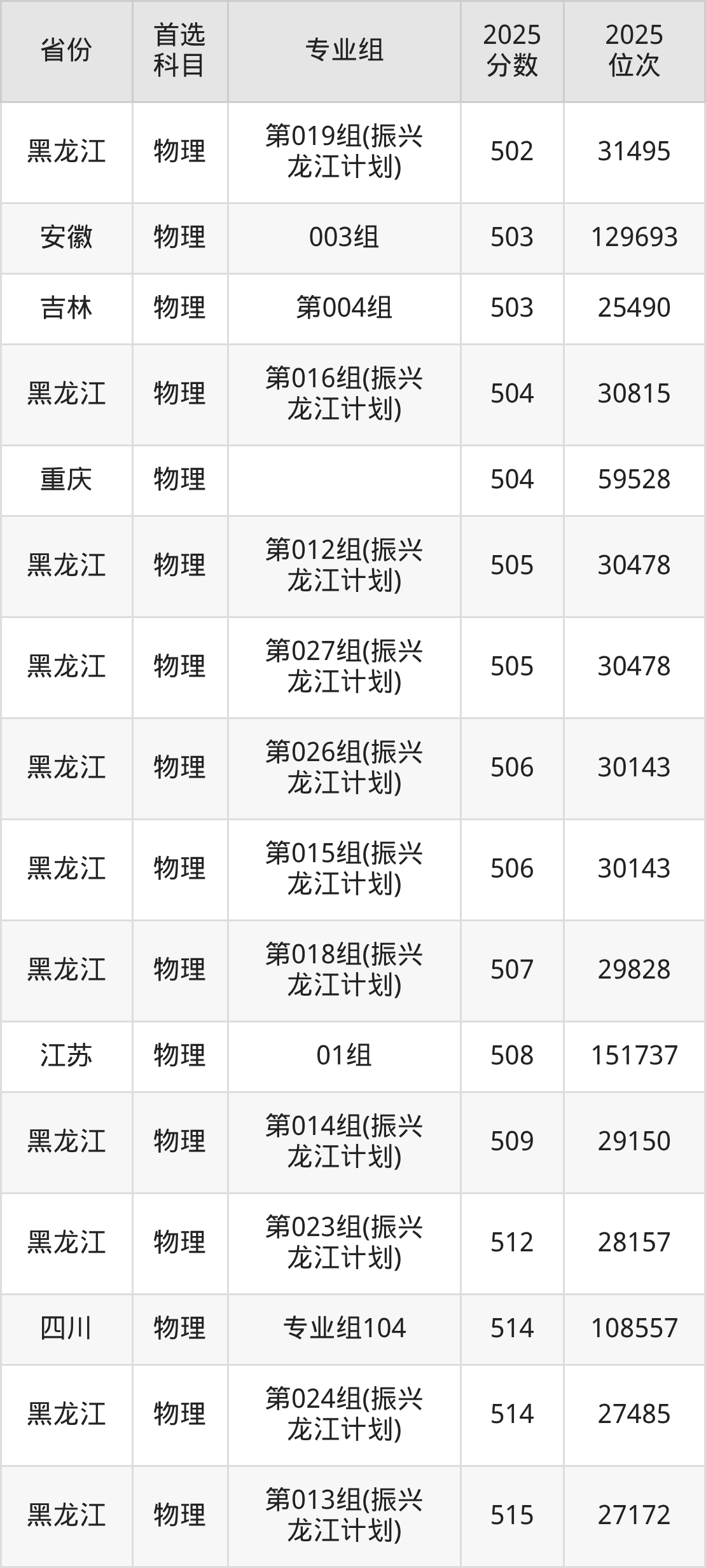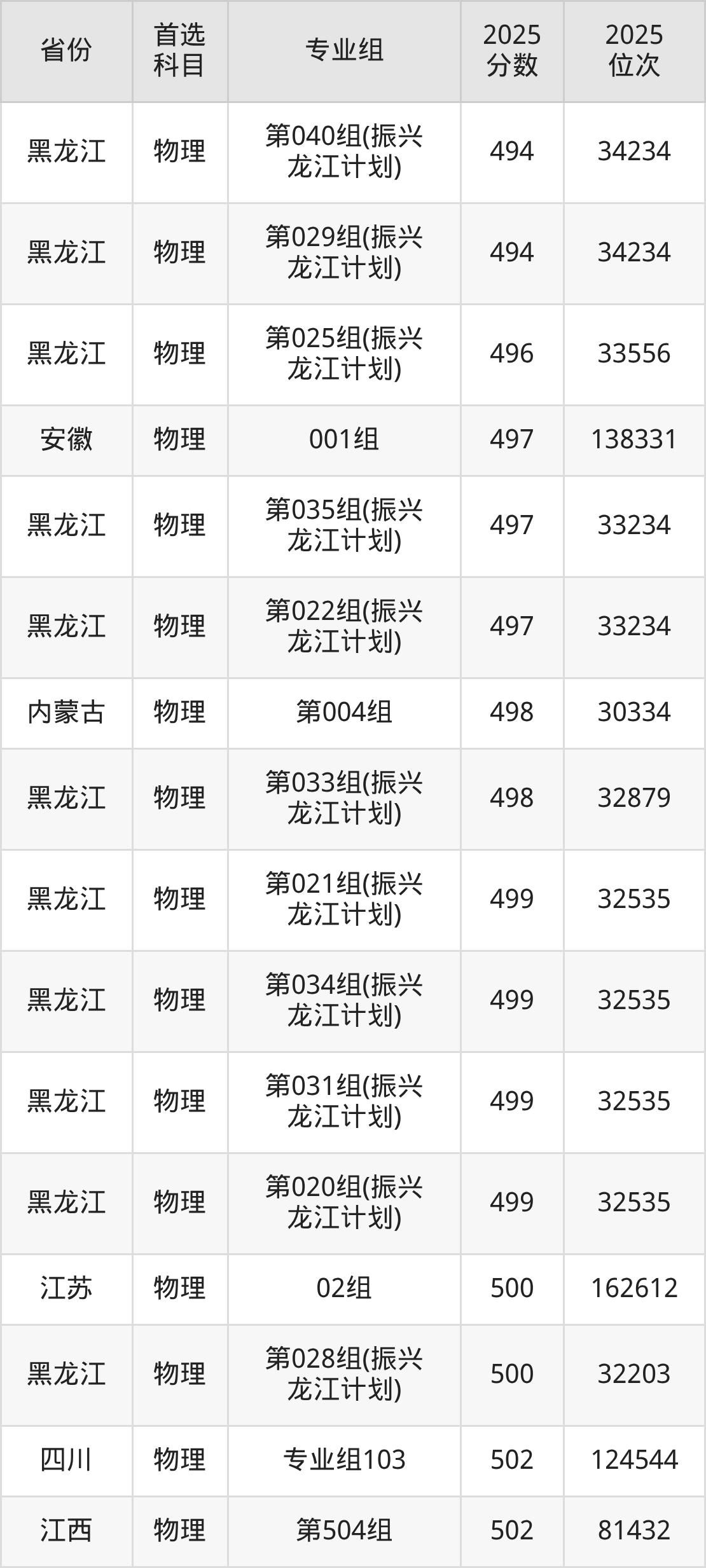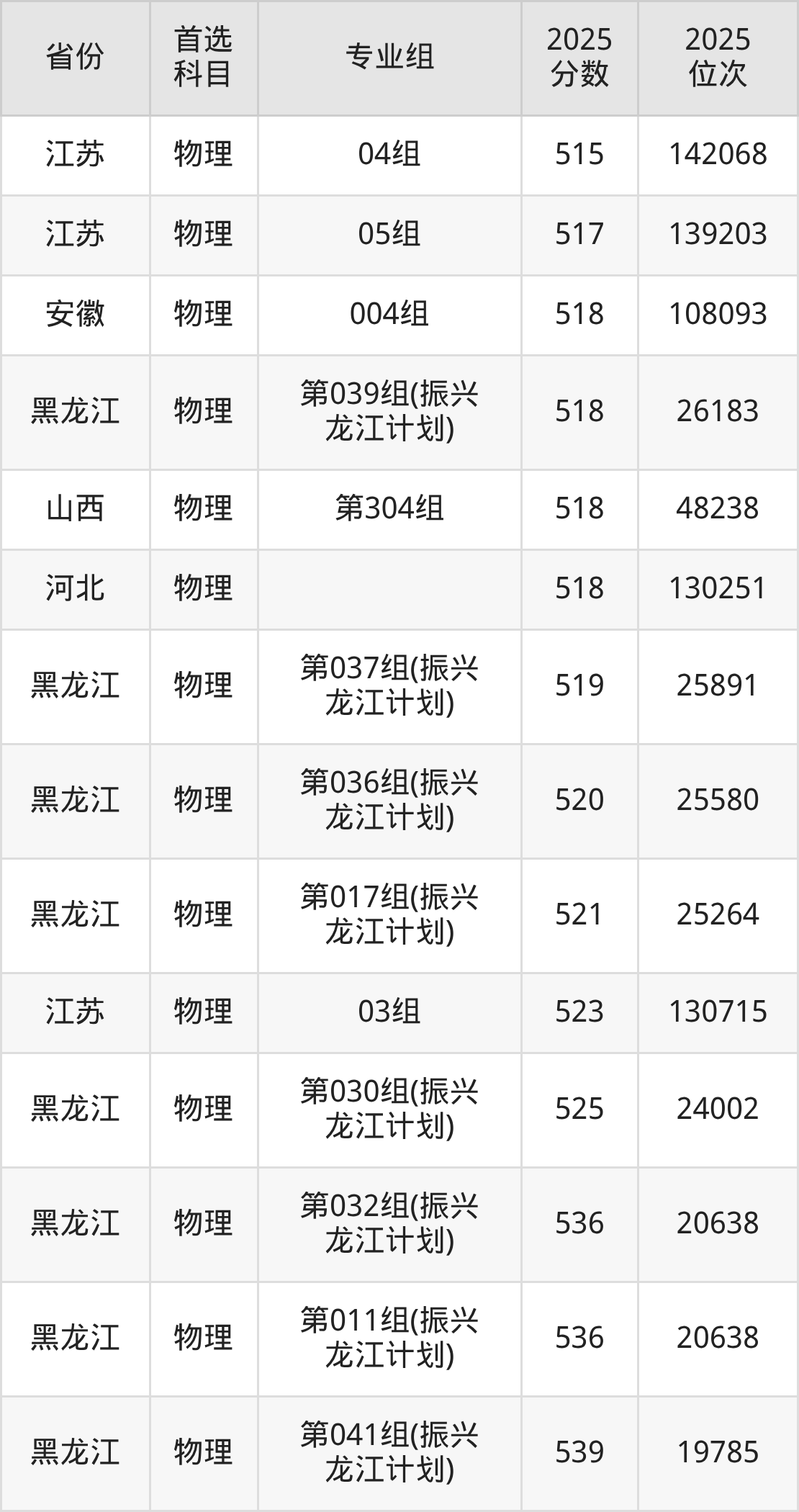 物理类:第004组421分、61243名,第005组(中外合作)459分、46685名,第006组419分、62092名,第007组(中外合作)446分、51508名,第008组435分、55743名,第009组471分、42270名,第010组416分、63298名,第011组(振兴龙江计划)536分、20638名,第012组(振兴龙江计划)505分、30478名,第013组(振兴龙江计划)515分、27172名,第014组(振兴龙江计划)509分、29150名,第015组(振兴龙江计划)506分、30143名,第016组(振兴龙江计划)504分、30815名,第017组(振兴龙江计划)521分、25264名,第018组(振兴龙江计划)507分、29828名,第019组(振兴龙江计划)502分、31495名,第020组(振兴龙江计划)499分、32535名,第021组(振兴龙江计划)499分、32535名,第022组(振兴龙江计划)497分、33234名,第023组(振兴龙江计划)512分、28157名,第024组(振兴龙江计划)514分、27485名,第025组(振兴龙江计划)496分、33556名,第026组(振兴龙江计划)506分、30143名,第027组(振兴龙江计划)505分、30478名,第028组(振兴龙江计划)500分、32203名,第029组(振兴龙江计划)494分、34234名,第030组(振兴龙江计划)525分、24002名,第031组(振兴龙江计划)499分、32535名,第032组(振兴龙江计划)536分、20638名,第033组(振兴龙江计划)498分、32879名,第034组(振兴龙江计划)499分、32535名,第035组(振兴龙江计划)497分、33234名,第036组(振兴龙江计划)520分、25580名,第037组(振兴龙江计划)519分、25891名,第038组(振兴龙江计划)488分、36322名,第039组(振兴龙江计划)518分、26183名,第040组(振兴龙江计划)494分、34234名,第041组(振兴龙江计划)539分、19785名;