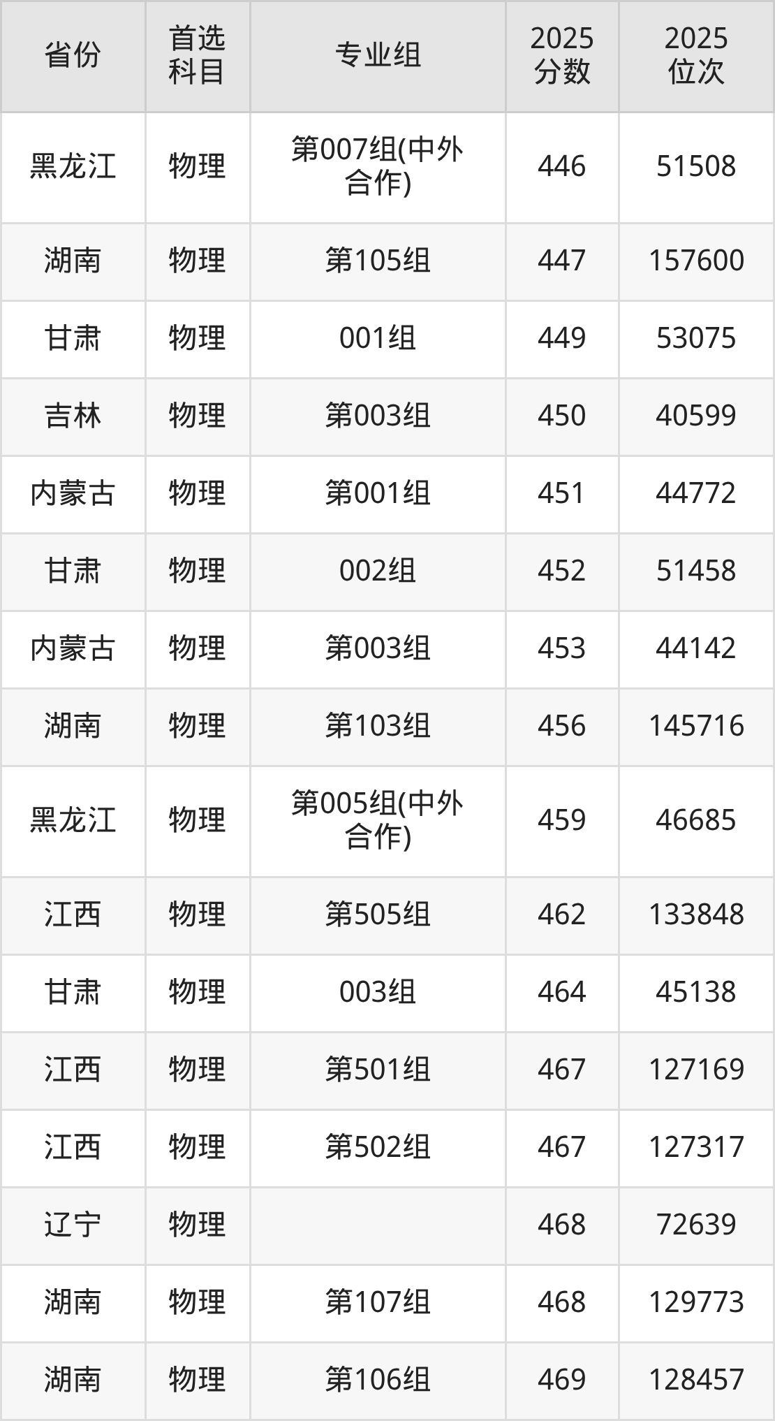 物理类:第005组440分、55795名,第006组(中外合作)467分、45792名,第007组421分、62957名,第008组429分、59914名,第009组471分、44354名,第010组(中外合作)458分、48995名,第011组433分、58462名,第012组(振兴龙江计划)500分、34515名,第013组(振兴龙江计划)498分、35206名,第014组(振兴龙江计划)488分、38407名,第015组(振兴龙江计划)487分、38734名,第016组(振兴龙江计划)509分、31720名,第017组(振兴龙江计划)520分、28339名,第018组(振兴龙江计划)489分、38055名,第019组(振兴龙江计划)483分、40103名,第020组(振兴龙江计划)509分、31720名,第021组(振兴龙江计划)505分、32966名,第022组(振兴龙江计划)493分、36710名,第023组(振兴龙江计划)502分、33913名,第024组(振兴龙江计划)492分、37058名,第025组(振兴龙江计划)491分、37390名,第026组(振兴龙江计划)504分、33269名,第027组(振兴龙江计划)490分、37704名,第028组(振兴龙江计划)492分、37058名,第029组(振兴龙江计划)485分、39401名,第030组(振兴龙江计划)487分、38734名;