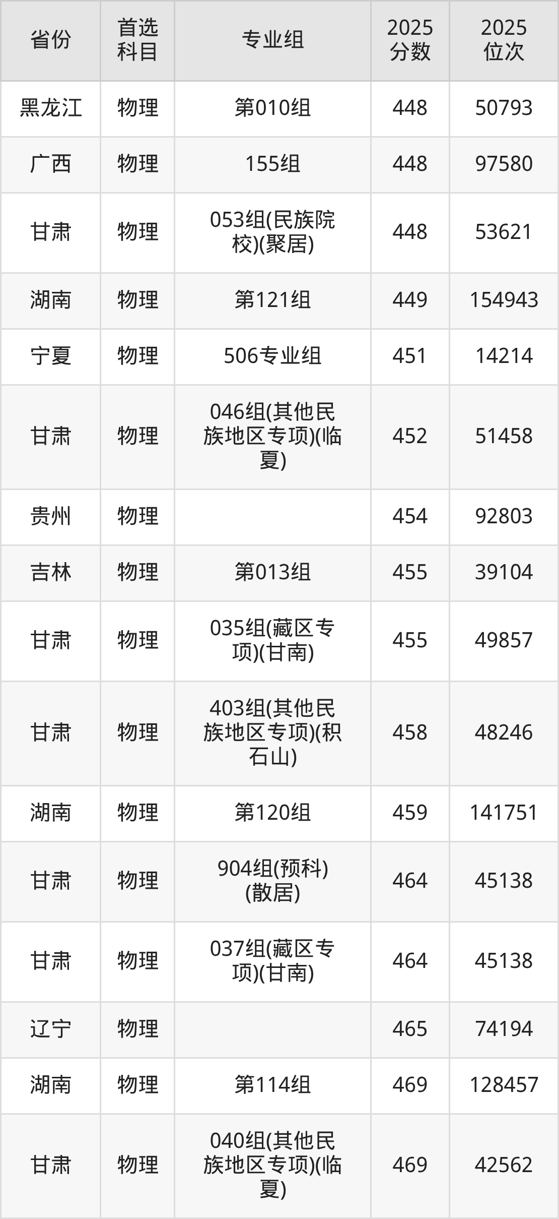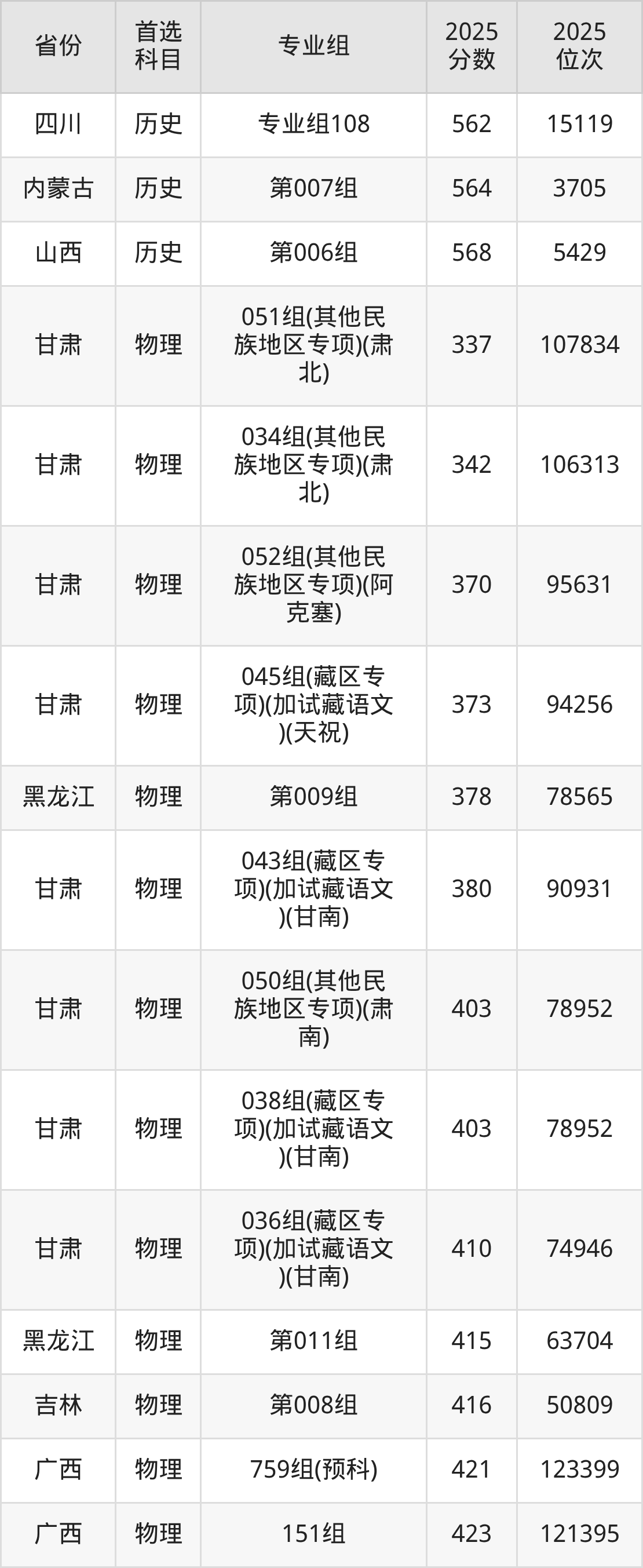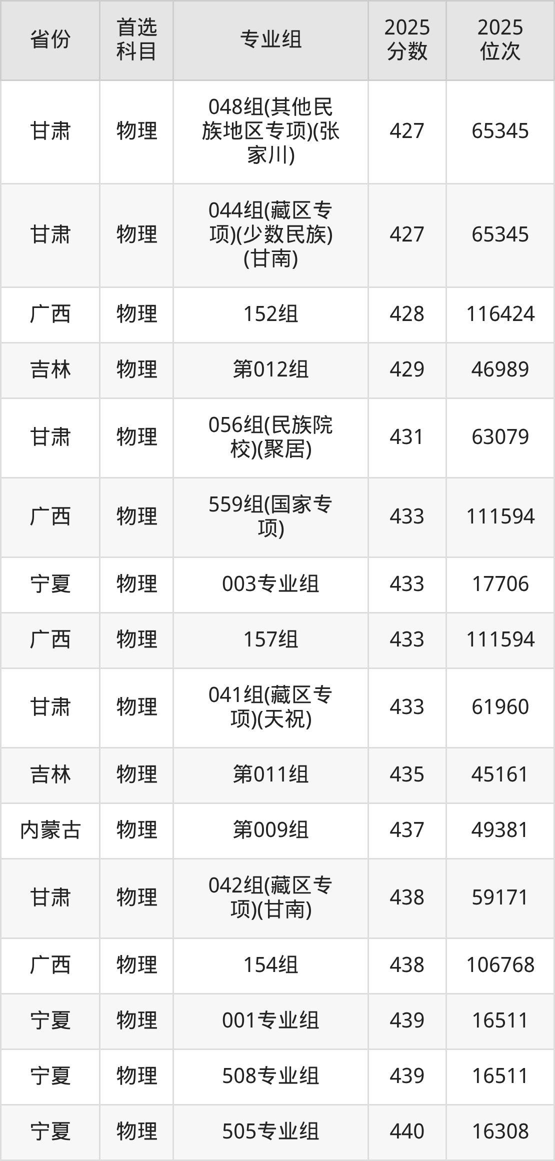 物理类:001组381分、87284名,002组494分、35721名,034组494分、35721名,035组485分、39471名,036组495分、35328名,037组518分、26412名,039组480分、41639名,040组(藏区专项)(甘南)475分、43850名,041组(藏区专项)(加试藏语文)(甘南)411分、74040名,042组(藏区专项)(甘南)461分、50186名,043组(藏区专项)(加试藏语文)(甘南)390分、83584名,044组(藏区专项)(天祝)441分、59775名,045组(其他民族地区专项)(临夏)473分、44717名,046组(其他民族地区专项)(少数民族)(临夏)460分、50668名,047组(藏区专项)(甘南)446分、57340名,048组(藏区专项)(加试藏语文)(甘南)396分、80933名,049组(藏区专项)(少数民族)(甘南)421分、69384名,050组(藏区专项)(加试藏语文)(天祝)308分、108154名,051组(其他民族地区专项)(临夏)455分、52999名,052组(其他民族地区专项)(少数民族)(临夏)447分、56851名,053组(其他民族地区专项)(张家川)429分、65575名,054组(其他民族地区专项)(张家川)446分、57340名,055组(其他民族地区专项)(肃南)384分、86107名,056组(其他民族地区专项)(肃北)334分、102665名,057组(其他民族地区专项)(阿克塞)320分、105183名,058组(民族院校)(聚居)467分、46764名,059组(民族院校)(聚居)454分、52758名,060组(民族院校)(聚居)497分、33984名,061组(民族院校)(聚居)437分、60962名,062组(国家专项)473分、44717名,063组(国家专项)525分、23897名,903组(预科)(聚居)450分、55373名,904组(预科)(散居)466分、47875名;