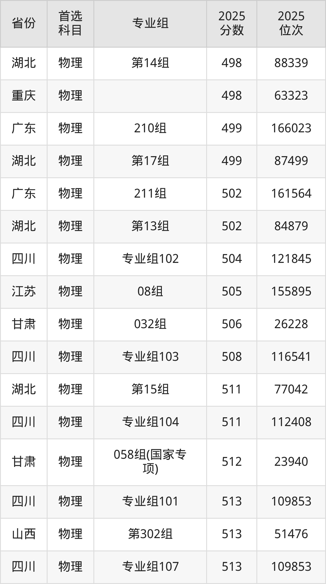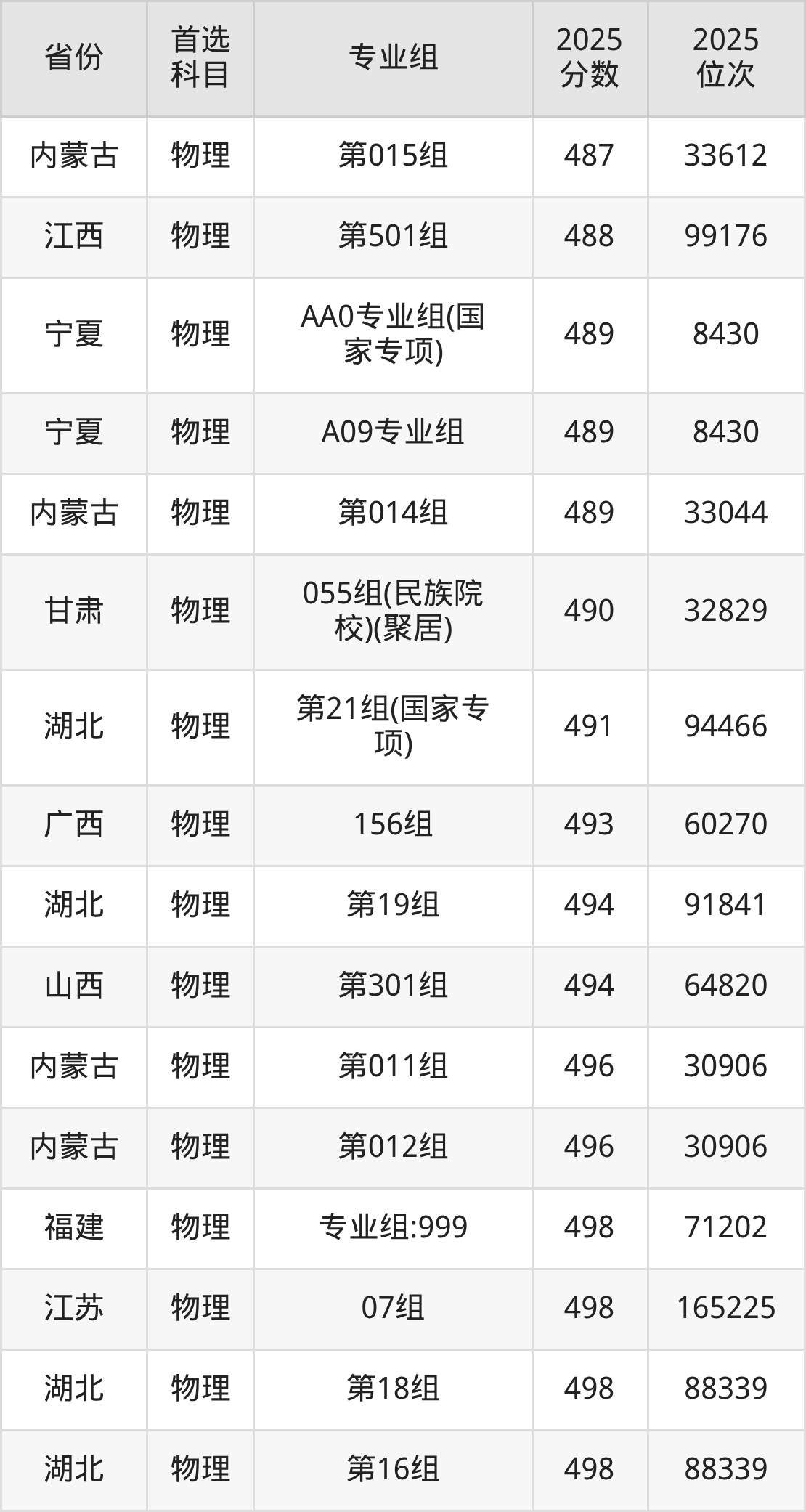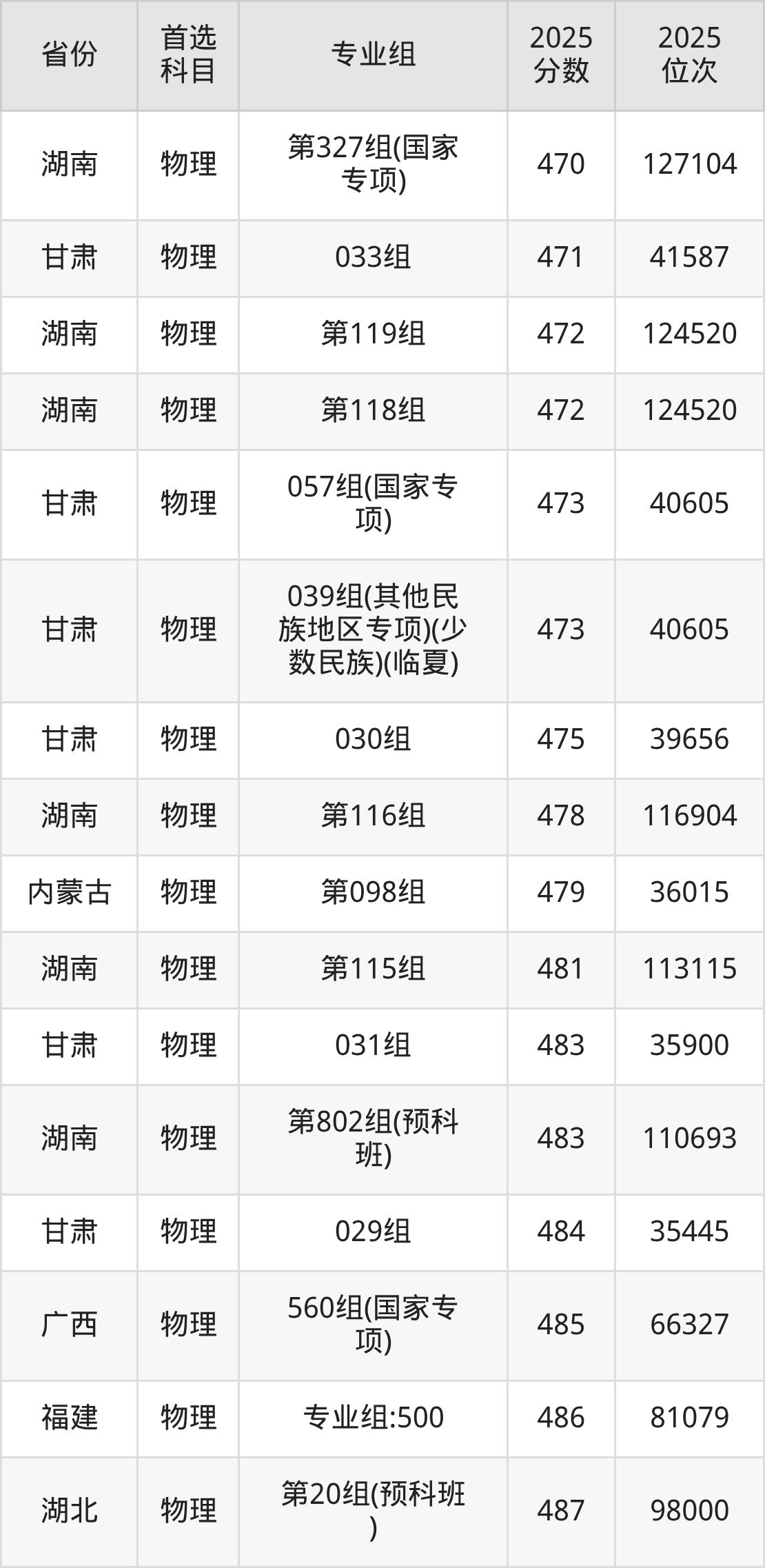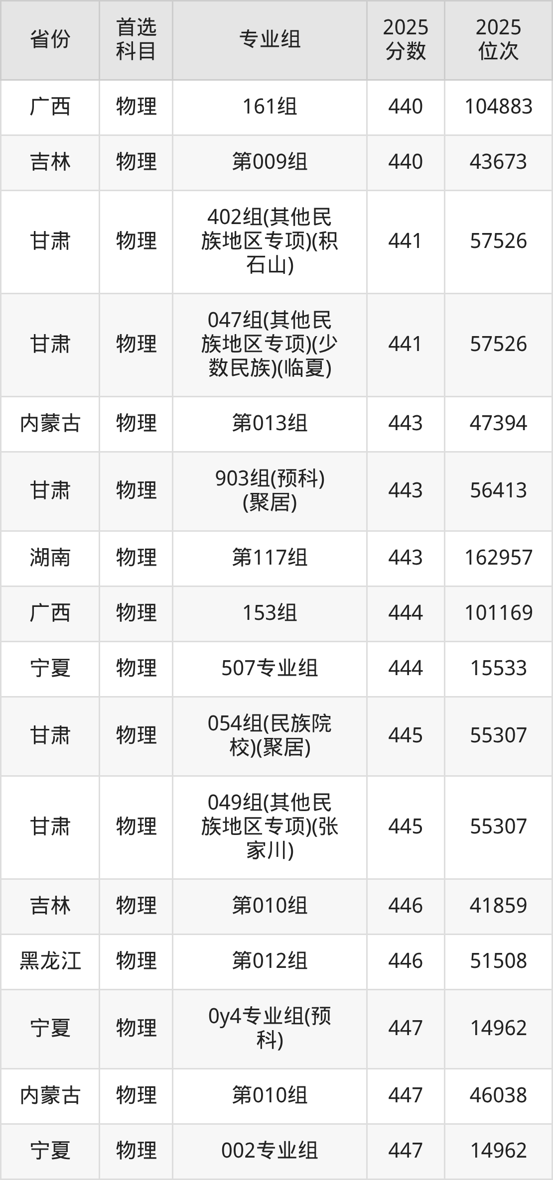 物理类:001组381分、87284名,002组494分、35721名,034组494分、35721名,035组485分、39471名,036组495分、35328名,037组518分、26412名,039组480分、41639名,040组(藏区专项)(甘南)475分、43850名,041组(藏区专项)(加试藏语文)(甘南)411分、74040名,042组(藏区专项)(甘南)461分、50186名,043组(藏区专项)(加试藏语文)(甘南)390分、83584名,044组(藏区专项)(天祝)441分、59775名,045组(其他民族地区专项)(临夏)473分、44717名,046组(其他民族地区专项)(少数民族)(临夏)460分、50668名,047组(藏区专项)(甘南)446分、57340名,048组(藏区专项)(加试藏语文)(甘南)396分、80933名,049组(藏区专项)(少数民族)(甘南)421分、69384名,050组(藏区专项)(加试藏语文)(天祝)308分、108154名,051组(其他民族地区专项)(临夏)455分、52999名,052组(其他民族地区专项)(少数民族)(临夏)447分、56851名,053组(其他民族地区专项)(张家川)429分、65575名,054组(其他民族地区专项)(张家川)446分、57340名,055组(其他民族地区专项)(肃南)384分、86107名,056组(其他民族地区专项)(肃北)334分、102665名,057组(其他民族地区专项)(阿克塞)320分、105183名,058组(民族院校)(聚居)467分、46764名,059组(民族院校)(聚居)454分、52758名,060组(民族院校)(聚居)497分、33984名,061组(民族院校)(聚居)437分、60962名,062组(国家专项)473分、44717名,063组(国家专项)525分、23897名,903组(预科)(聚居)450分、55373名,904组(预科)(散居)466分、47875名;