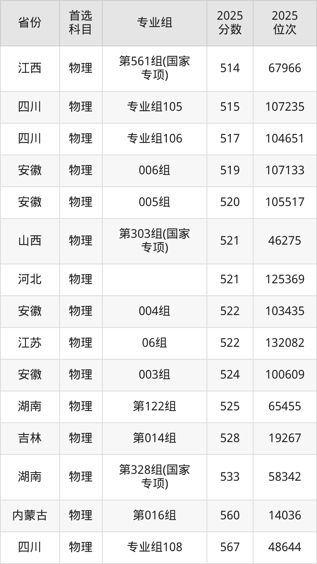 物理类最低分对应地区为甘肃(051组(其他民族地区专项)(肃北)),录取位次为107834,低本科线37分;最高分对应地区为四川(专业组108),录取位次为48644,超本科B129分。