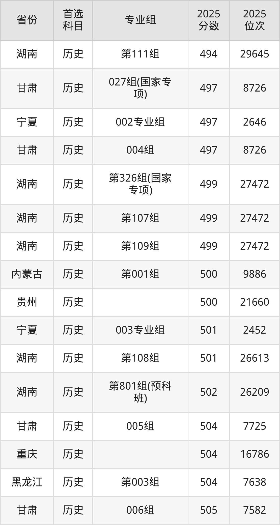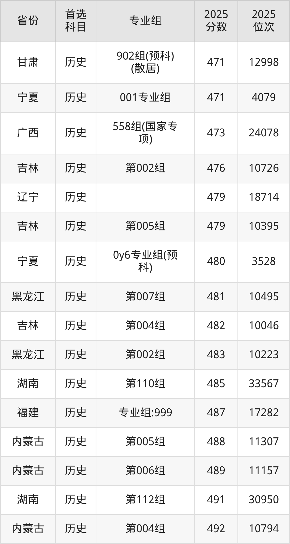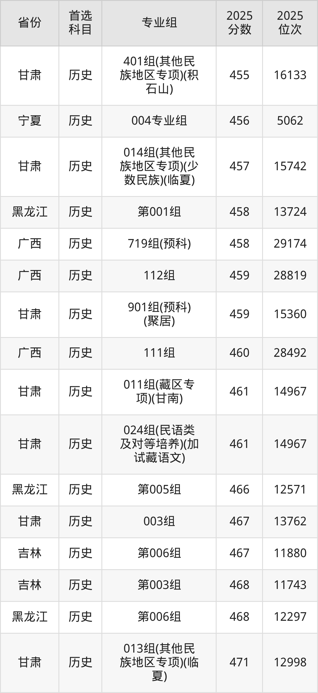 历史类:003组467分、13762名,004组497分、8726名,005组504分、7725名,006组505分、7582名,007组528分、4794名,008组542分、3501名,009组(藏区专项)(甘南)446分、18013名,010组(藏区专项)(天祝)453分、16575名,011组(藏区专项)(甘南)461分、14967名,012组(藏区专项)(加试藏语文)(甘南)399分、28154名,013组(其他民族地区专项)(临夏)471分、12998名,014组(其他民族地区专项)(少数民族)(临夏)457分、15742名,015组(其他民族地区专项)(张家川)435分、20327名,016组(其他民族地区专项)(肃南)434分、20537名,017组(其他民族地区专项)(肃北)389分、30450名,018组(其他民族地区专项)(阿克塞)435分、20327名,019组(藏区专项)(加试藏语文)(天祝)383分、31753名,020组(藏区专项)(加试藏语文)(甘南)435分、20327名,021组(民族院校)(聚居)453分、16575名,022组(民族院校)(聚居)448分、17634名,023组(民族院校)(聚居)443分、18632名,024组(民语类及对等培养)(加试藏语文)461分、14967名,025组(民语类及对等培养)(加试藏语文)437分、19896名,026组(民语类及对等培养)(加试蒙语文)301分、49871名,027组(国家专项)497分、8726名,028组(国家专项)520分、5681名,401组(其他民族地区专项)(积石山)455分、16133名,901组(预科)(聚居)459分、15360名,902组(预科)(散居)471分、12998名;