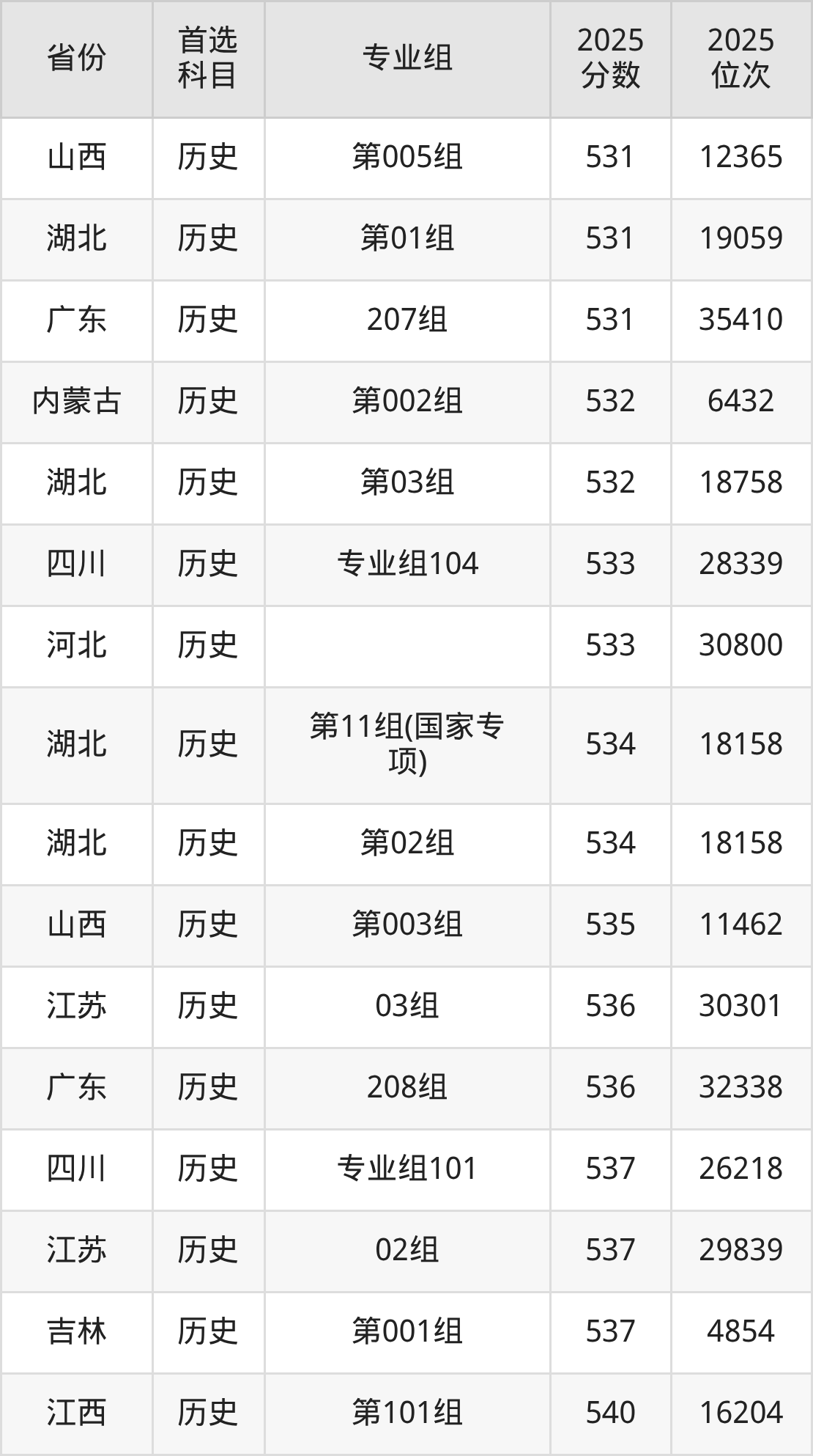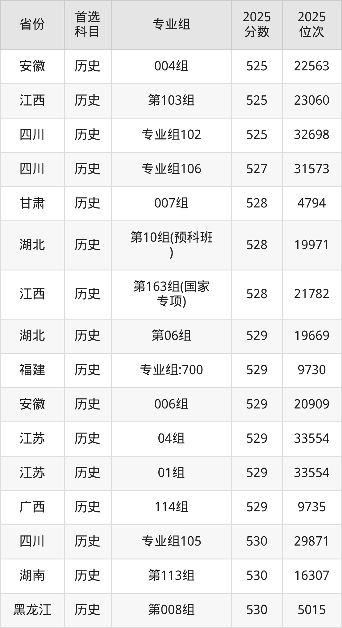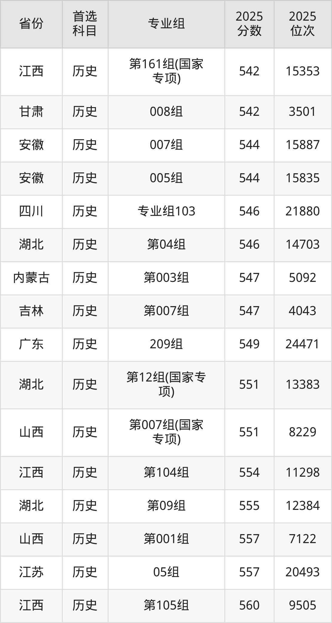 历史类:003组467分、13762名,004组497分、8726名,005组504分、7725名,006组505分、7582名,007组528分、4794名,008组542分、3501名,009组(藏区专项)(甘南)446分、18013名,010组(藏区专项)(天祝)453分、16575名,011组(藏区专项)(甘南)461分、14967名,012组(藏区专项)(加试藏语文)(甘南)399分、28154名,013组(其他民族地区专项)(临夏)471分、12998名,014组(其他民族地区专项)(少数民族)(临夏)457分、15742名,015组(其他民族地区专项)(张家川)435分、20327名,016组(其他民族地区专项)(肃南)434分、20537名,017组(其他民族地区专项)(肃北)389分、30450名,018组(其他民族地区专项)(阿克塞)435分、20327名,019组(藏区专项)(加试藏语文)(天祝)383分、31753名,020组(藏区专项)(加试藏语文)(甘南)435分、20327名,021组(民族院校)(聚居)453分、16575名,022组(民族院校)(聚居)448分、17634名,023组(民族院校)(聚居)443分、18632名,024组(民语类及对等培养)(加试藏语文)461分、14967名,025组(民语类及对等培养)(加试藏语文)437分、19896名,026组(民语类及对等培养)(加试蒙语文)301分、49871名,027组(国家专项)497分、8726名,028组(国家专项)520分、5681名,401组(其他民族地区专项)(积石山)455分、16133名,901组(预科)(聚居)459分、15360名,902组(预科)(散居)471分、12998名;