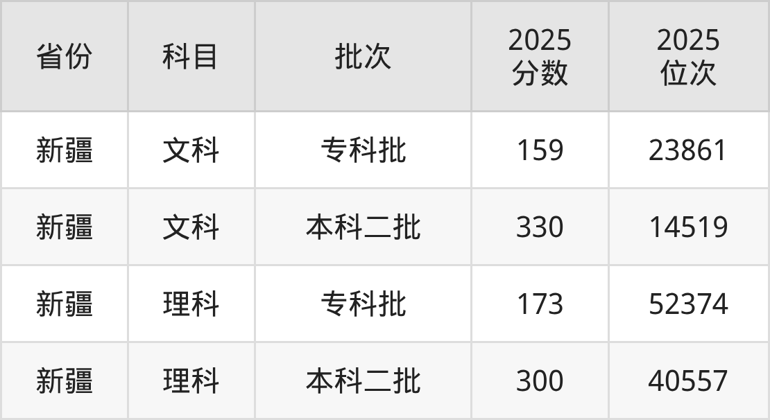 文科最低分对应地区为新疆,录取位次为23861,超专科线19分;最高分对应地区为新疆,录取位次为14519。