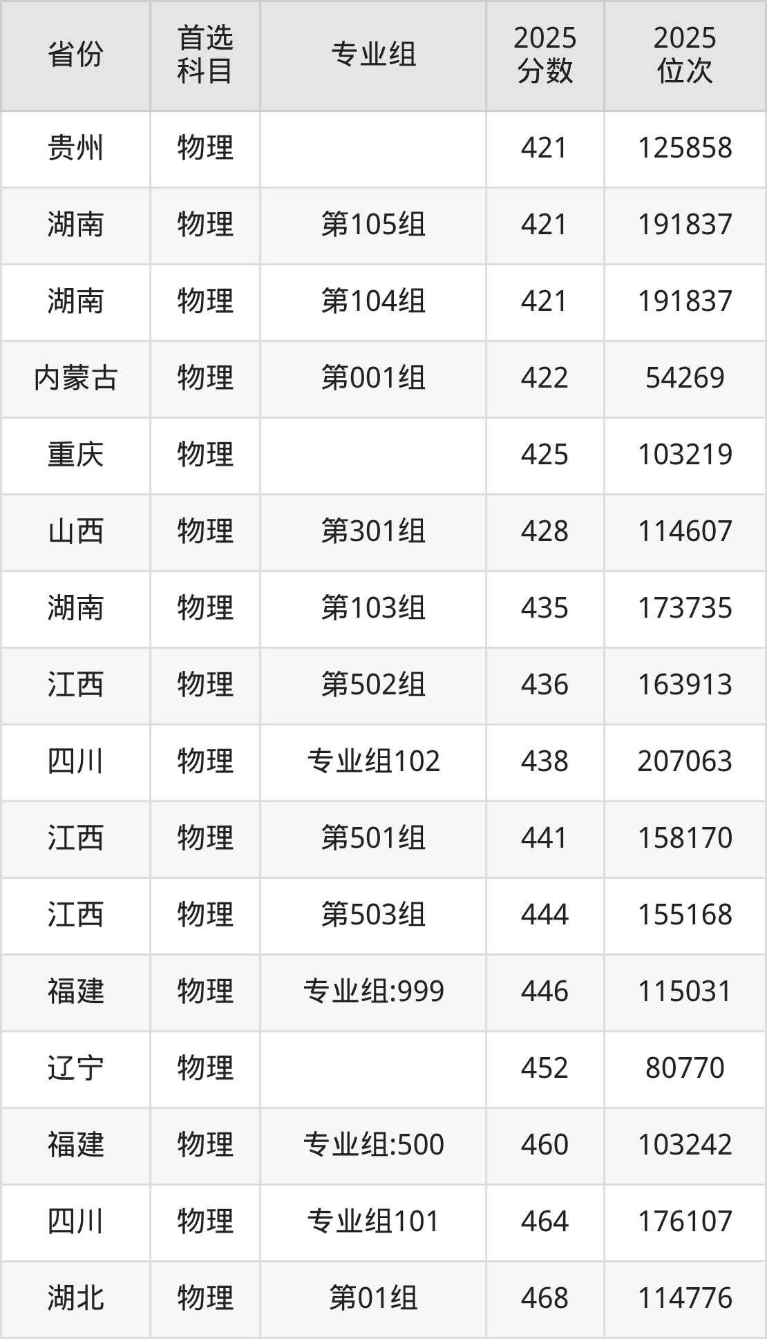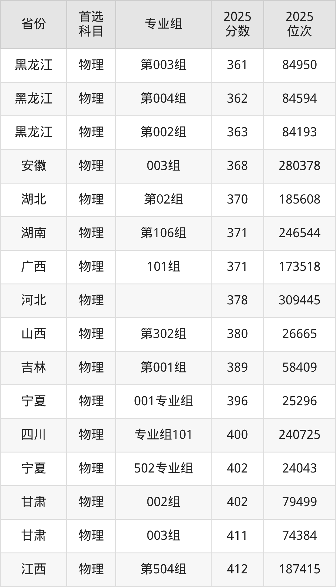 物理类:001组480分、163532名,002组476分、170289名,003组368分、280378名;