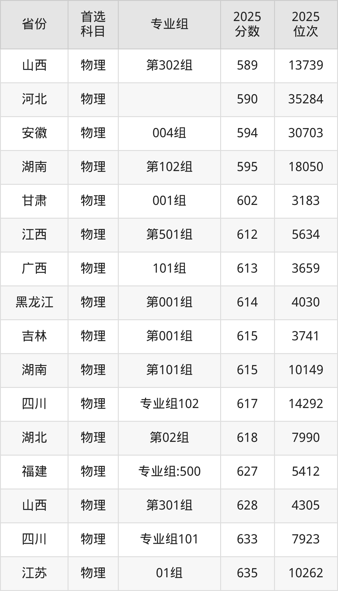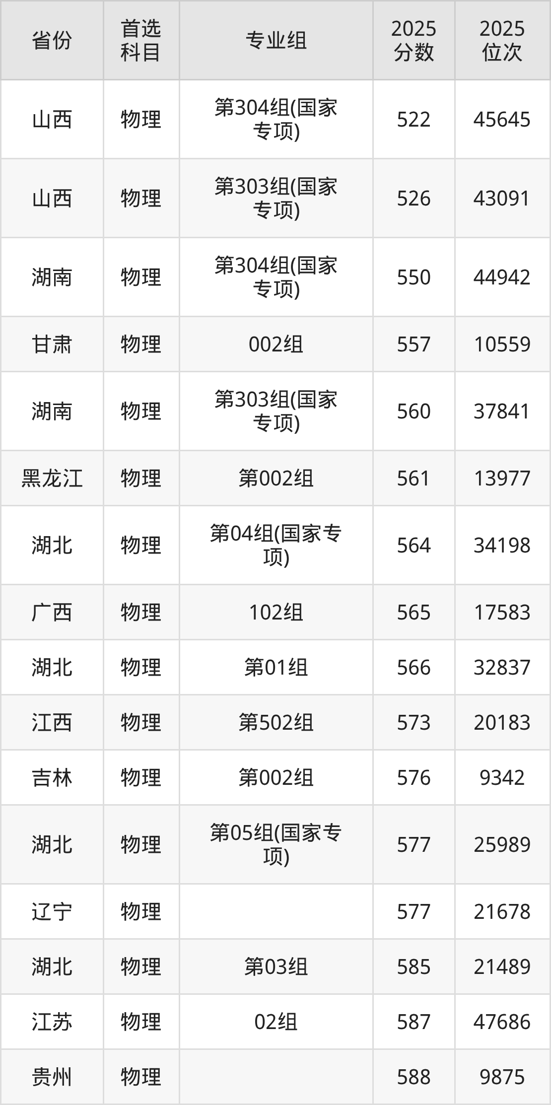 物理类最低分对应地区为山西(第304组(国家专项)),录取位次为45645,超本科线103分;最高分对应地区为安徽(003组),录取位次为7376,超本科线178分。