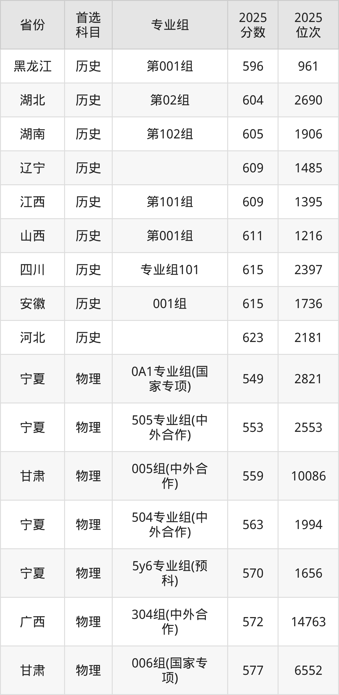 历史类最低分对应地区为黑龙江(第001组),录取位次为961,超本科线191分;最高分对应地区为河北,录取位次为2181,超本科线146分。