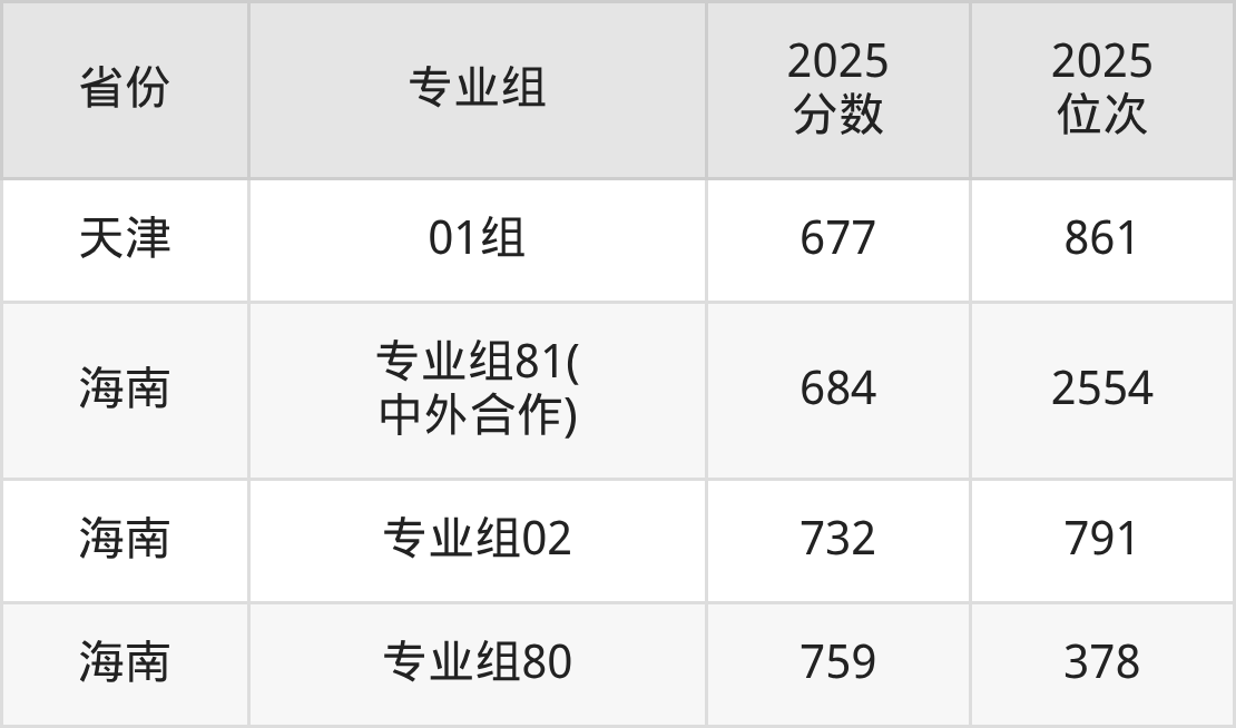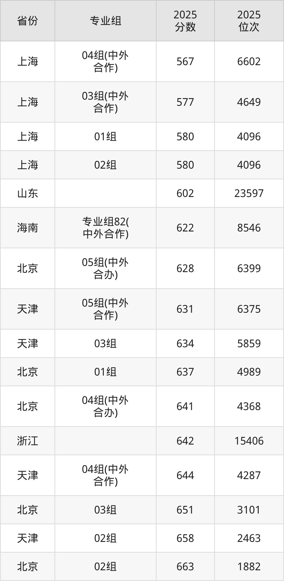 最低分对应地区为上海(04组(中外合作)),录取位次为6602,超本科线165分;最高分对应地区为海南(专业组80),录取位次为378,超本科线279分。