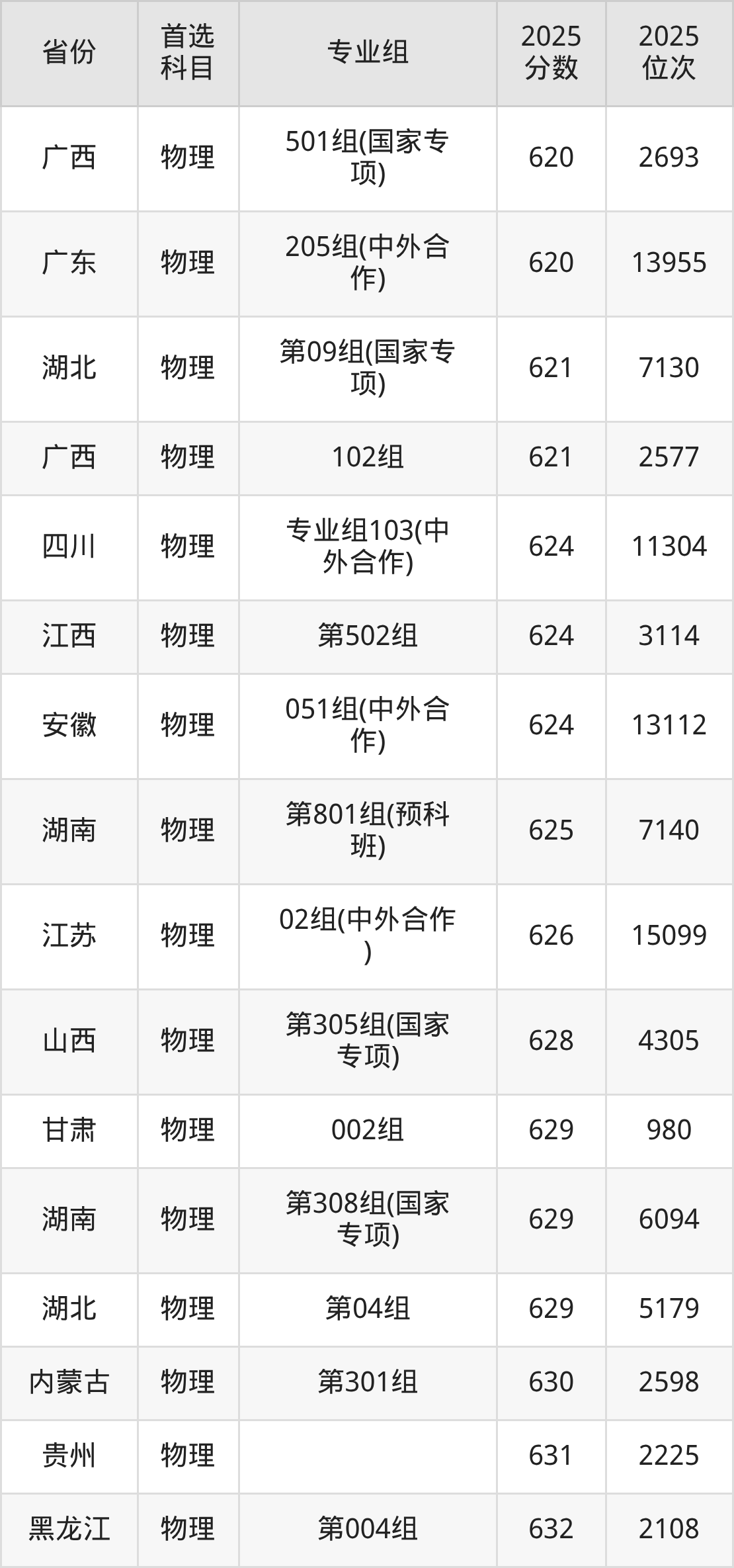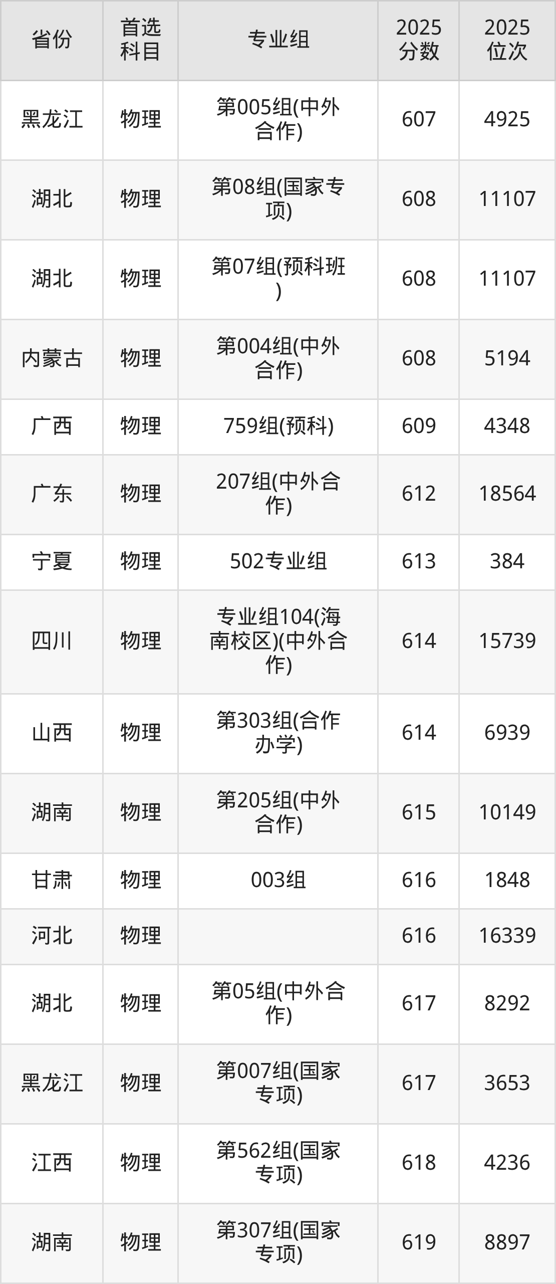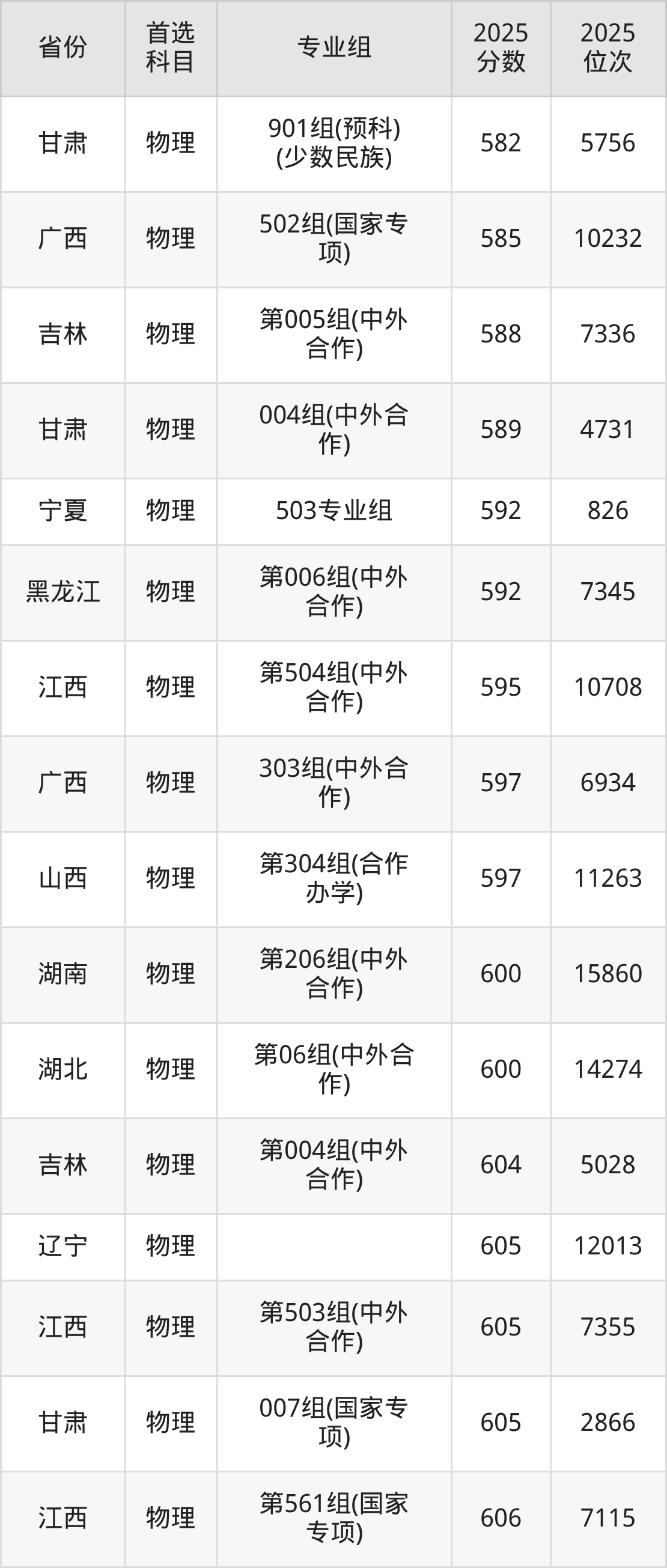 01组637分、4989名,02组663分、1882名,03组651分、3101名,04组(中外合办)641分、4368名,05组(中外合办)628分、6399名;