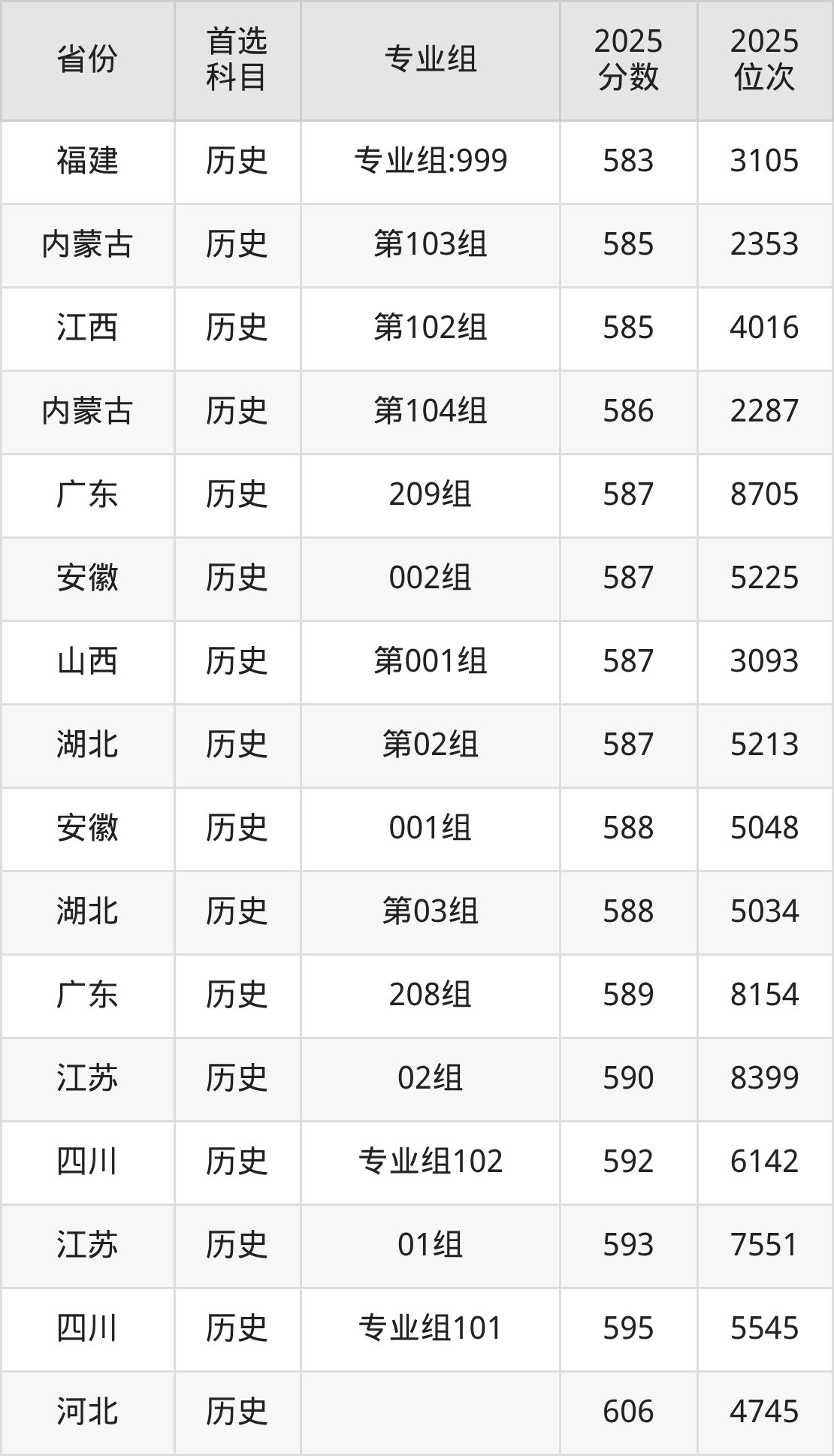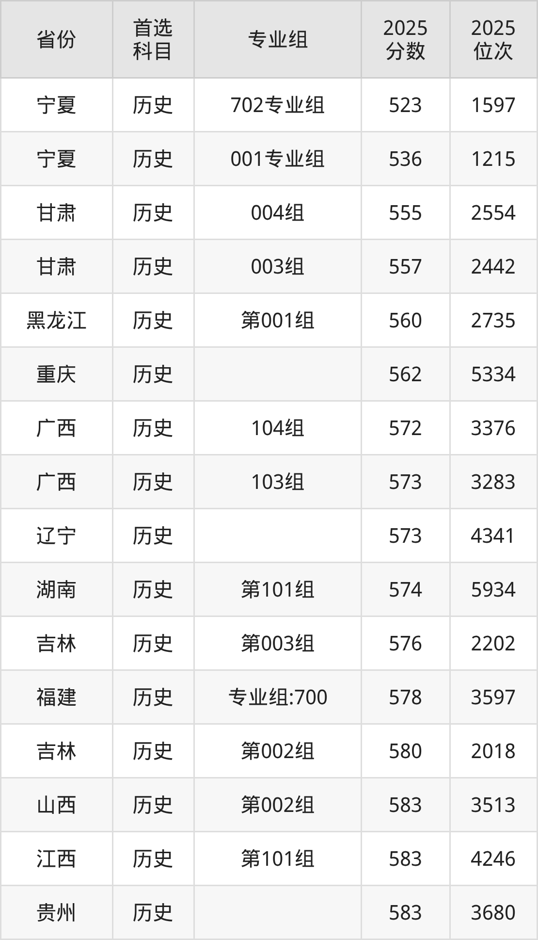 历史类最低分对应地区为宁夏(702专业组),录取位次为1597,超本科B119分;最高分对应地区为河北,录取位次为4745,超本科线129分。