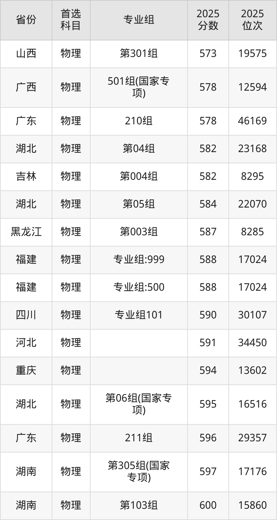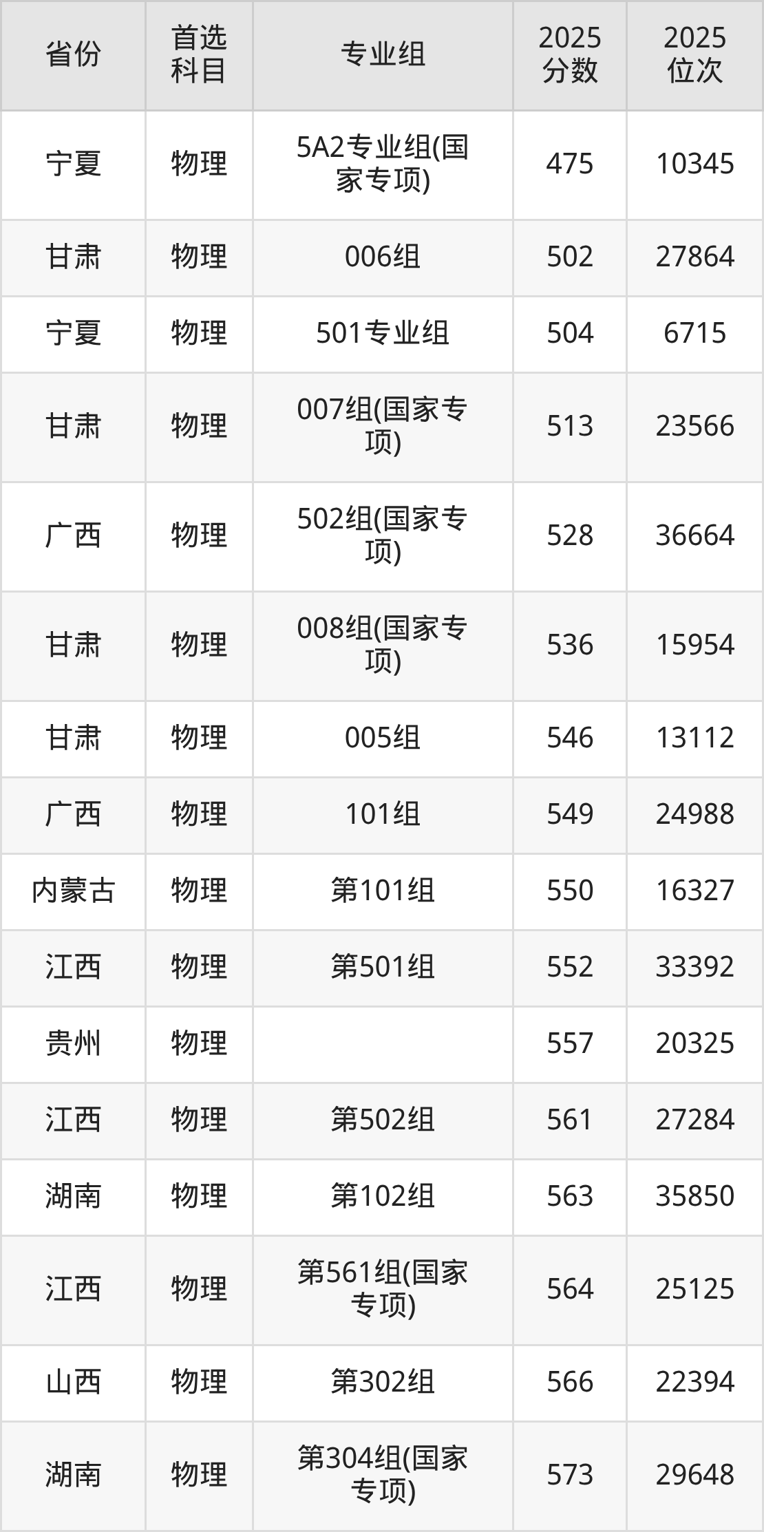 物理类最低分对应地区为宁夏(5A2专业组(国家专项)),录取位次为10345,超本科B103分;最高分对应地区为江苏(03组),录取位次为20349,超本科线155分。