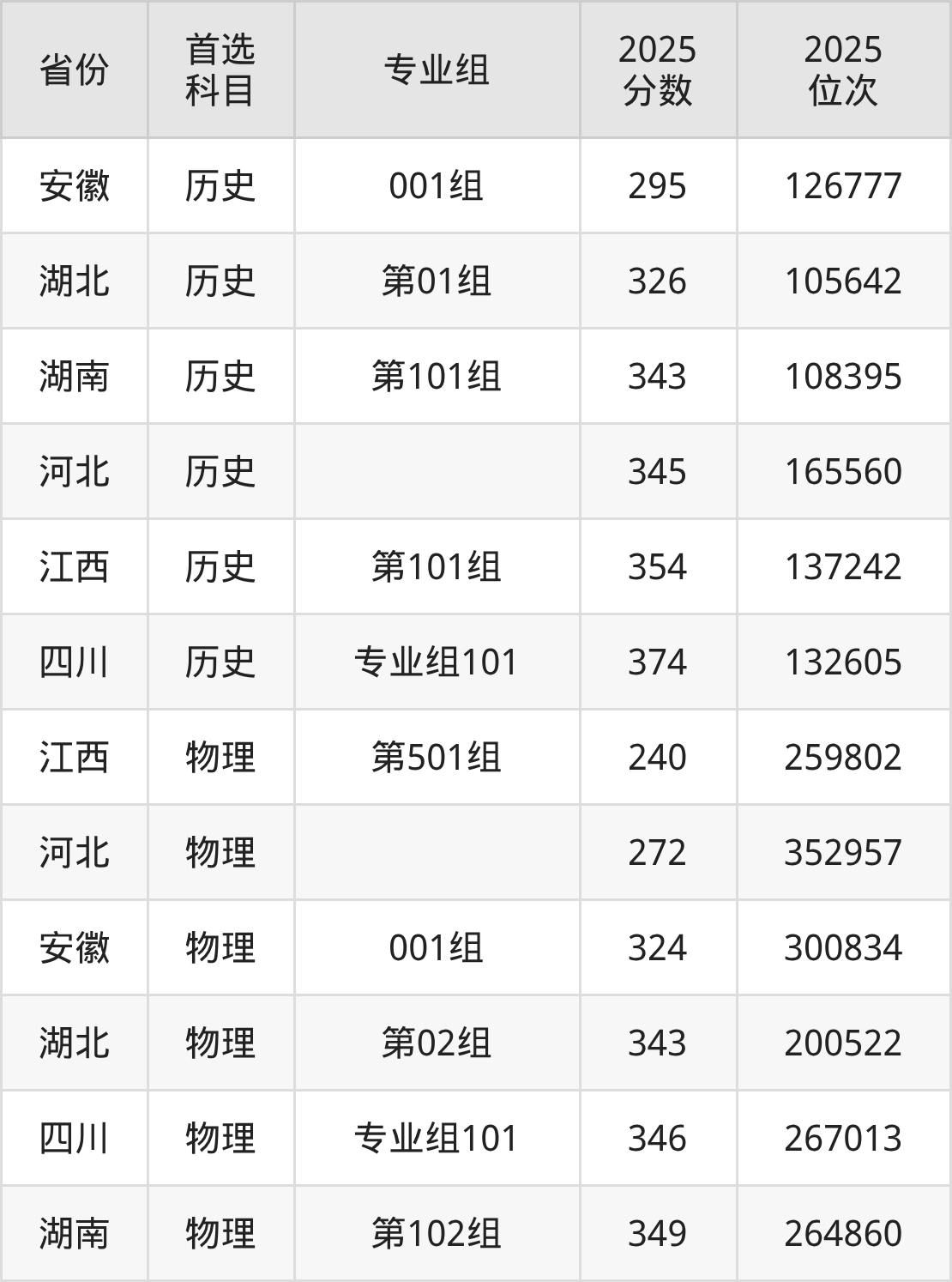 历史类最低分对应地区为安徽(001组),录取位次为126777,超专科线95分;最高分对应地区为四川(专业组101),录取位次为132605,超专科线224分。