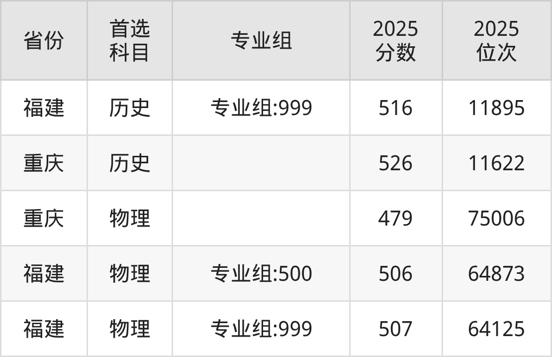历史类最低分对应地区为福建(专业组:999),录取位次为11895,超本科线66分;最高分对应地区为重庆,录取位次为11622,超本科线88分。