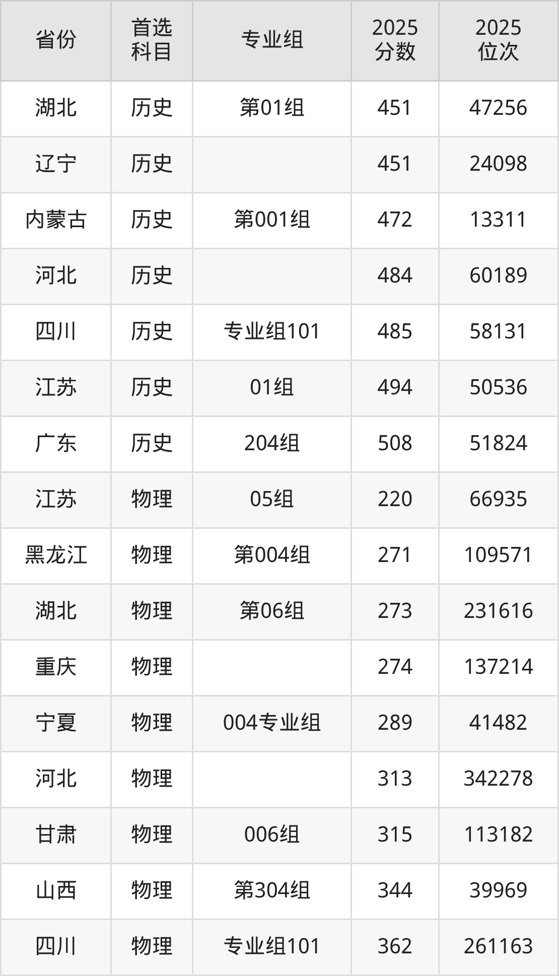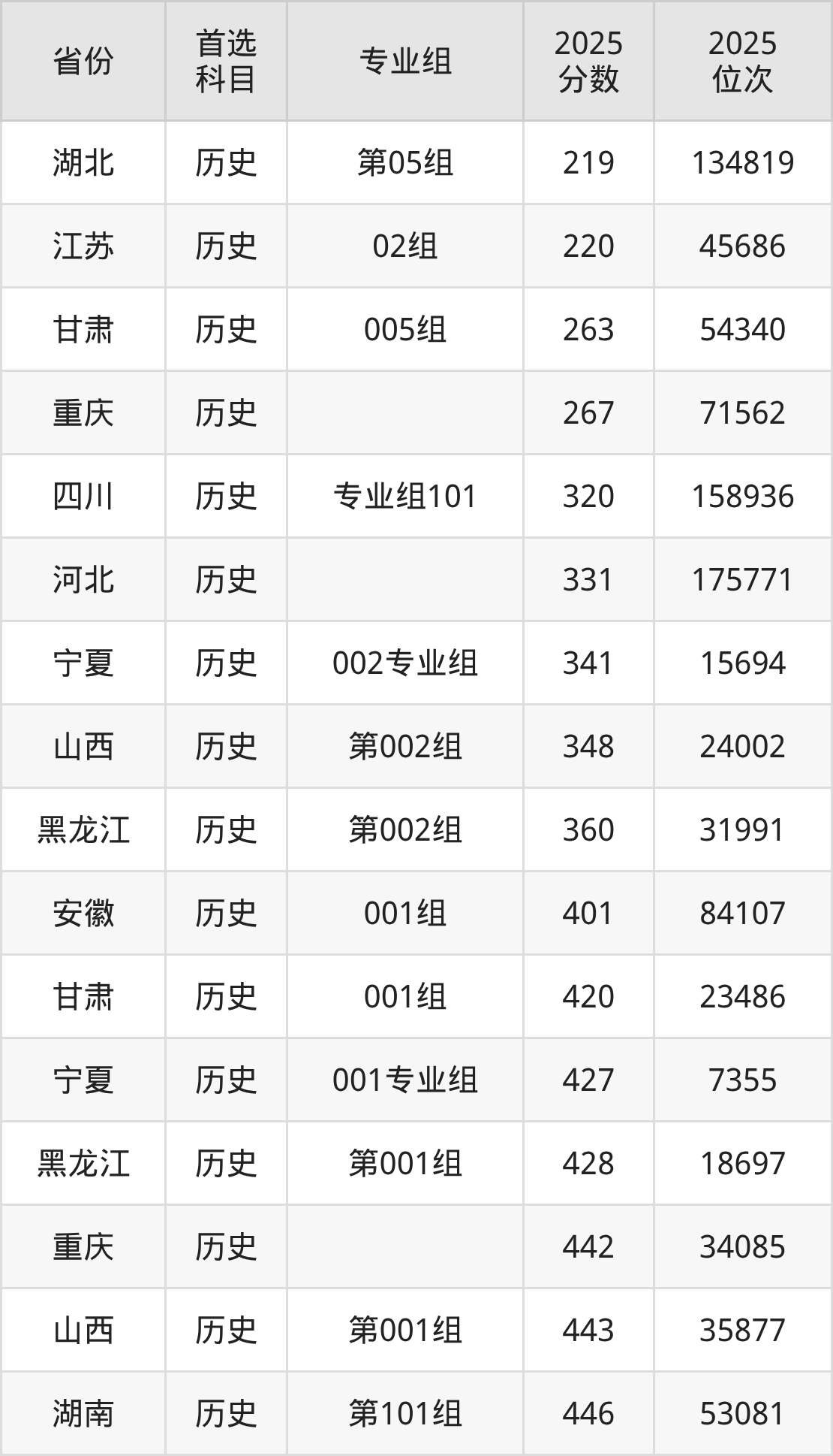 历史类最低分对应地区为湖北(第05组),录取位次为134819,超专科线19分;最高分对应地区为广东(204组),录取位次为51824,超本科线44分。