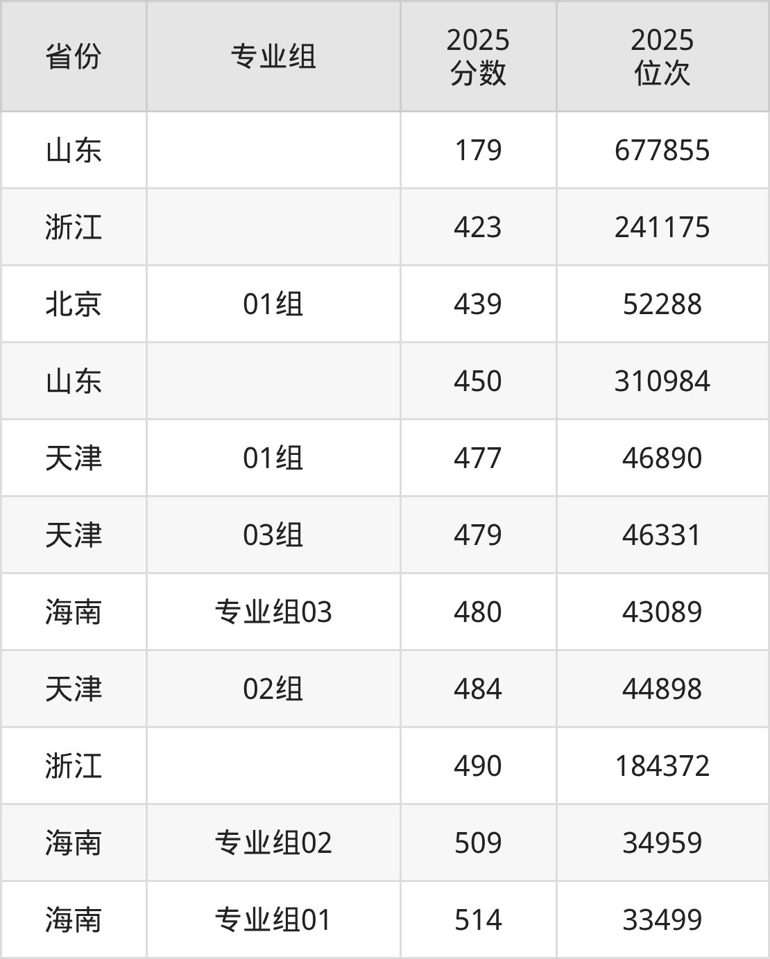 最低分对应地区为山东,录取位次为677855,超二段线29分;最高分对应地区为海南(专业组01),录取位次为33499,超本科线34分。