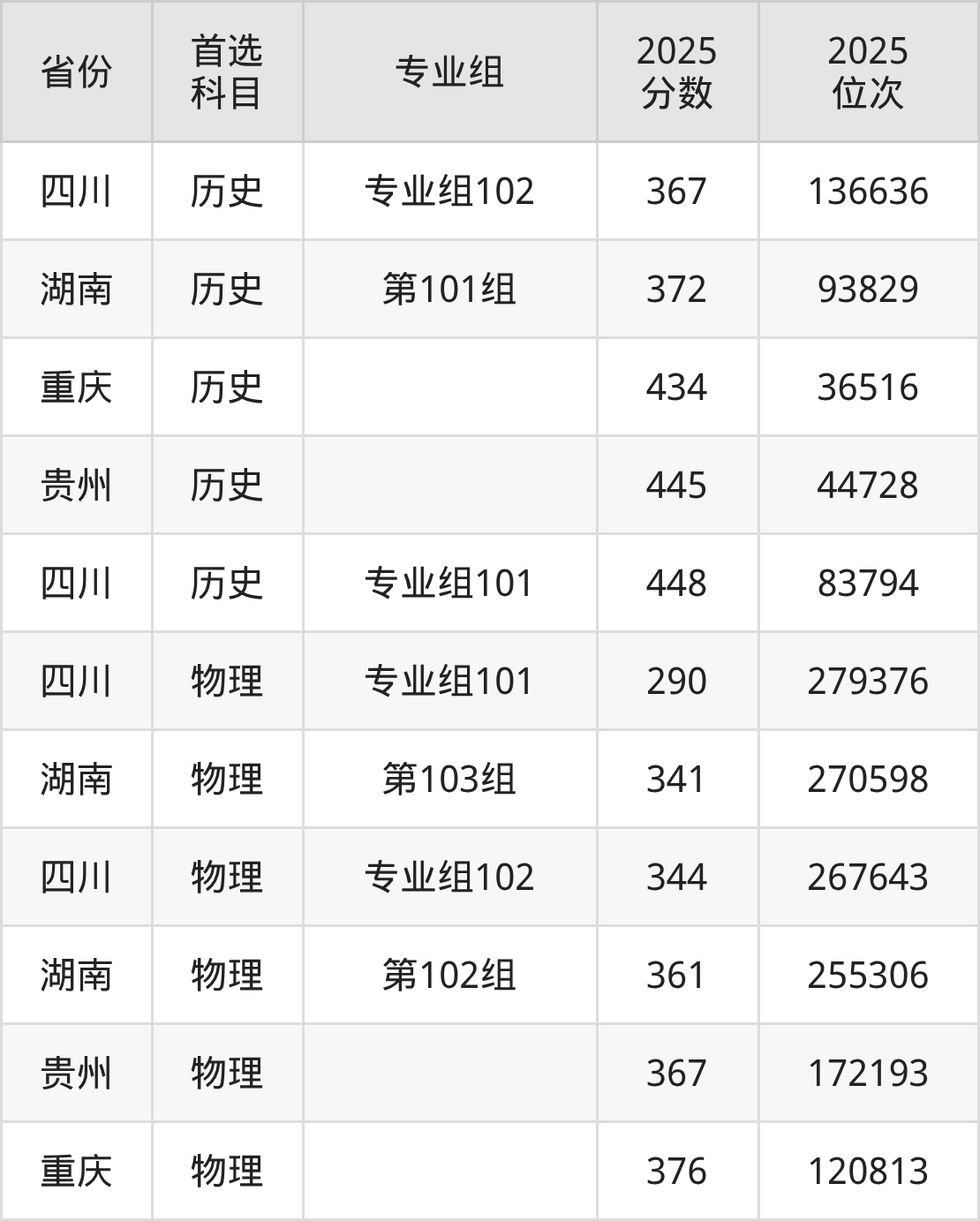 物理类最低分对应地区为四川(专业组101),录取位次为279376;最高分对应地区为重庆,录取位次为120813,超专科线196分。