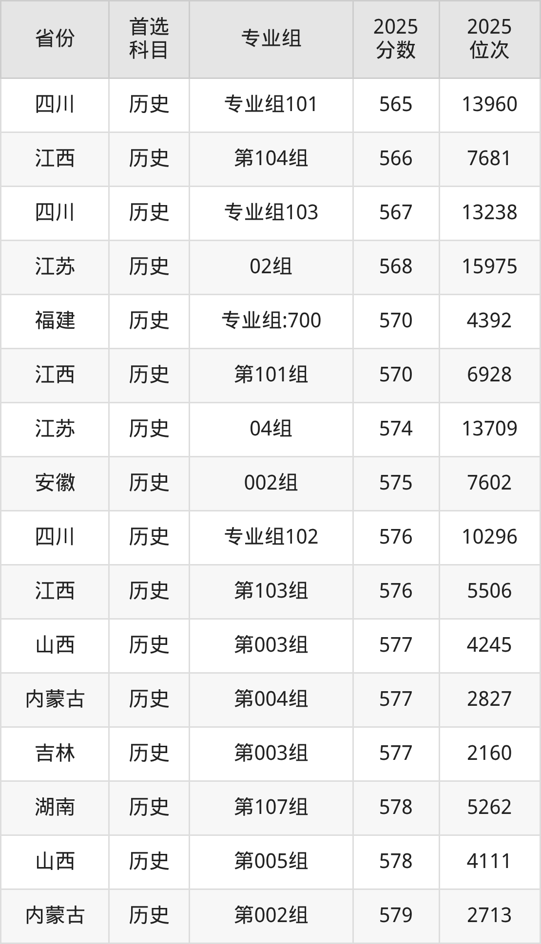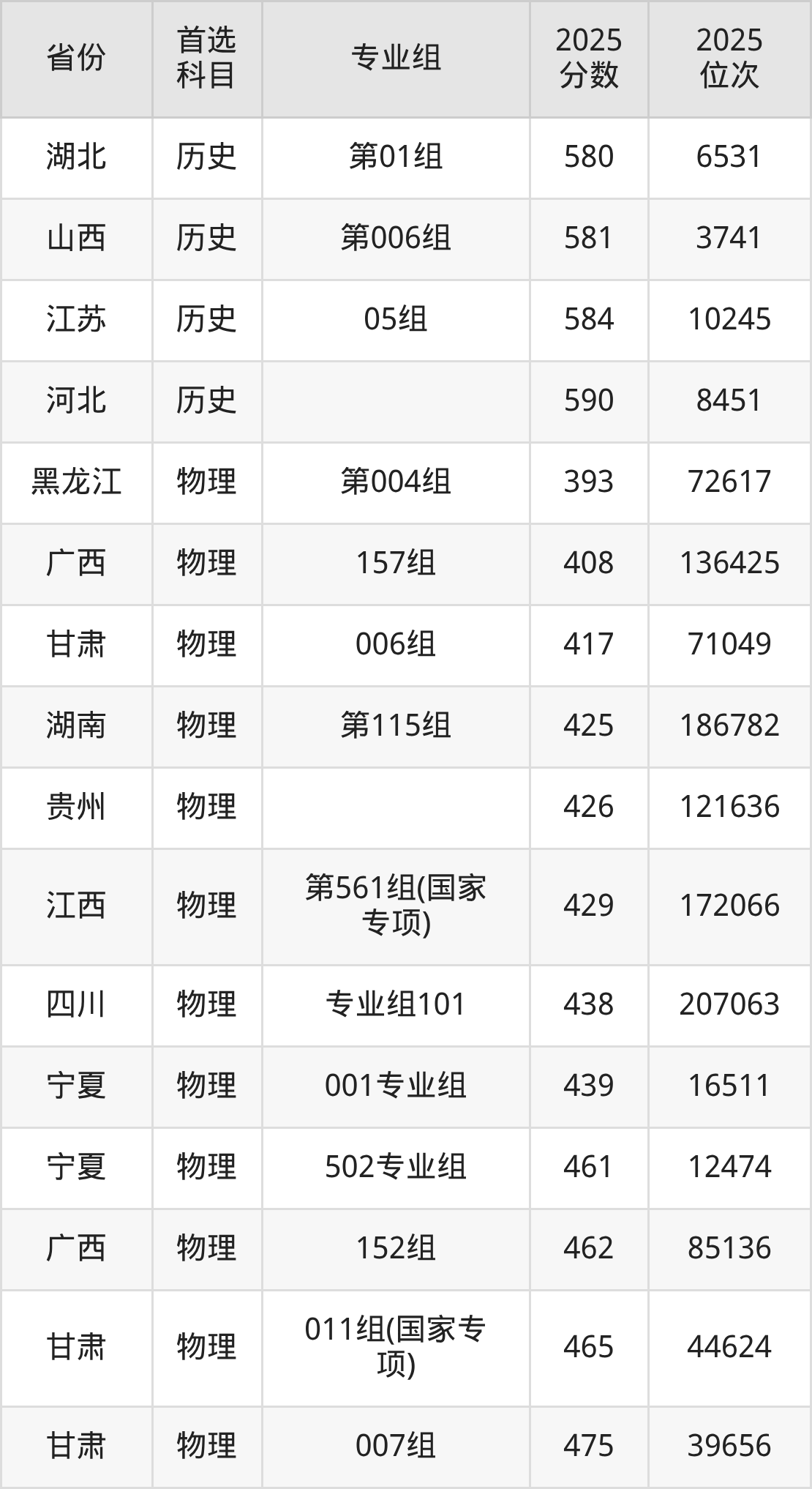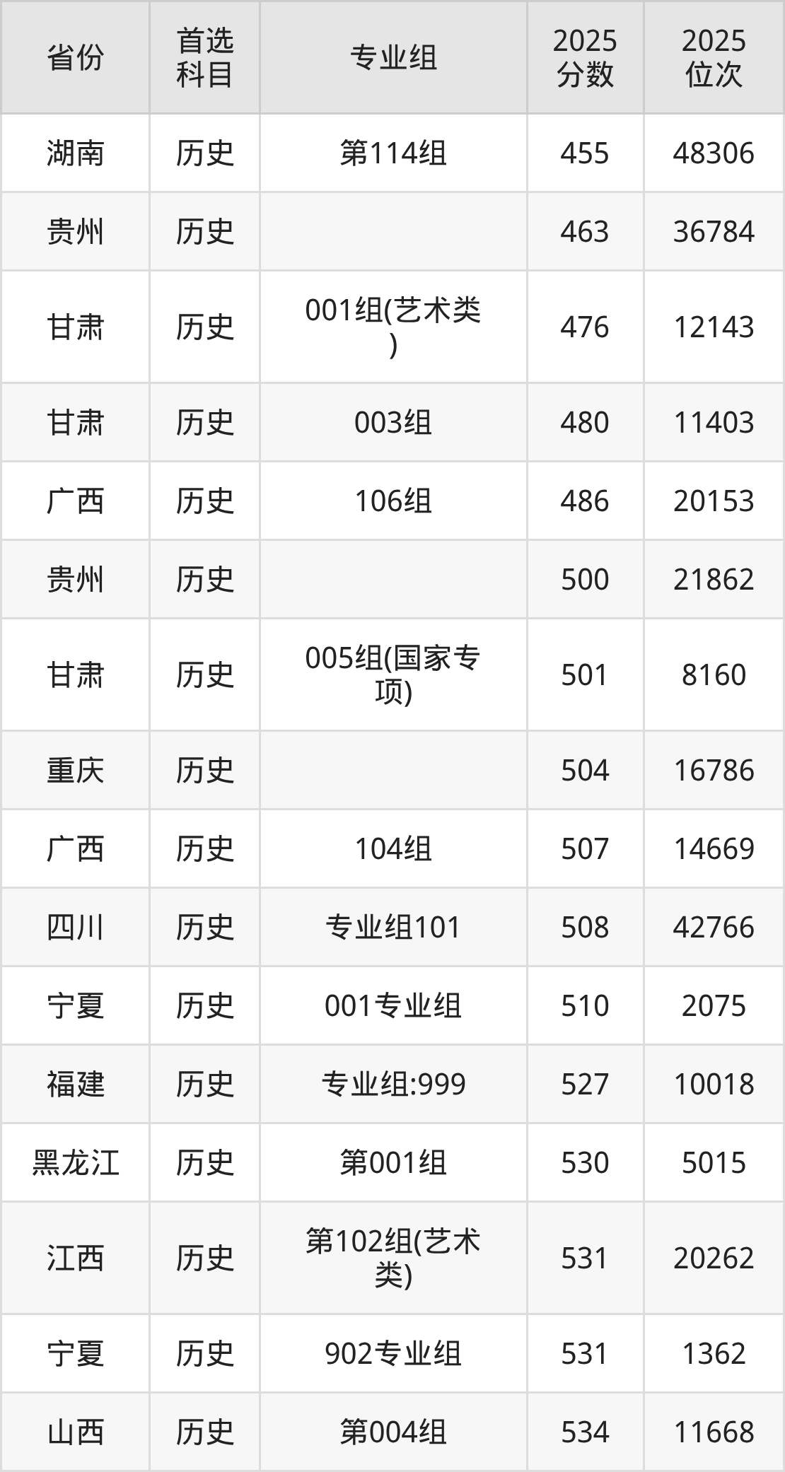 历史类最低分对应地区为湖南(第114组),录取位次为48306,超专科线255分;最高分对应地区为河北,录取位次为8451,超本科线113分。