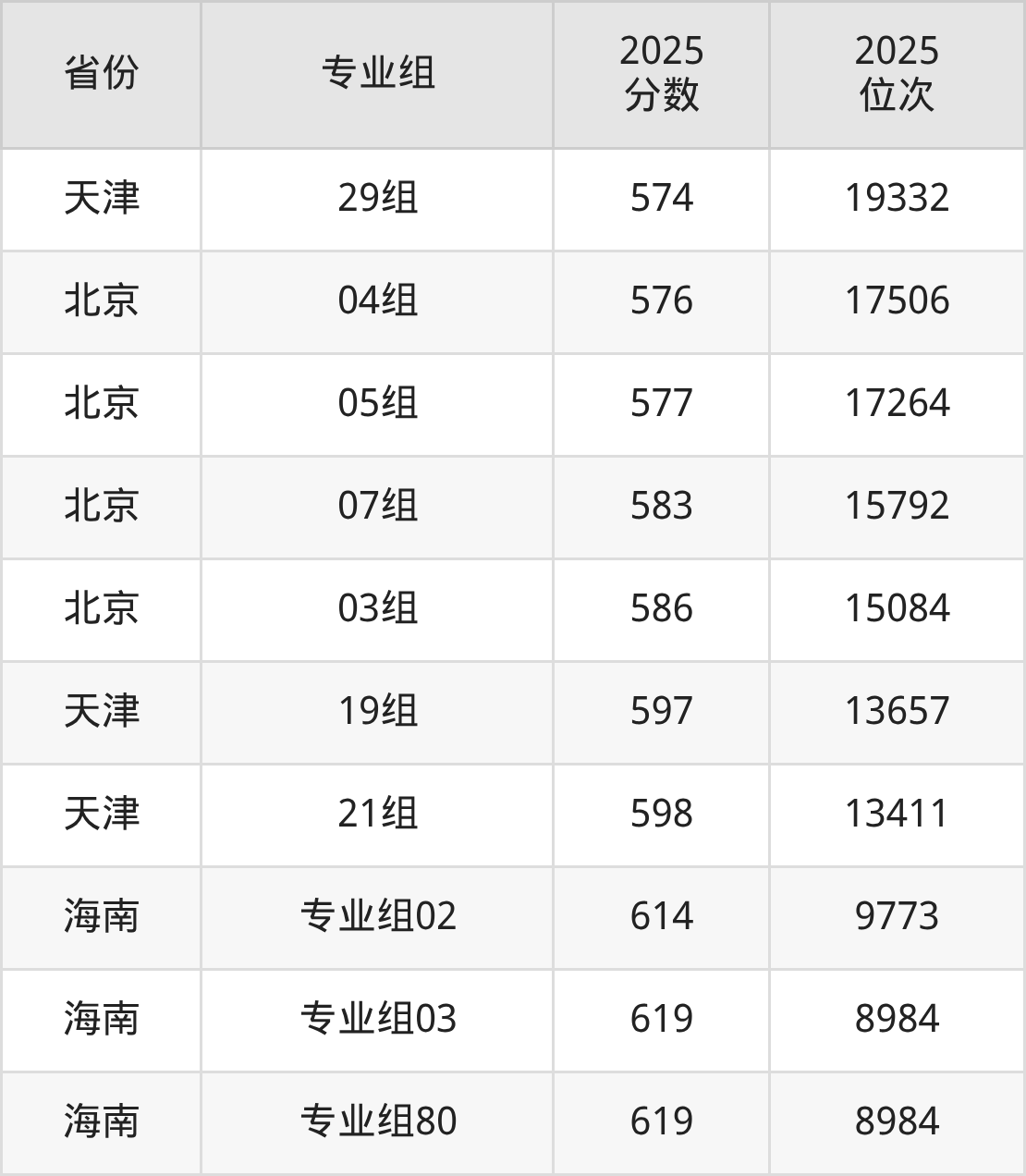 最低分对应地区为浙江,录取位次为172393;最高分对应地区为海南(专业组80),录取位次为8984,超本科线139分。