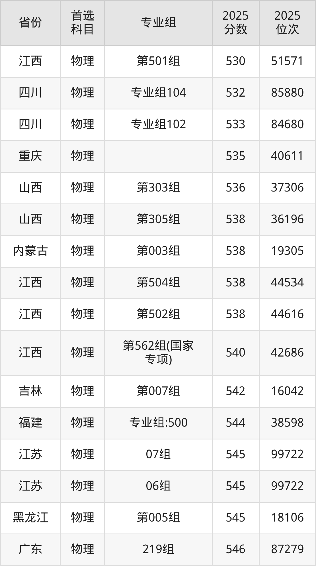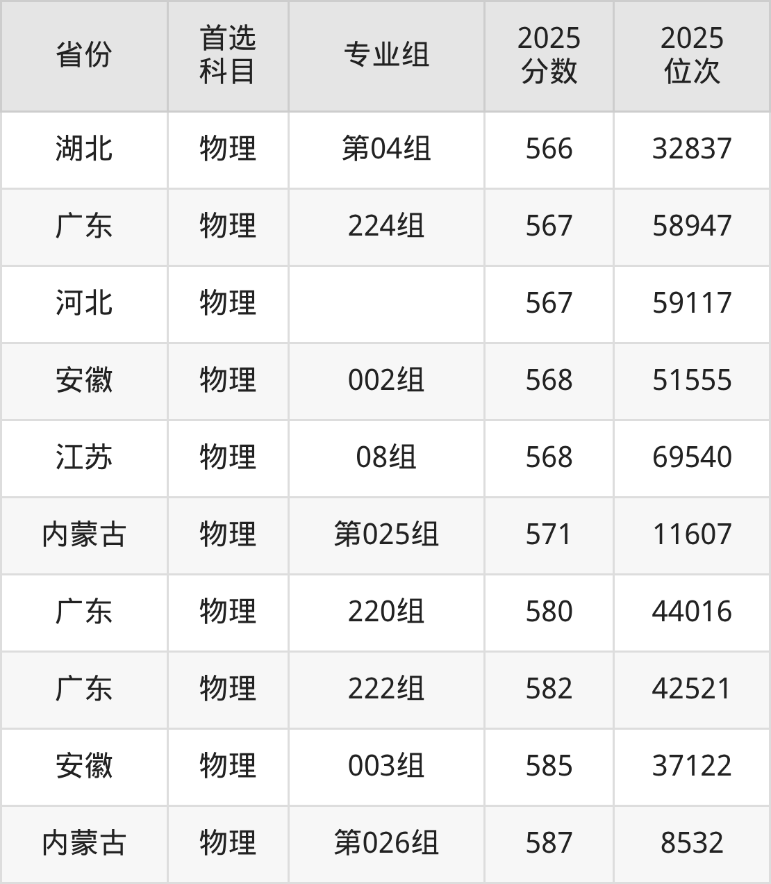 物理类最低分对应地区为黑龙江(第004组),录取位次为72617,超本科线33分;最高分对应地区为内蒙古(第026组),录取位次为8532,超本科线212分。