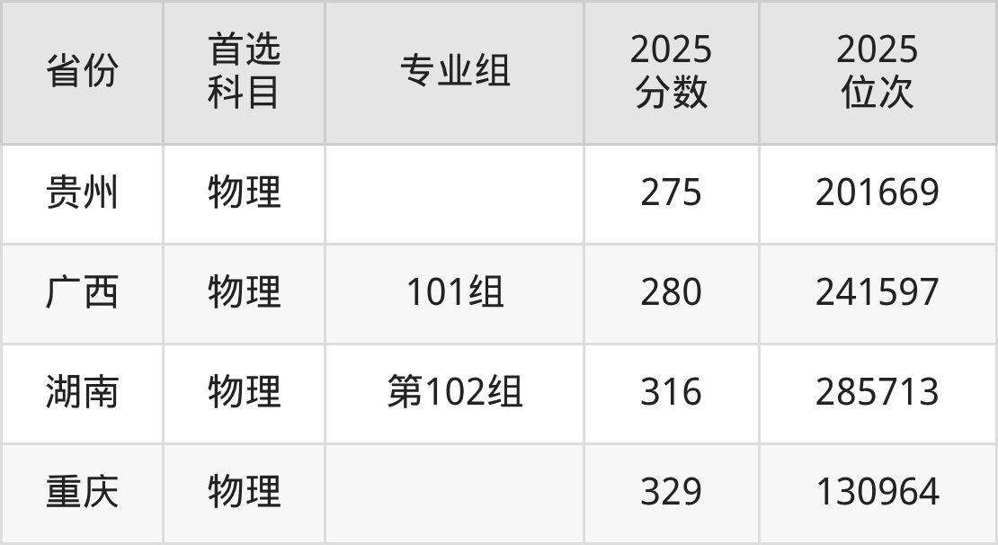 物理类最低分对应地区为甘肃(001组),录取位次为120677;最高分对应地区为重庆,录取位次为130964,超专科线149分。