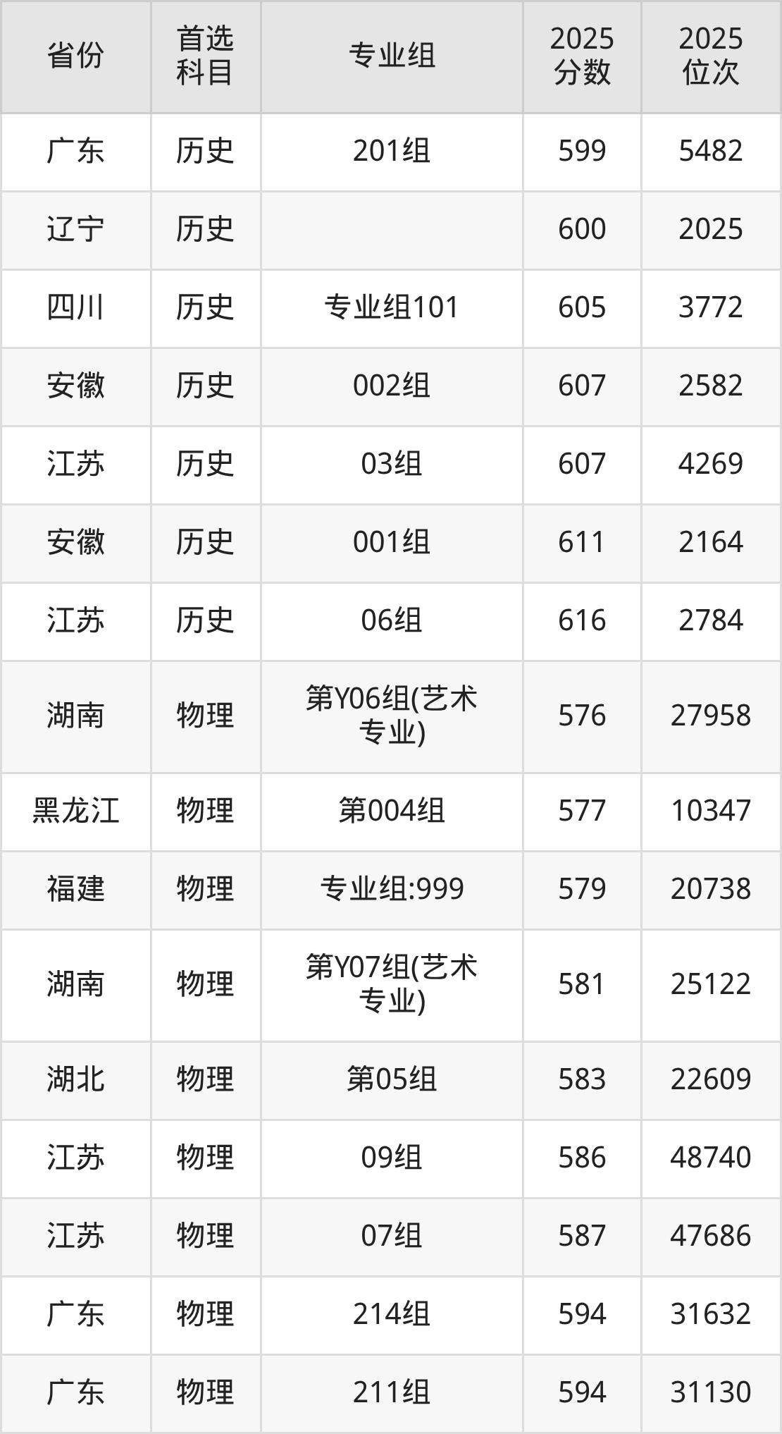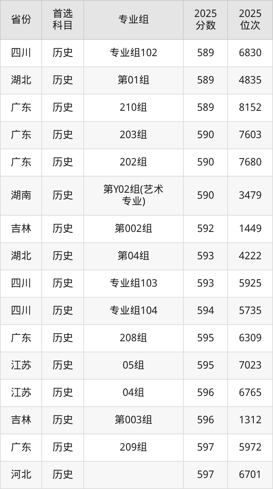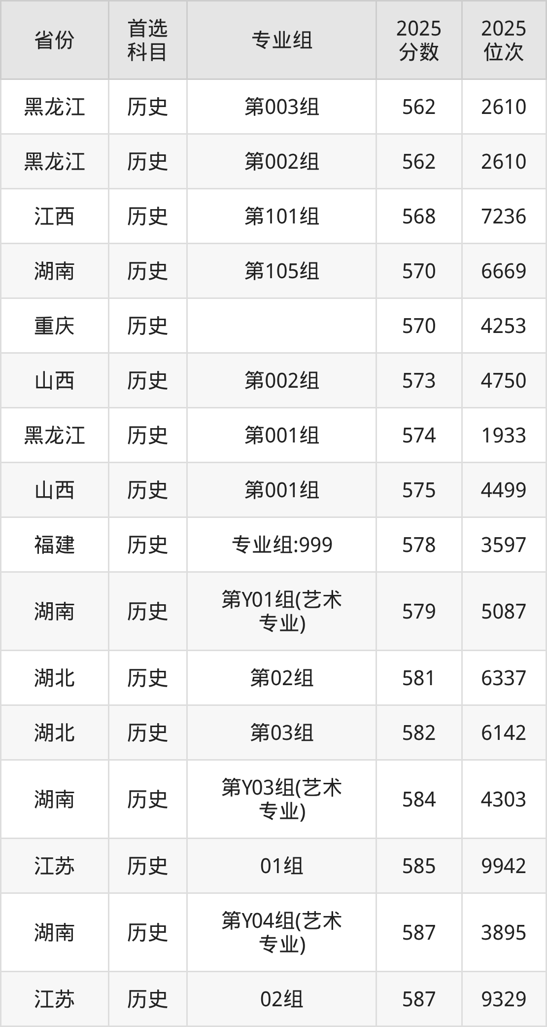 历史类最低分对应地区为黑龙江(第003组),录取位次为2610,超本科线157分;最高分对应地区为江苏(06组),录取位次为2784,超本科线134分。