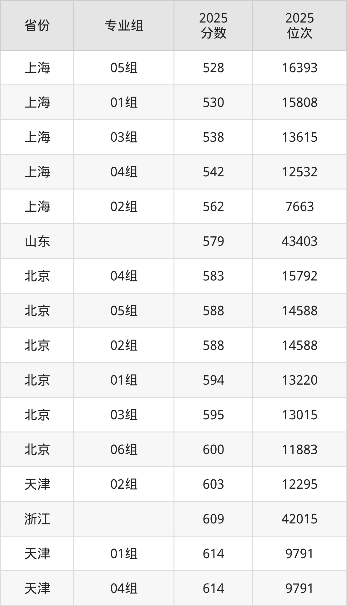 最低分对应地区为上海(05组),录取位次为16393,超本科线126分;最高分对应地区为天津(04组),录取位次为9791,超本科线138分。
