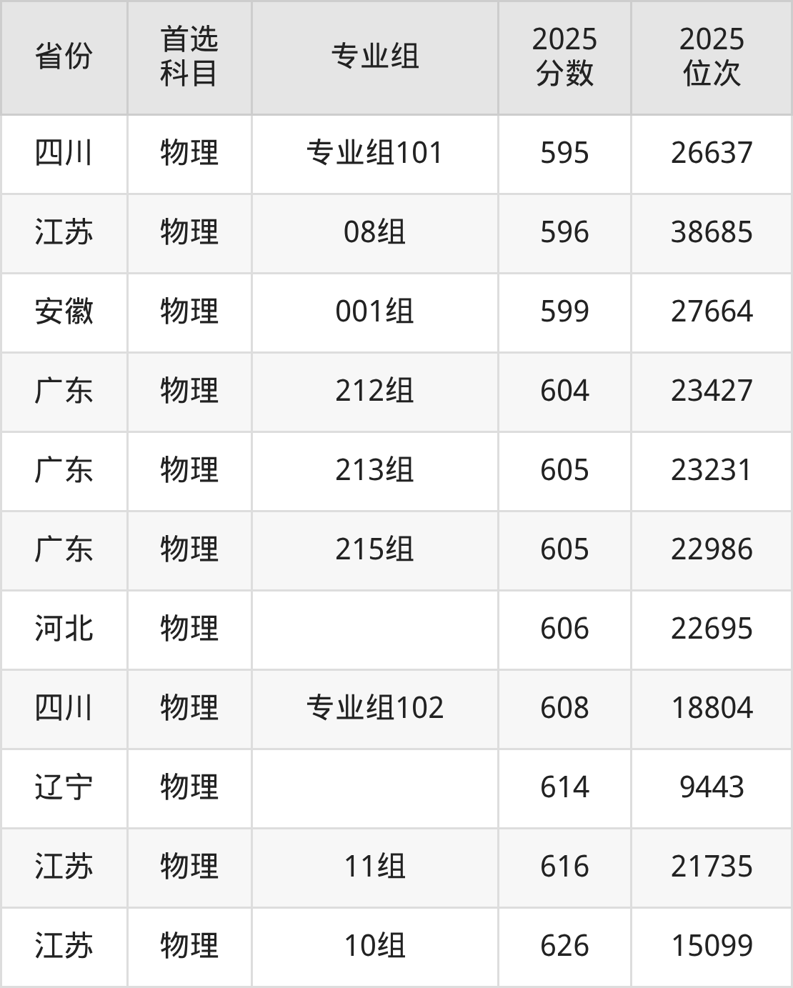 物理类最低分对应地区为湖南(第Y06组(艺术专业)),录取位次为27958,超本科线171分;最高分对应地区为江苏(10组),录取位次为15099,超本科线163分。