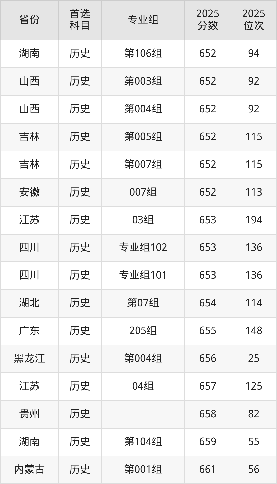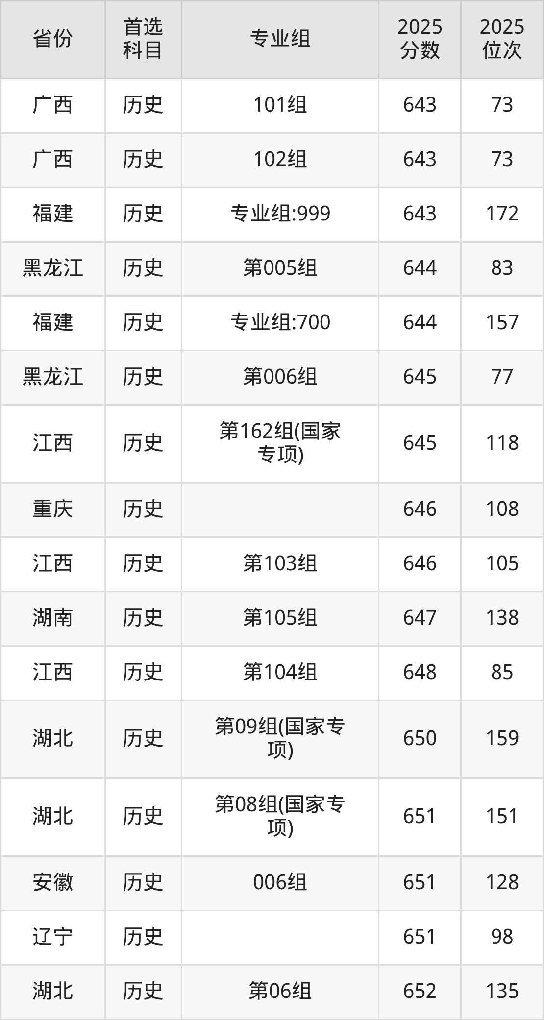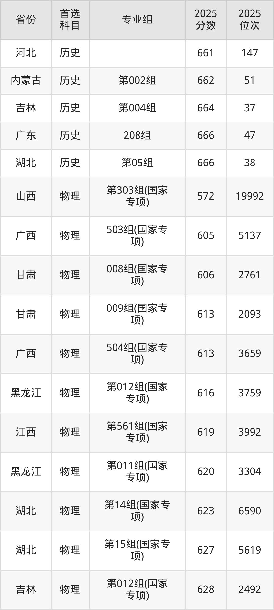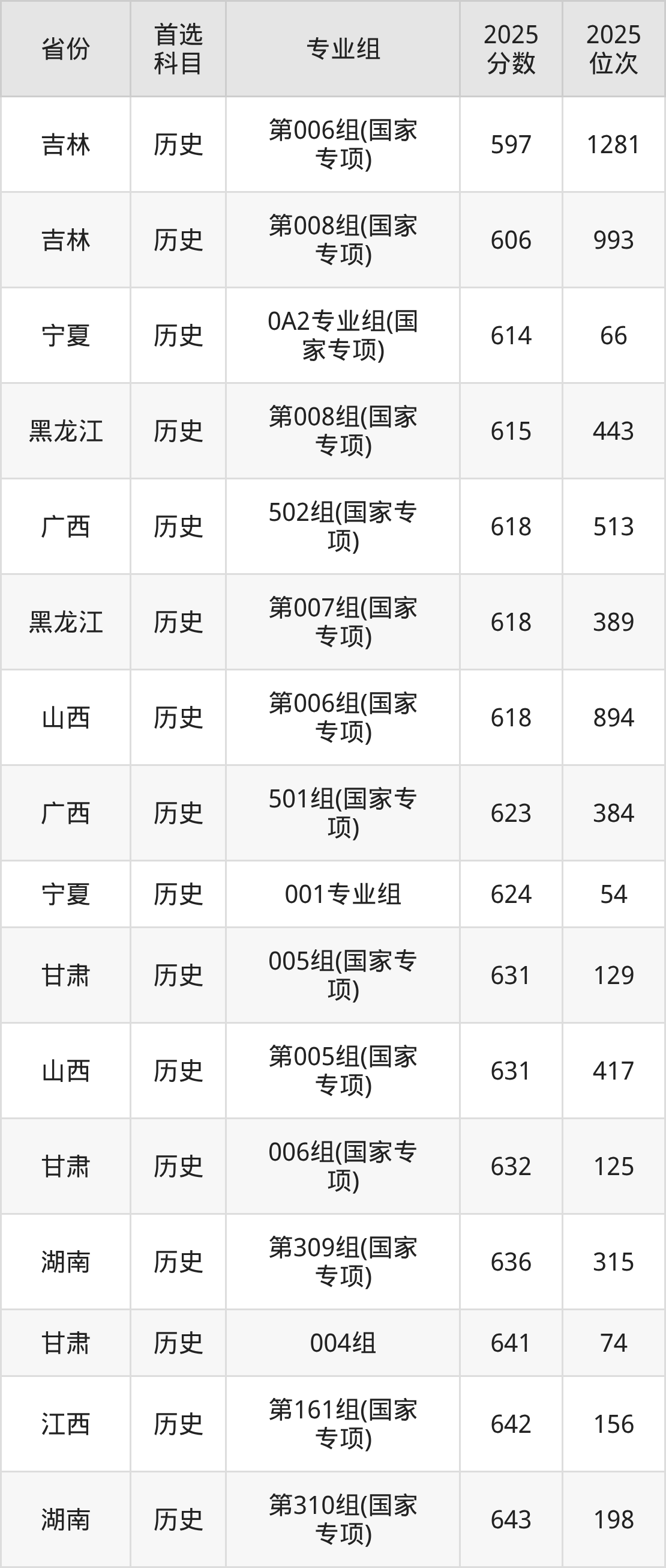 历史类最低分对应地区为吉林(第006组(国家专项)),录取位次为1281,超本科线213分;最高分对应地区为湖北(第05组),录取位次为38,超本科线224分。
