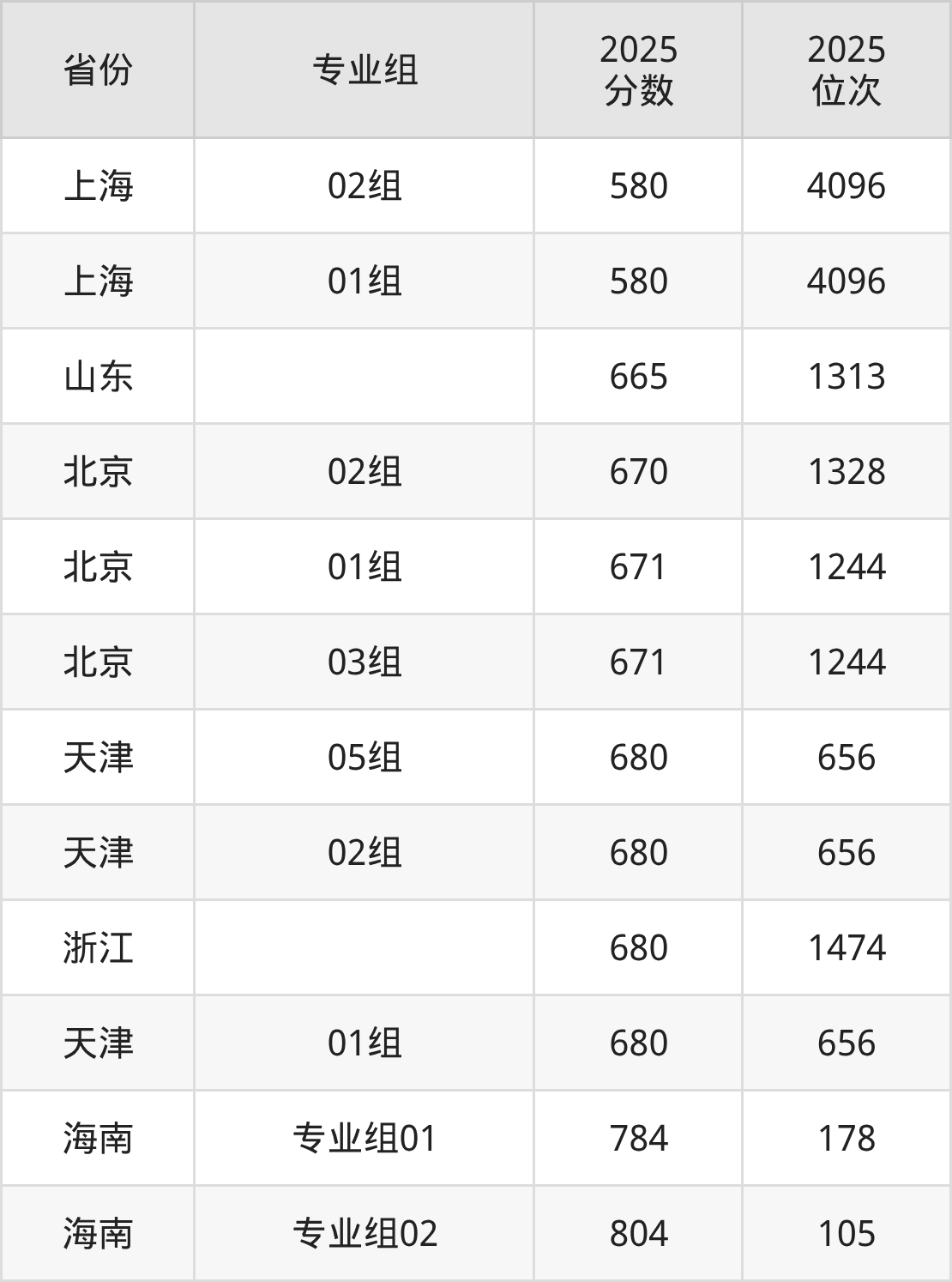 最低分对应地区为上海(02组),录取位次为4096,超本科线178分;最高分对应地区为海南(专业组02),录取位次为105,超本科线324分。