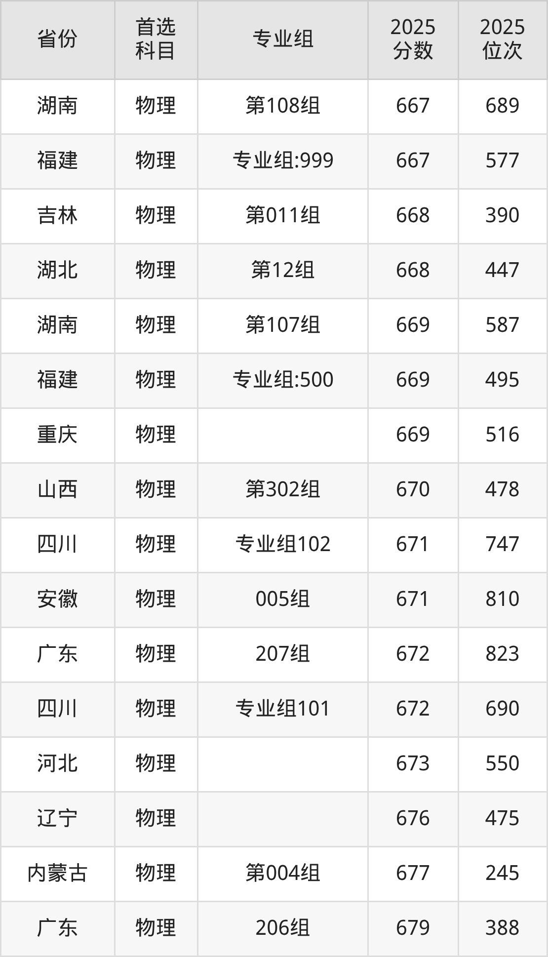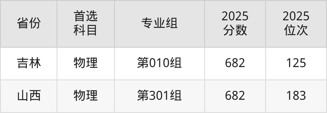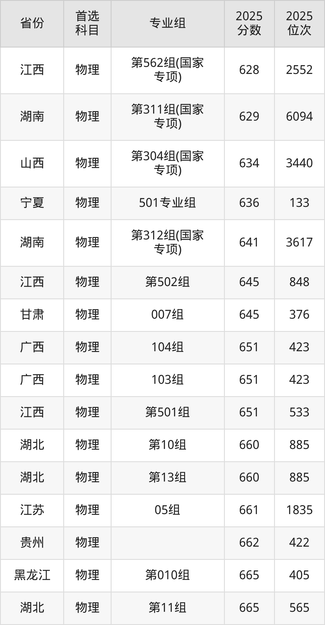 物理类最低分对应地区为山西(第303组(国家专项)),录取位次为19992,超本科线153分;最高分对应地区为山西(第301组),录取位次为183,超本科线263分。