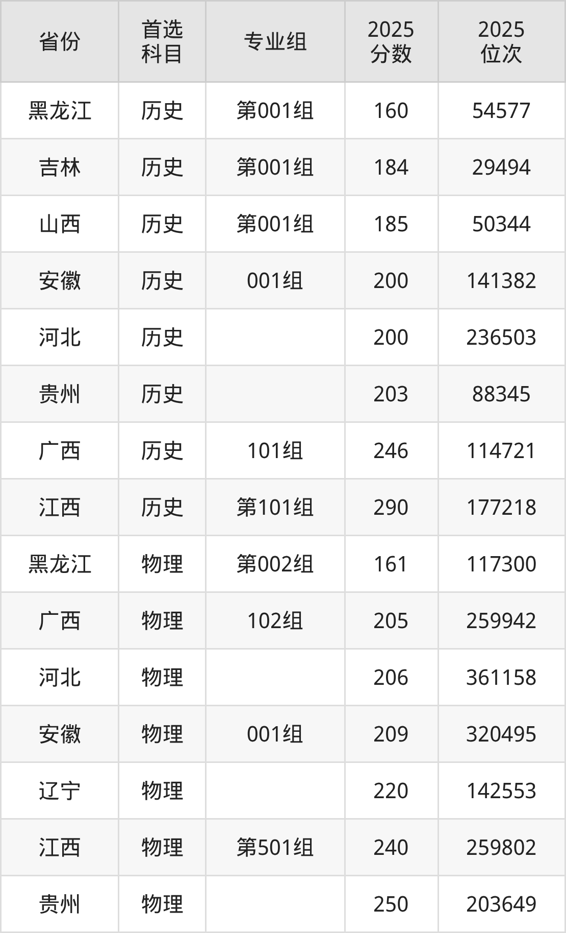 历史类最低分对应地区为黑龙江(第001组),录取位次为54577;最高分对应地区为江西(第101组),录取位次为177218。