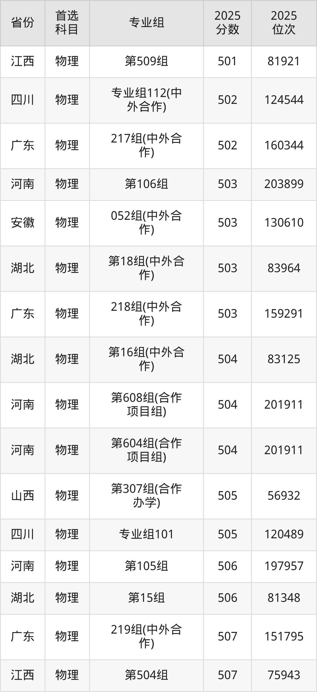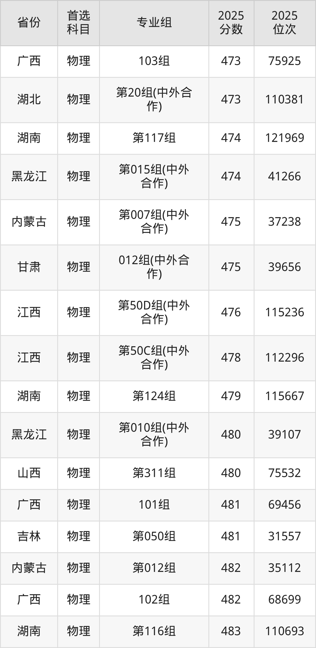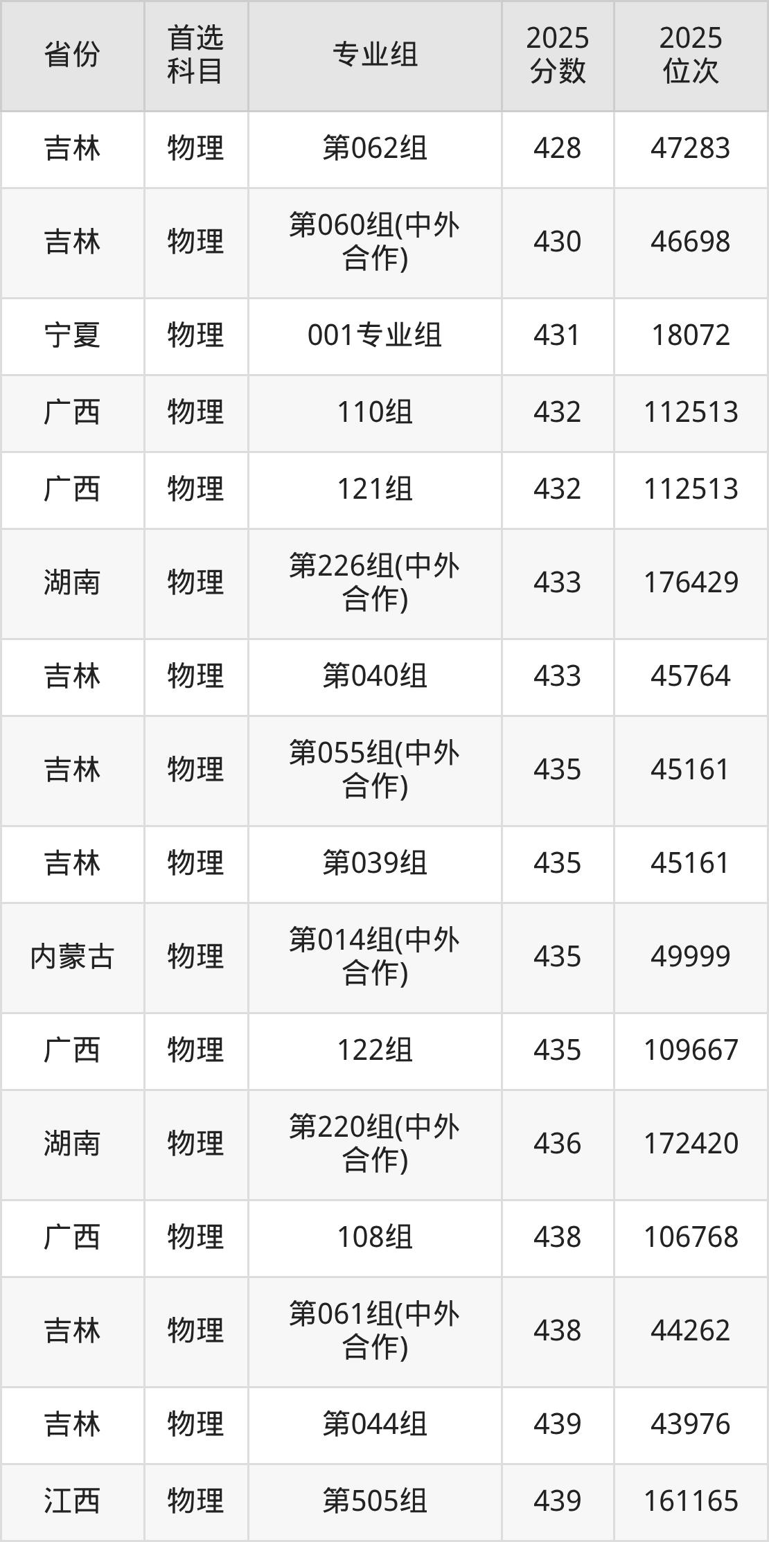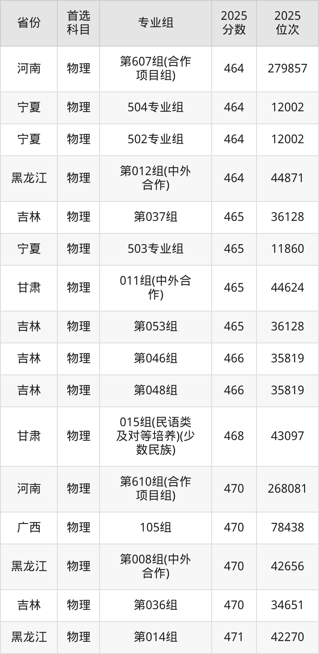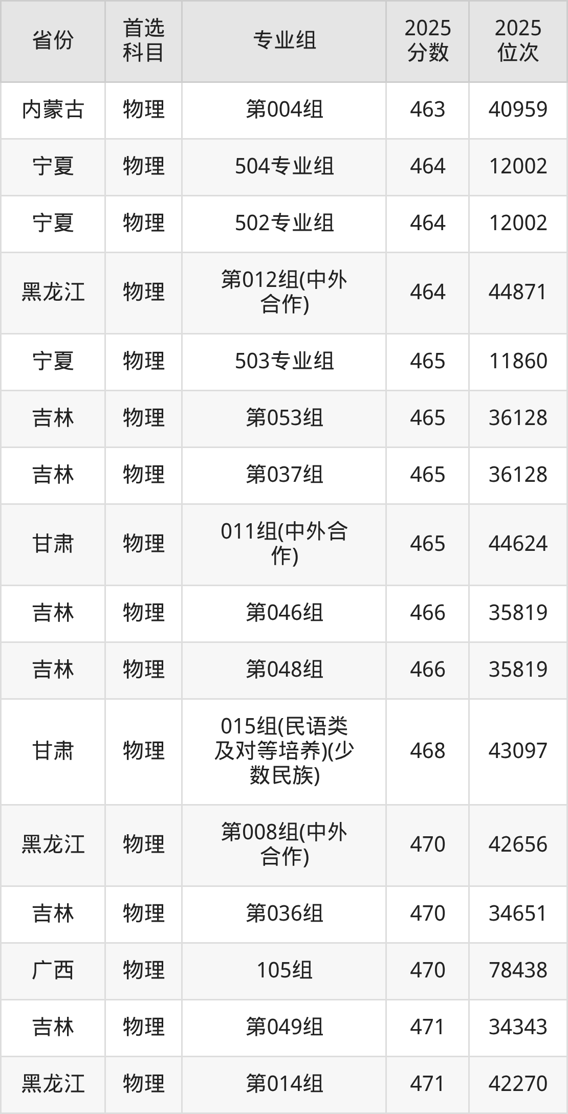 物理类:第030组399分、55692名,第031组371分、63014名,第032组449分、40957名,第033组369分、63497名,第034组461分、37266名,第035组463分、36686名,第036组470分、34651名,第037组465分、36128名,第038组452分、39998名,第039组435分、45161名,第040组433分、45764名,第041组443分、42786名,第042组439分、43976名,第043组511分、23366名,第044组439分、43976名,第045组416分、50809名,第046组466分、35819名,第047组420分、49638名,第048组466分、35819名,第049组471分、34343名,第050组481分、31557名,第051组489分、29318名,第052组487分、29895名,第053组465分、36128名,第054组457分、38506名,第055组(中外合作)435分、45161名,第056组(中外合作)408分、53213名,第057组(中外合作)403分、54576名,第058组(中外合作)444分、42482名,第059组(中外合作)396分、56505名,第060组(中外合作)430分、46698名,第061组(中外合作)438分、44262名,第062组428分、47283名;