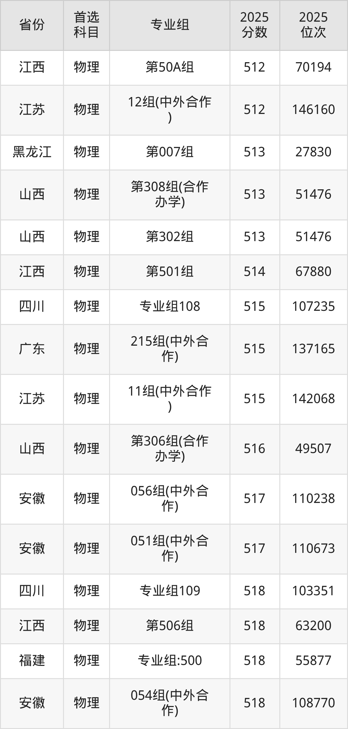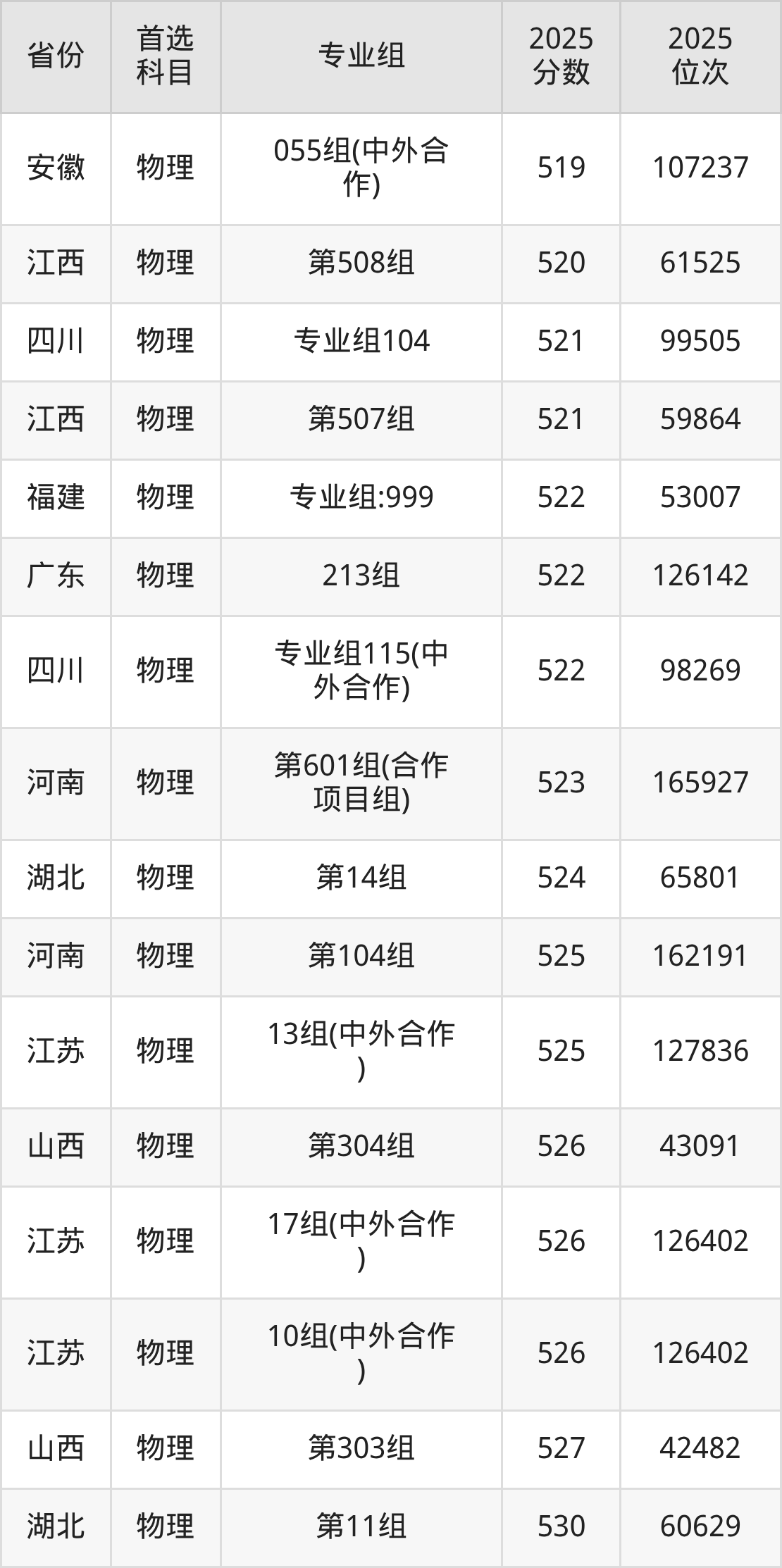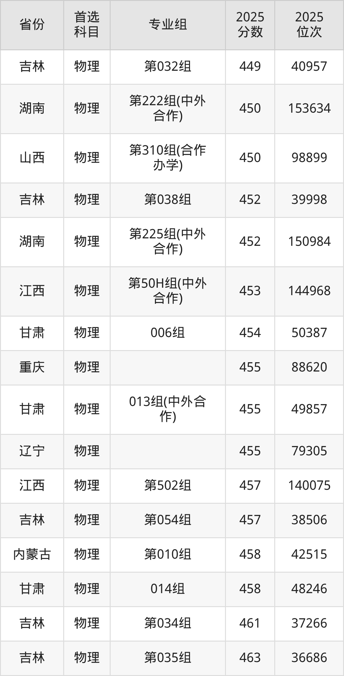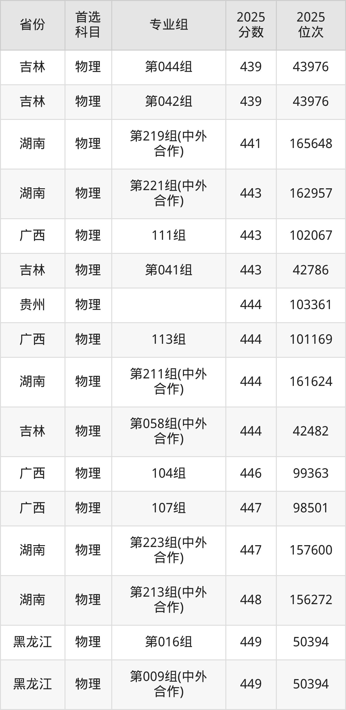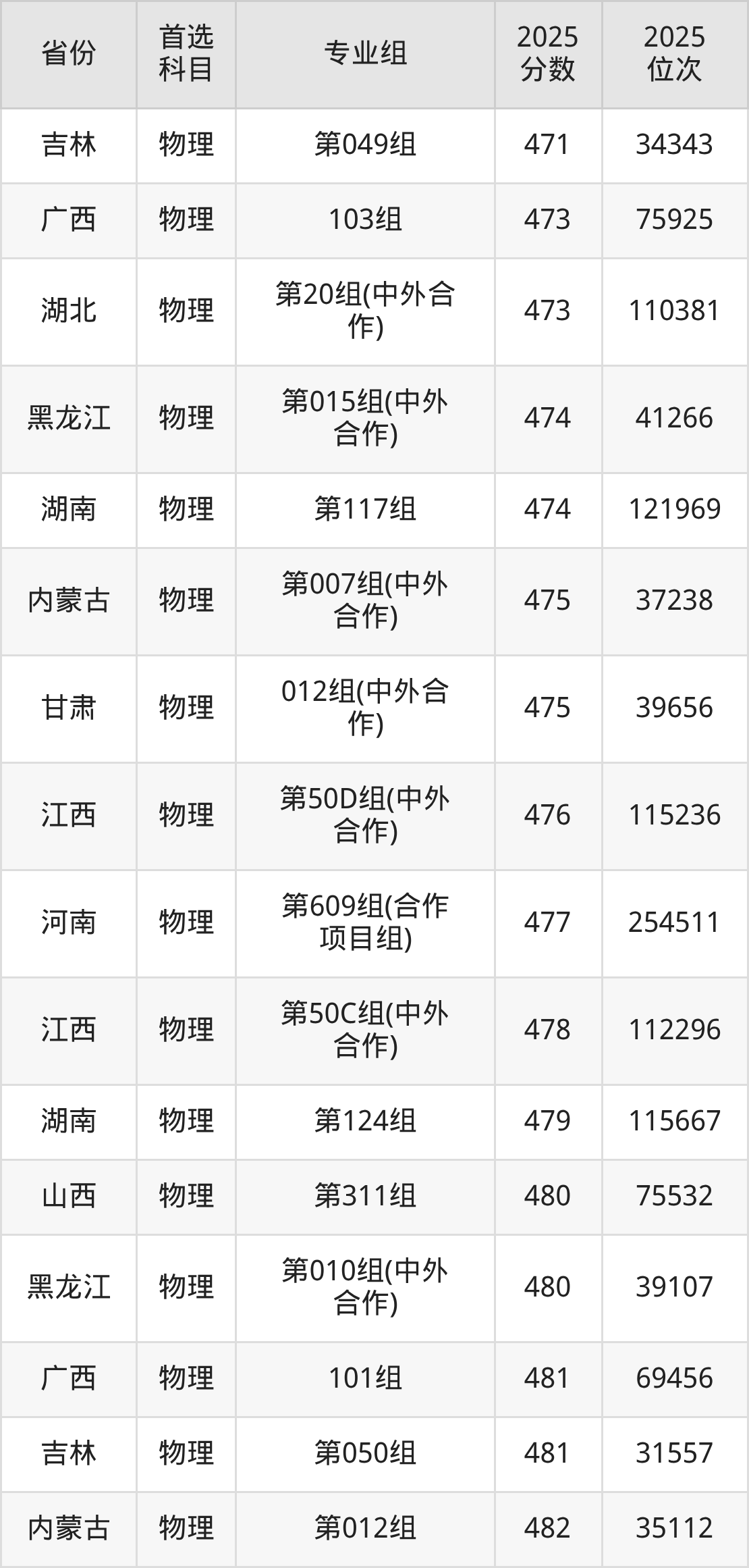 物理类:第030组399分、55692名,第031组371分、63014名,第032组449分、40957名,第033组369分、63497名,第034组461分、37266名,第035组463分、36686名,第036组470分、34651名,第037组465分、36128名,第038组452分、39998名,第039组435分、45161名,第040组433分、45764名,第041组443分、42786名,第042组439分、43976名,第043组511分、23366名,第044组439分、43976名,第045组416分、50809名,第046组466分、35819名,第047组420分、49638名,第048组466分、35819名,第049组471分、34343名,第050组481分、31557名,第051组489分、29318名,第052组487分、29895名,第053组465分、36128名,第054组457分、38506名,第055组(中外合作)435分、45161名,第056组(中外合作)408分、53213名,第057组(中外合作)403分、54576名,第058组(中外合作)444分、42482名,第059组(中外合作)396分、56505名,第060组(中外合作)430分、46698名,第061组(中外合作)438分、44262名,第062组428分、47283名;