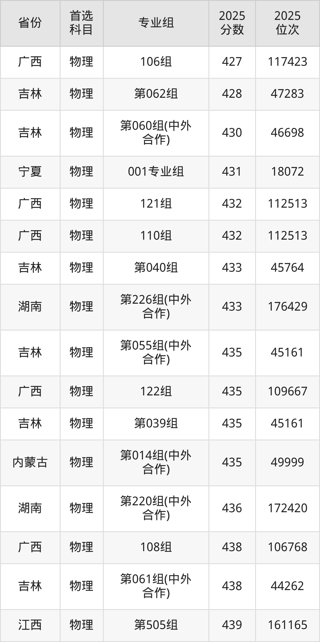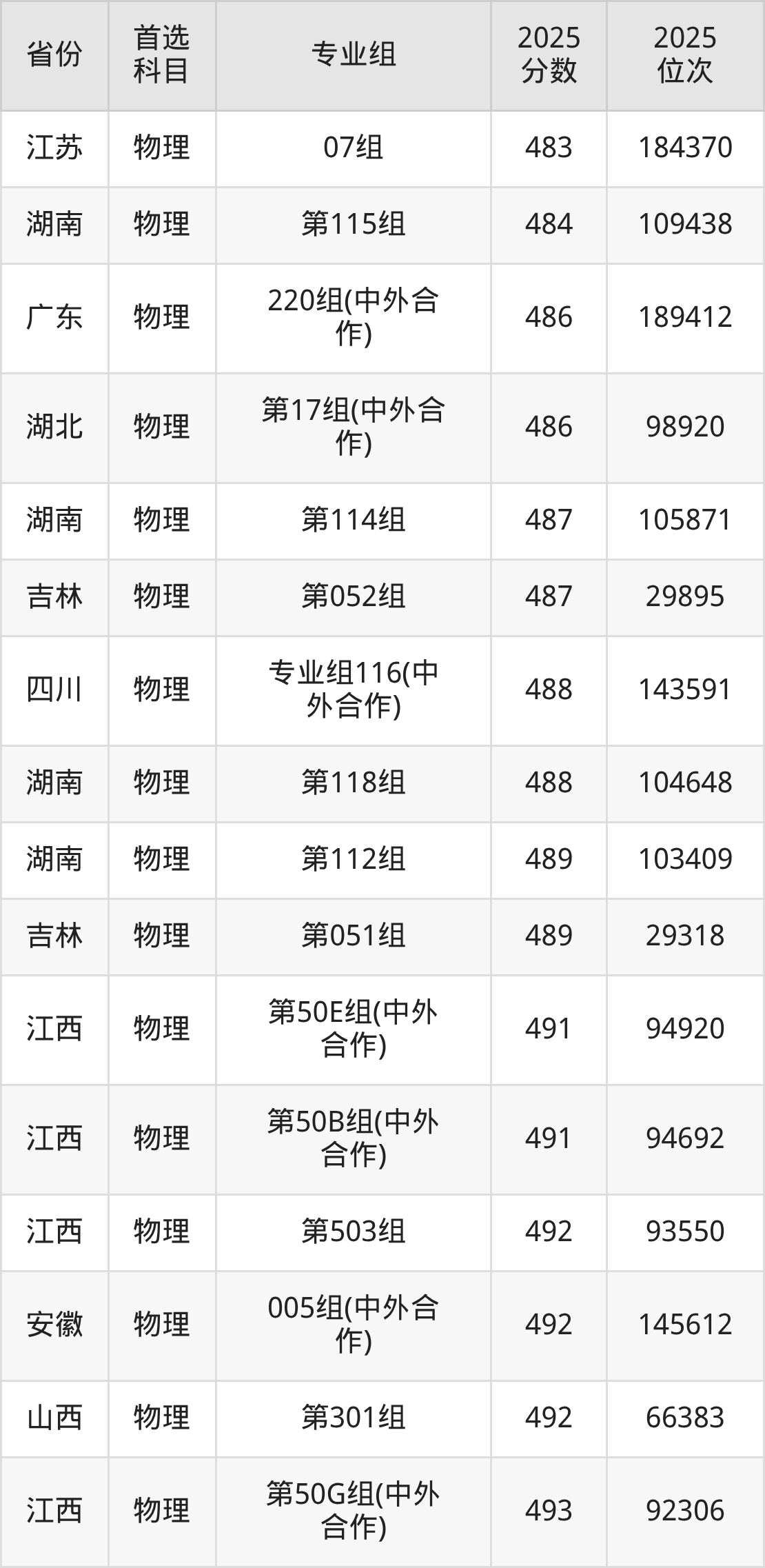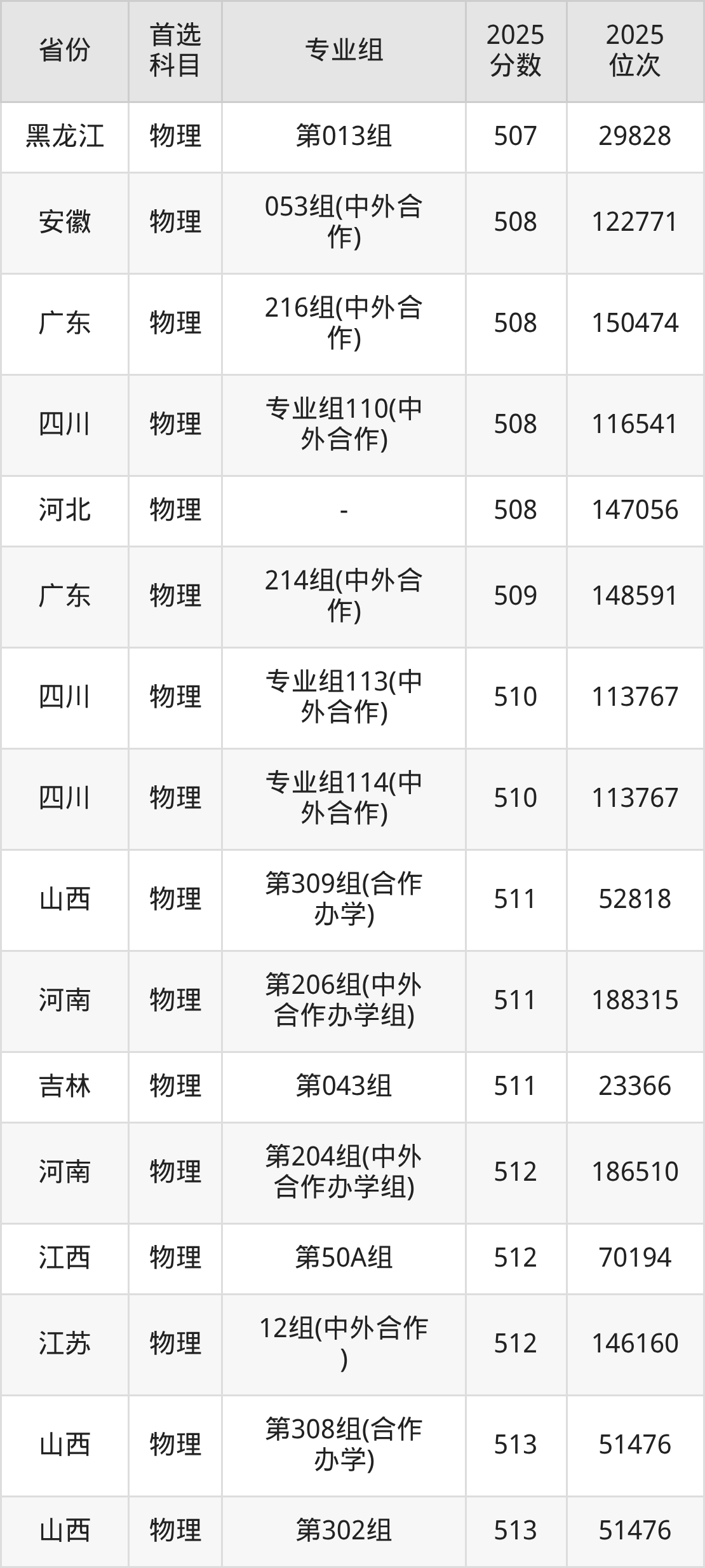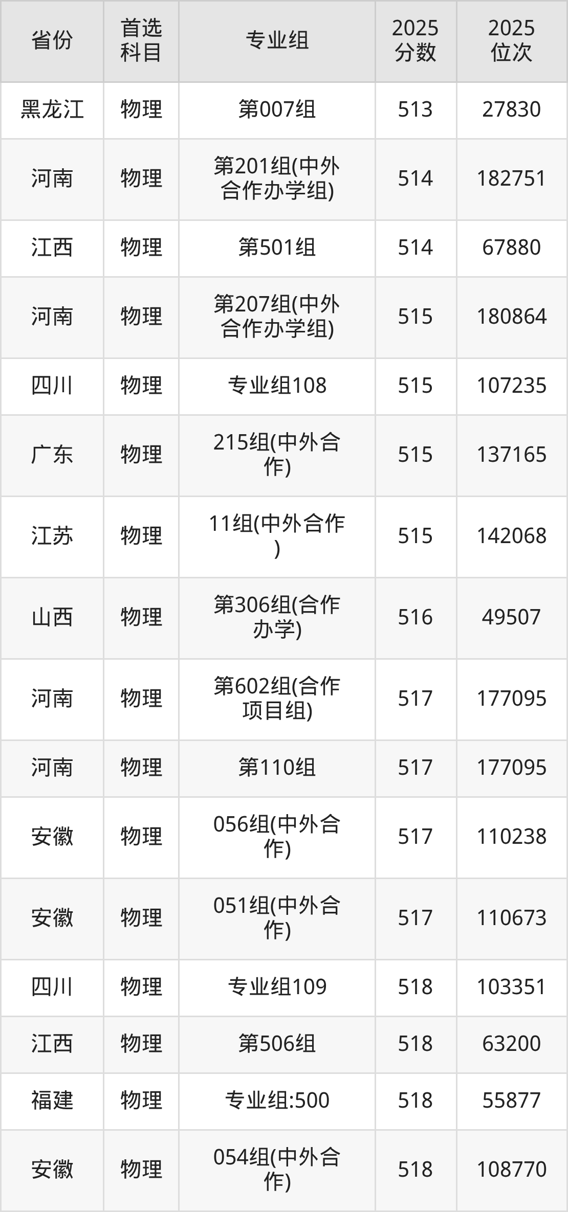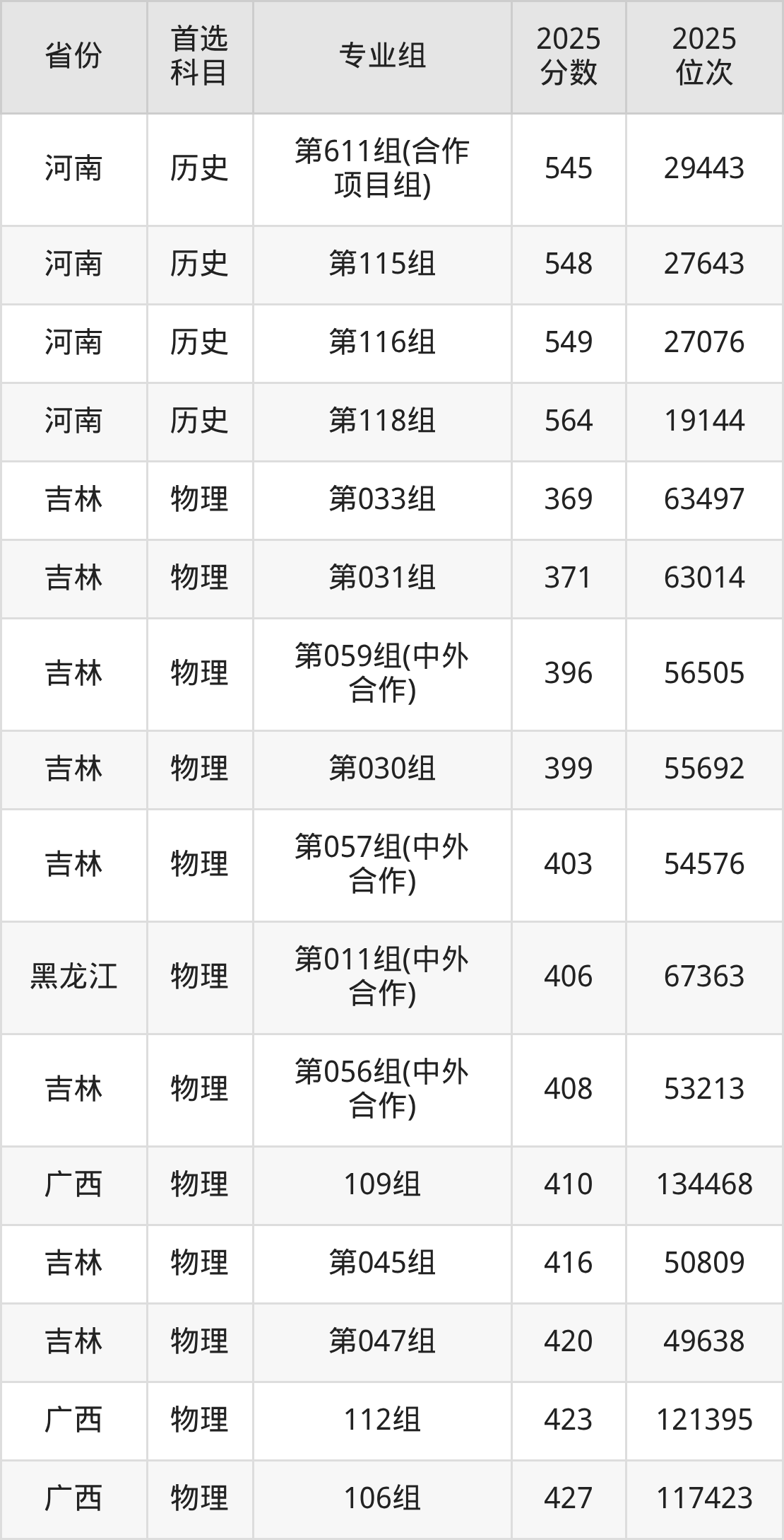 物理类:第030组399分、55692名,第031组371分、63014名,第032组449分、40957名,第033组369分、63497名,第034组461分、37266名,第035组463分、36686名,第036组470分、34651名,第037组465分、36128名,第038组452分、39998名,第039组435分、45161名,第040组433分、45764名,第041组443分、42786名,第042组439分、43976名,第043组511分、23366名,第044组439分、43976名,第045组416分、50809名,第046组466分、35819名,第047组420分、49638名,第048组466分、35819名,第049组471分、34343名,第050组481分、31557名,第051组489分、29318名,第052组487分、29895名,第053组465分、36128名,第054组457分、38506名,第055组(中外合作)435分、45161名,第056组(中外合作)408分、53213名,第057组(中外合作)403分、54576名,第058组(中外合作)444分、42482名,第059组(中外合作)396分、56505名,第060组(中外合作)430分、46698名,第061组(中外合作)438分、44262名,第062组428分、47283名;