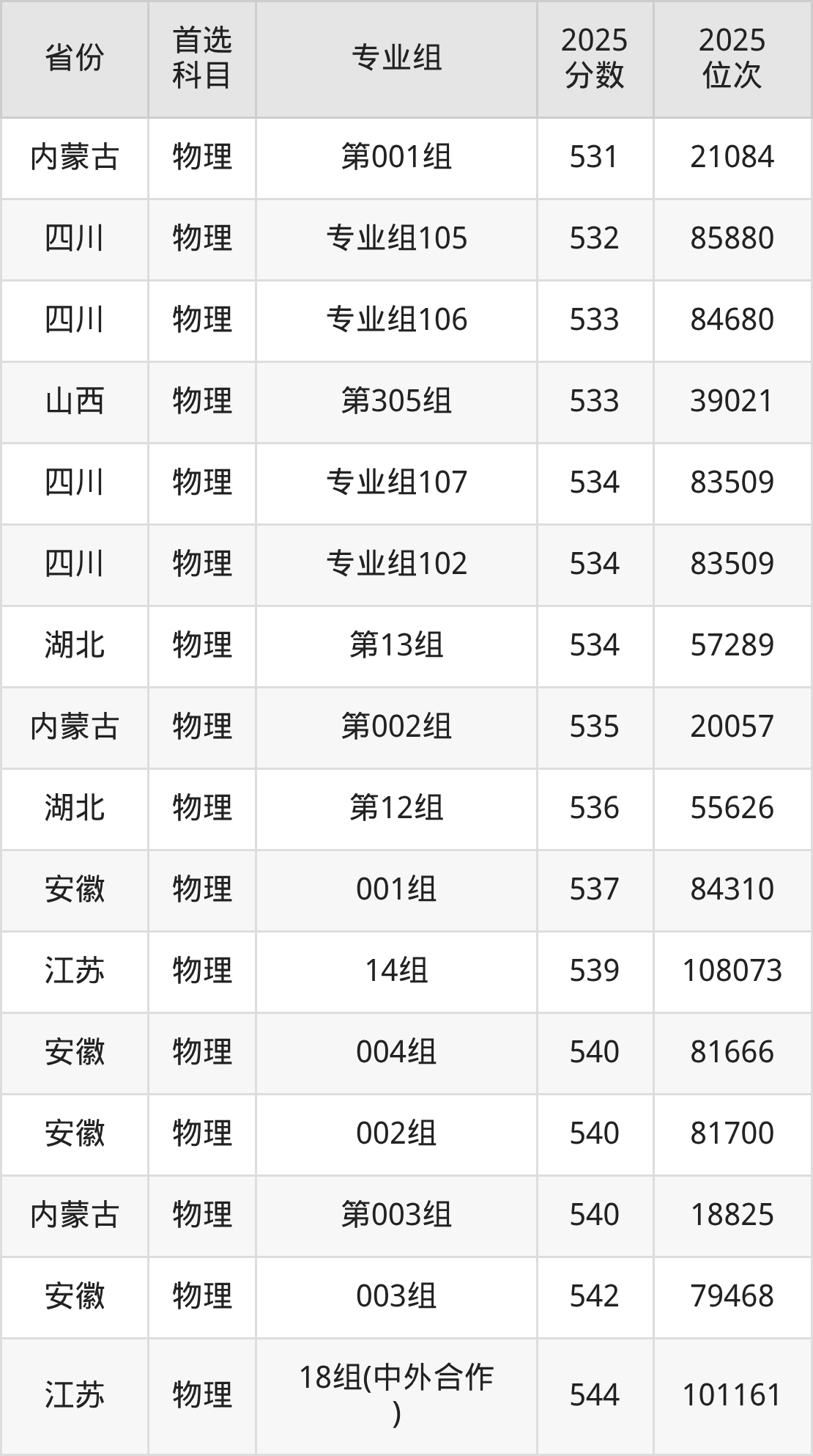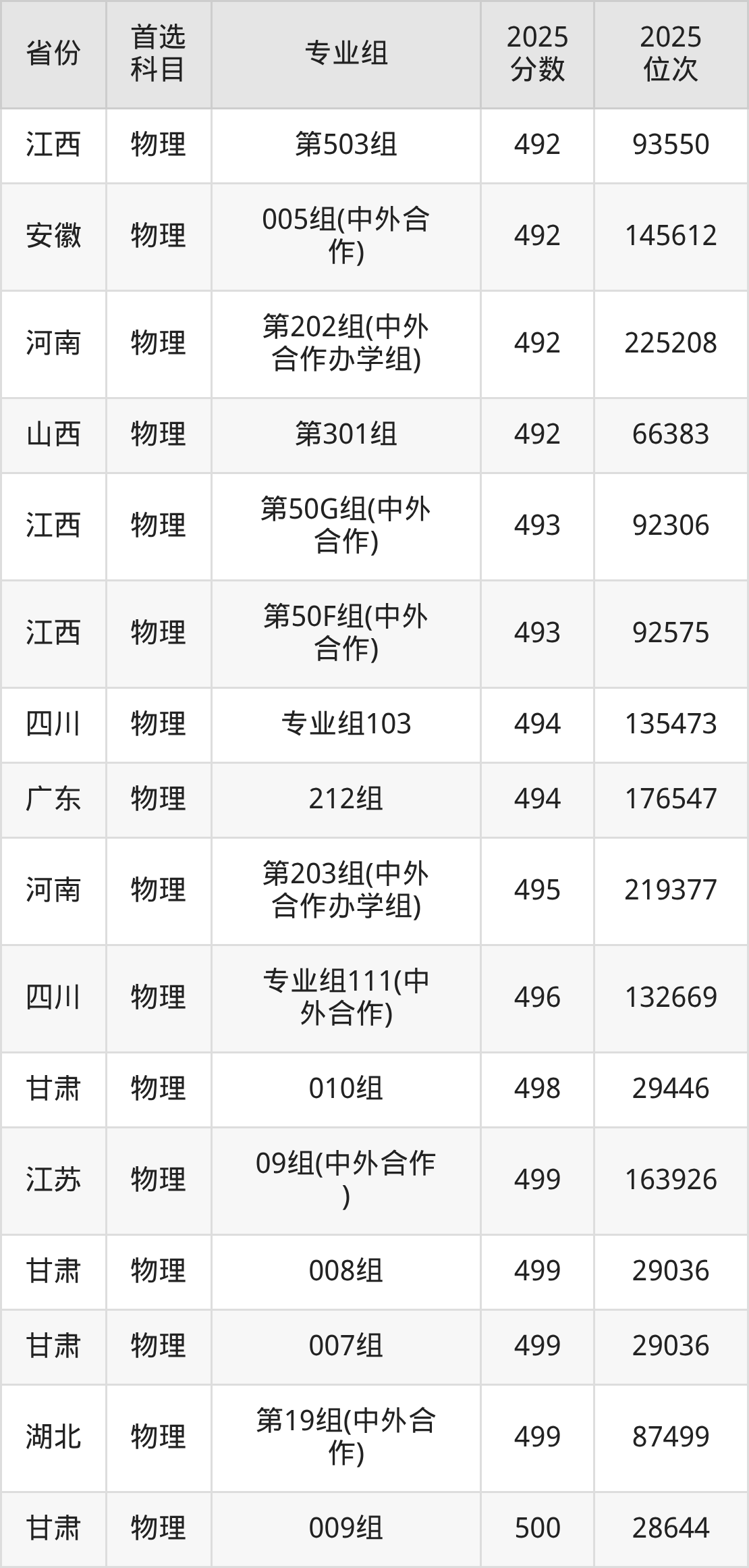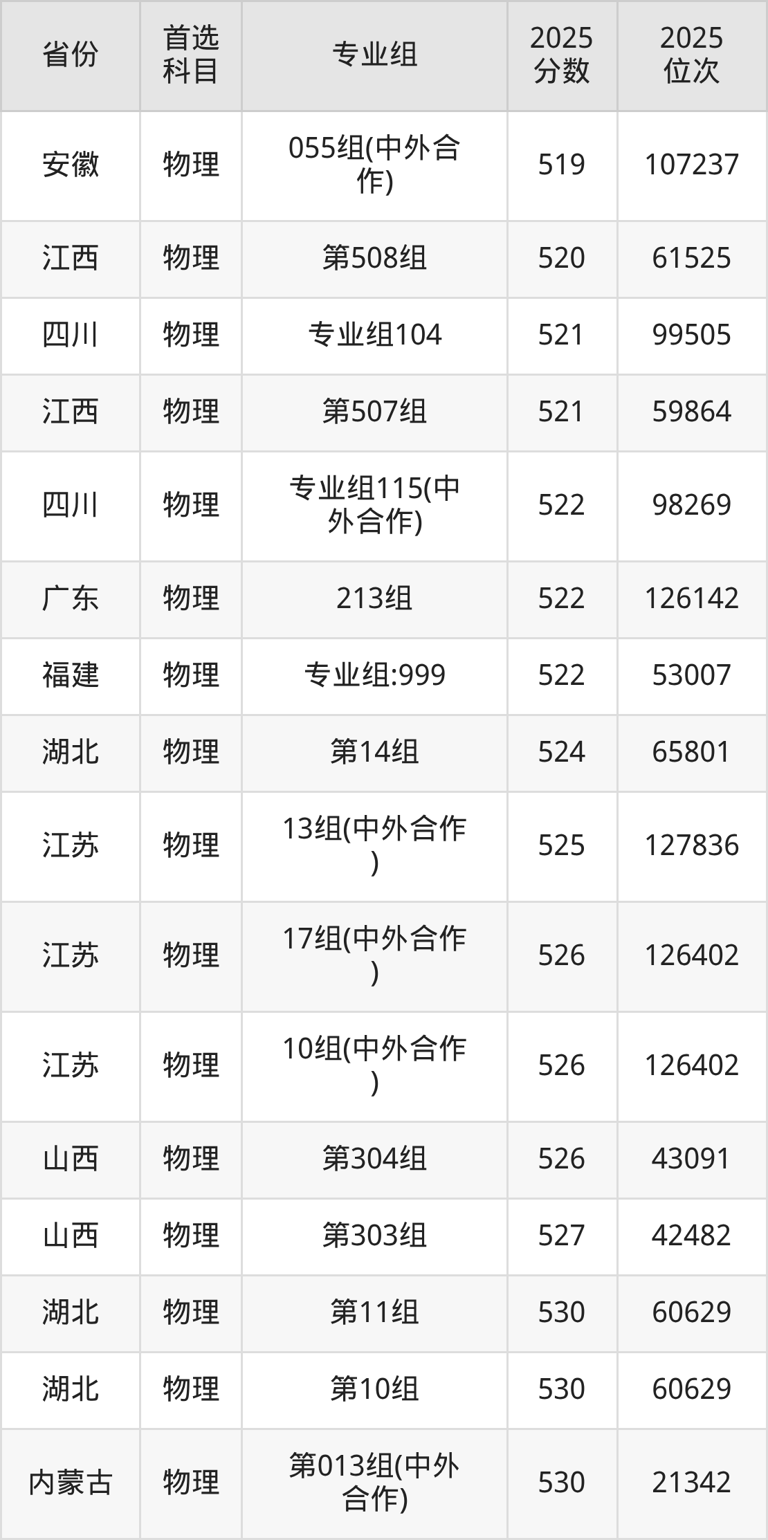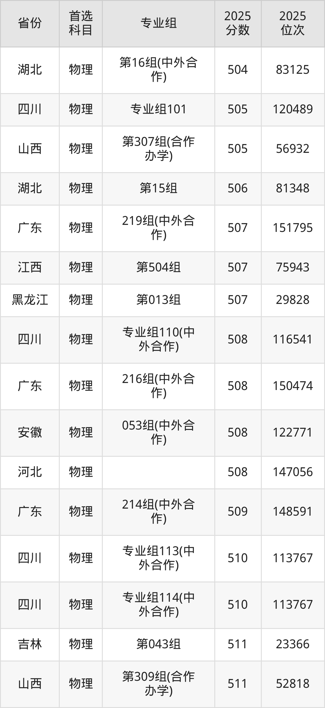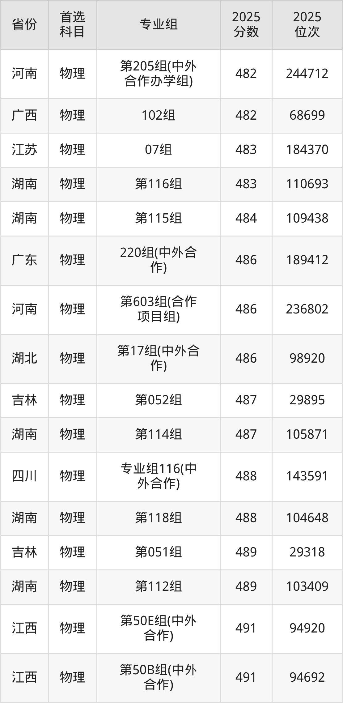 物理类:第030组399分、55692名,第031组371分、63014名,第032组449分、40957名,第033组369分、63497名,第034组461分、37266名,第035组463分、36686名,第036组470分、34651名,第037组465分、36128名,第038组452分、39998名,第039组435分、45161名,第040组433分、45764名,第041组443分、42786名,第042组439分、43976名,第043组511分、23366名,第044组439分、43976名,第045组416分、50809名,第046组466分、35819名,第047组420分、49638名,第048组466分、35819名,第049组471分、34343名,第050组481分、31557名,第051组489分、29318名,第052组487分、29895名,第053组465分、36128名,第054组457分、38506名,第055组(中外合作)435分、45161名,第056组(中外合作)408分、53213名,第057组(中外合作)403分、54576名,第058组(中外合作)444分、42482名,第059组(中外合作)396分、56505名,第060组(中外合作)430分、46698名,第061组(中外合作)438分、44262名,第062组428分、47283名;