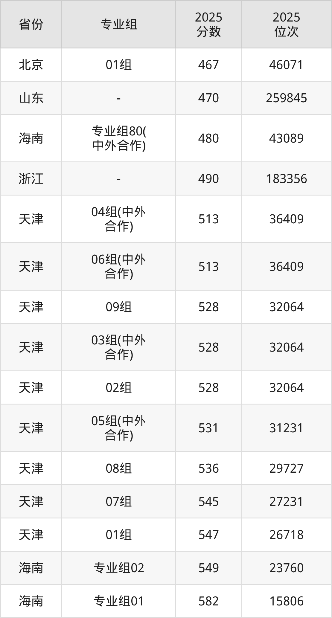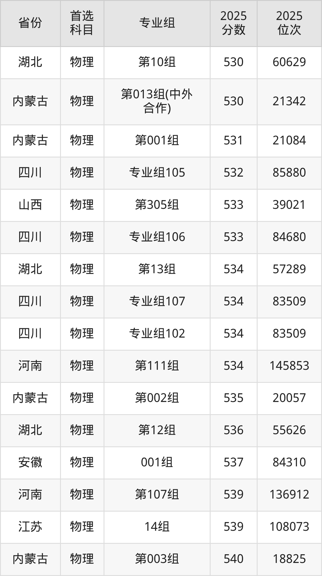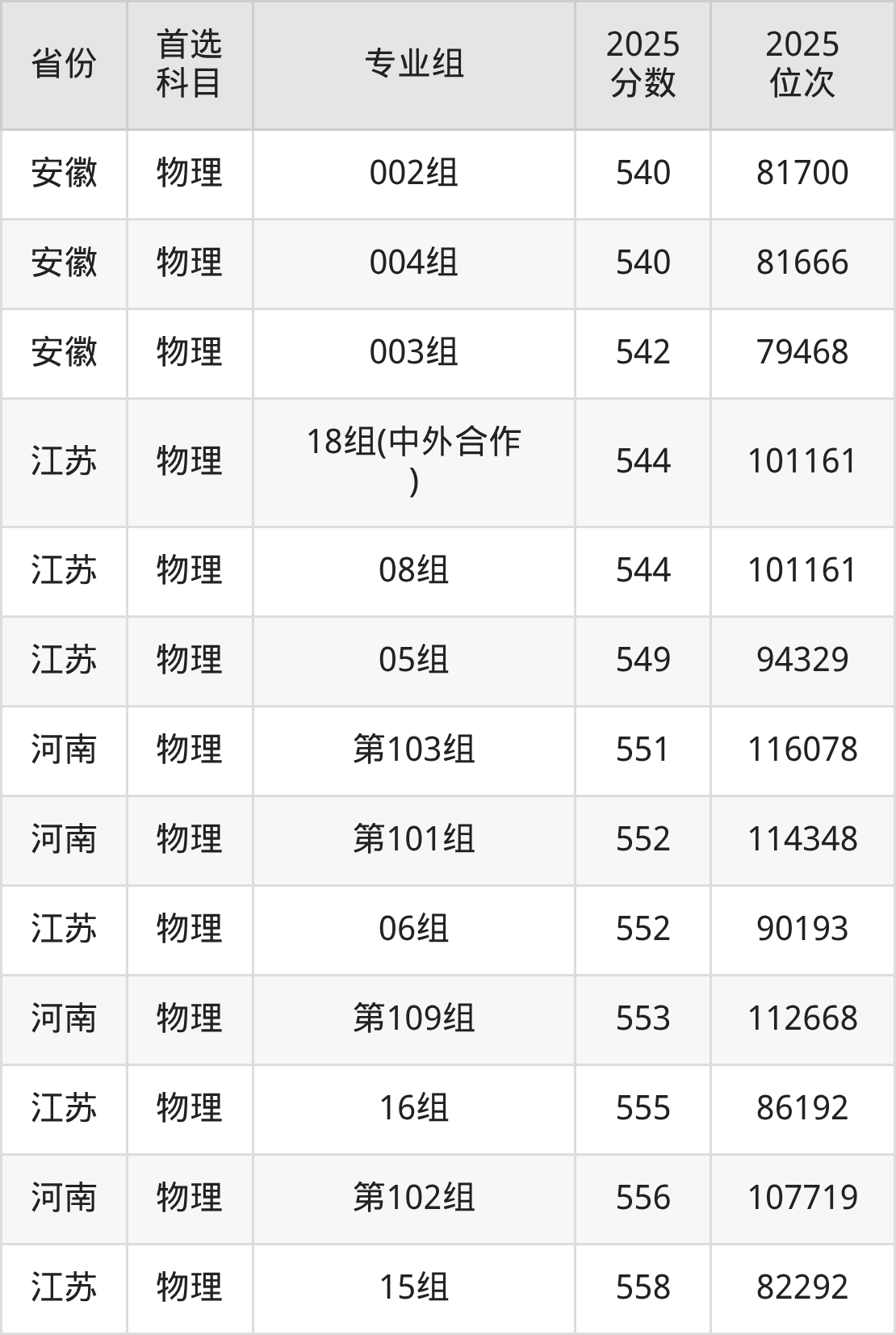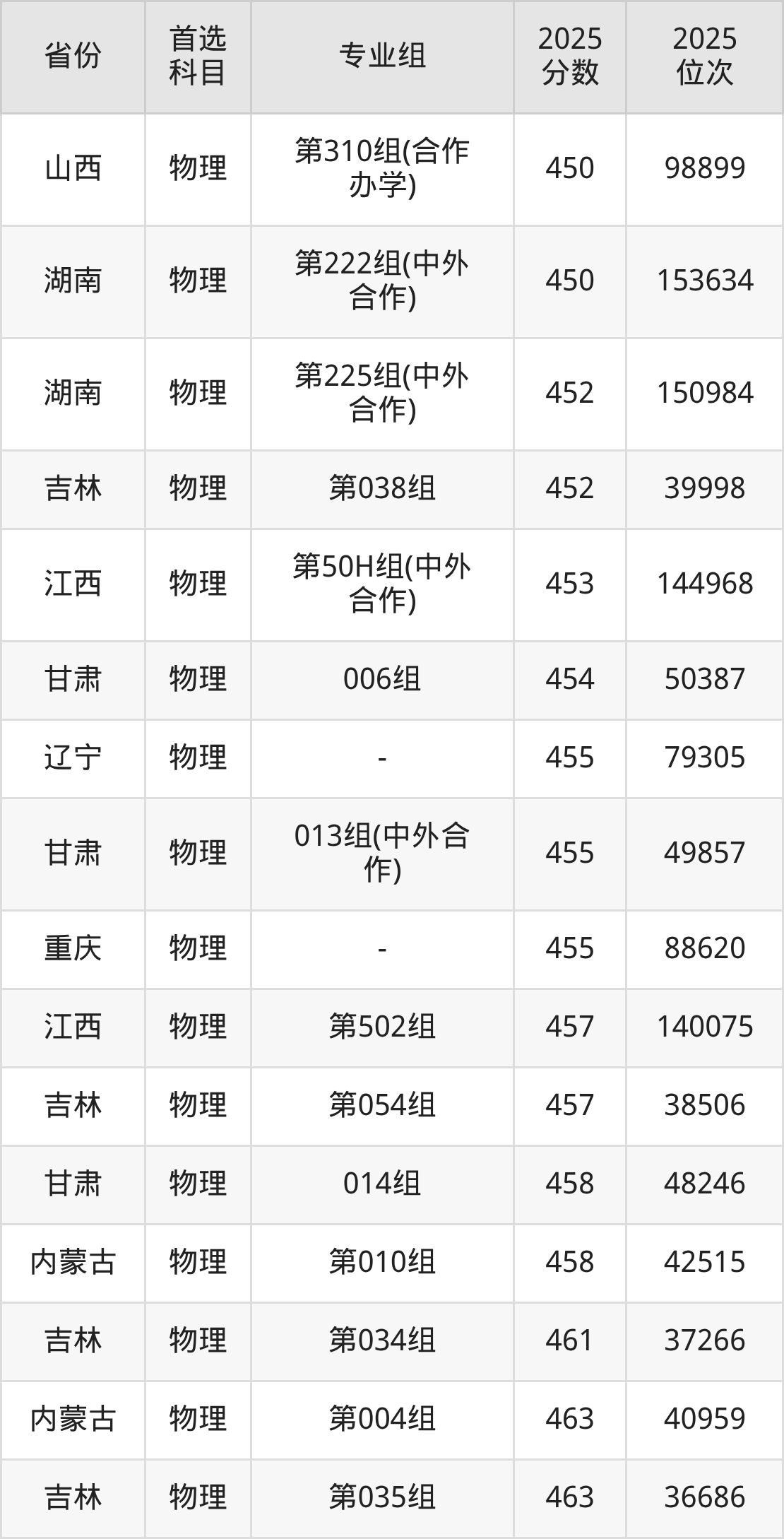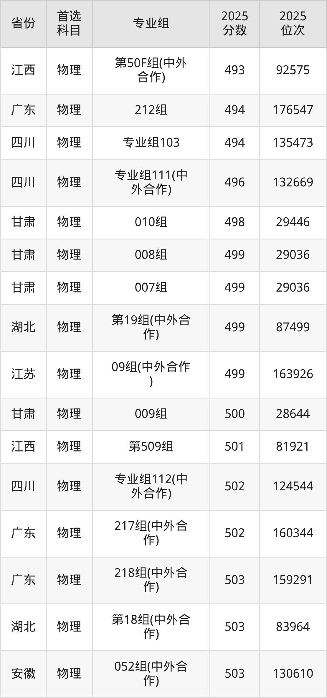 物理类:第030组399分、55692名,第031组371分、63014名,第032组449分、40957名,第033组369分、63497名,第034组461分、37266名,第035组463分、36686名,第036组470分、34651名,第037组465分、36128名,第038组452分、39998名,第039组435分、45161名,第040组433分、45764名,第041组443分、42786名,第042组439分、43976名,第043组511分、23366名,第044组439分、43976名,第045组416分、50809名,第046组466分、35819名,第047组420分、49638名,第048组466分、35819名,第049组471分、34343名,第050组481分、31557名,第051组489分、29318名,第052组487分、29895名,第053组465分、36128名,第054组457分、38506名,第055组(中外合作)435分、45161名,第056组(中外合作)408分、53213名,第057组(中外合作)403分、54576名,第058组(中外合作)444分、42482名,第059组(中外合作)396分、56505名,第060组(中外合作)430分、46698名,第061组(中外合作)438分、44262名,第062组428分、47283名;