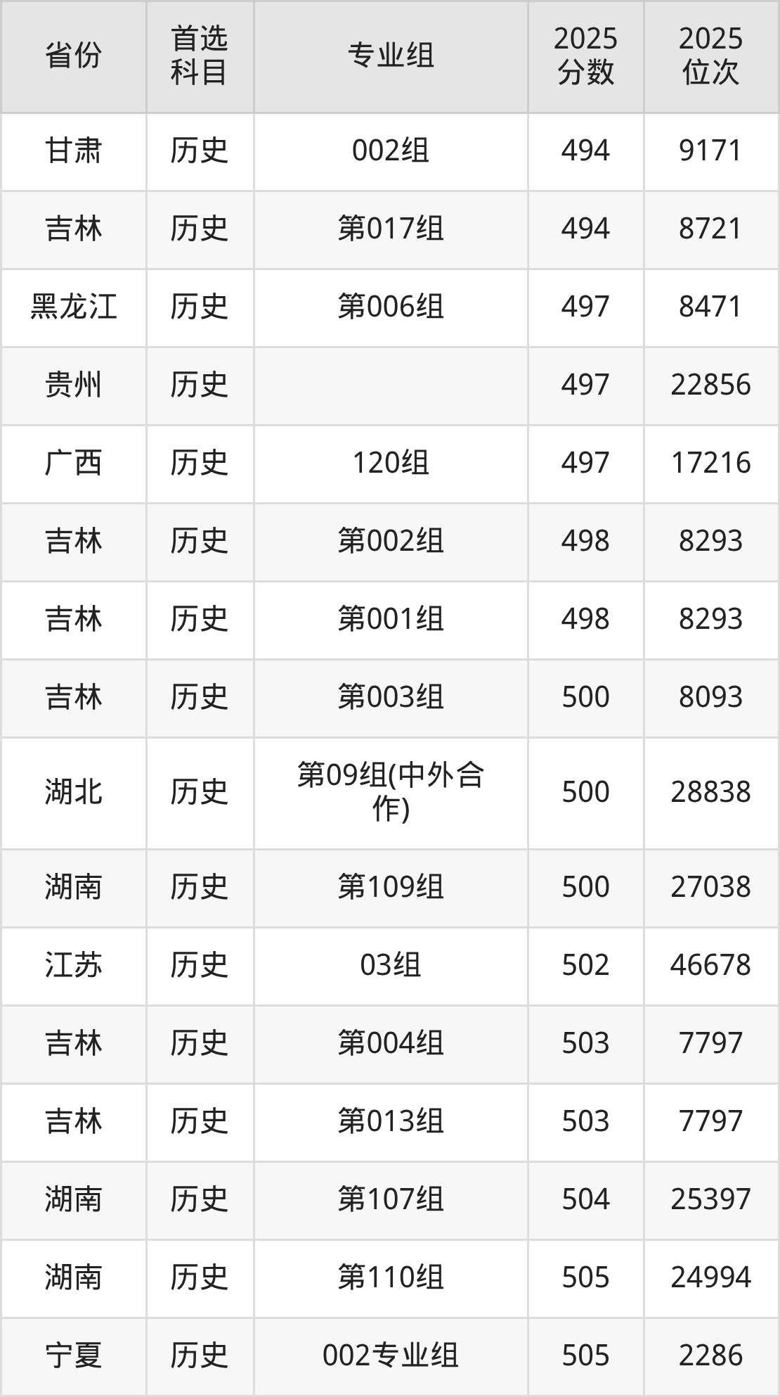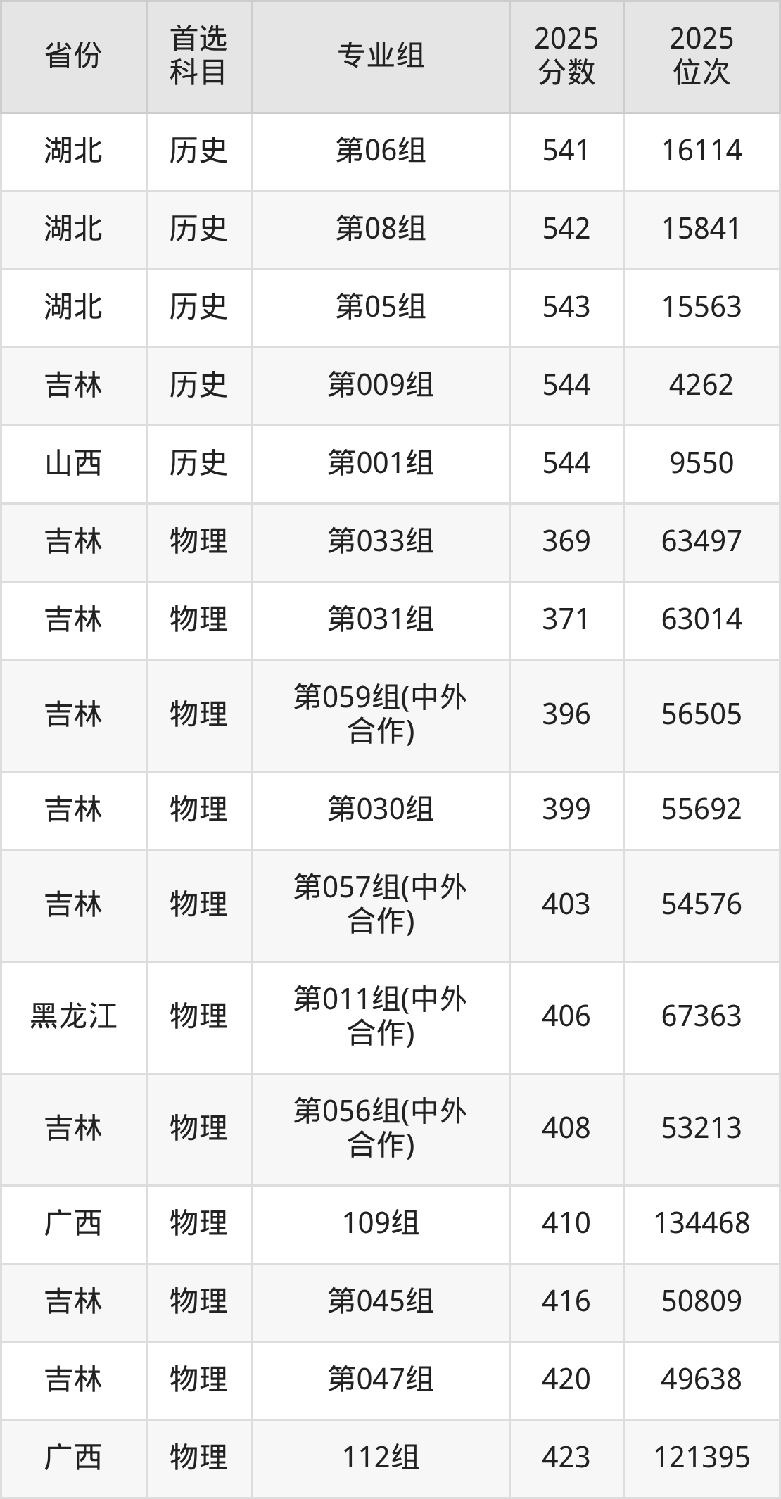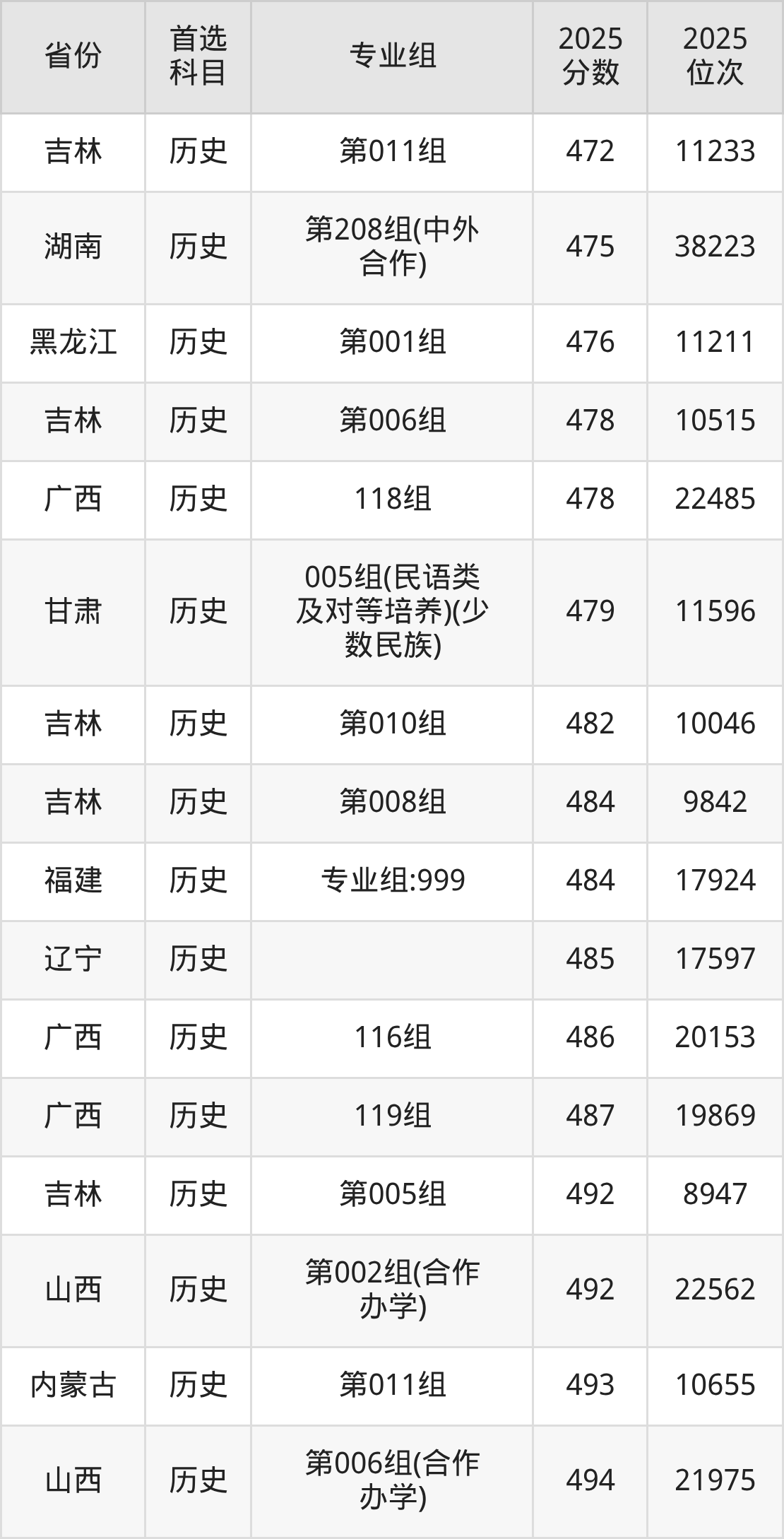 历史类最低分对应地区为吉林(第018组),录取位次为19346,超本科线21分;最高分对应地区为山西(第001组),录取位次为9550,超本科线101分。