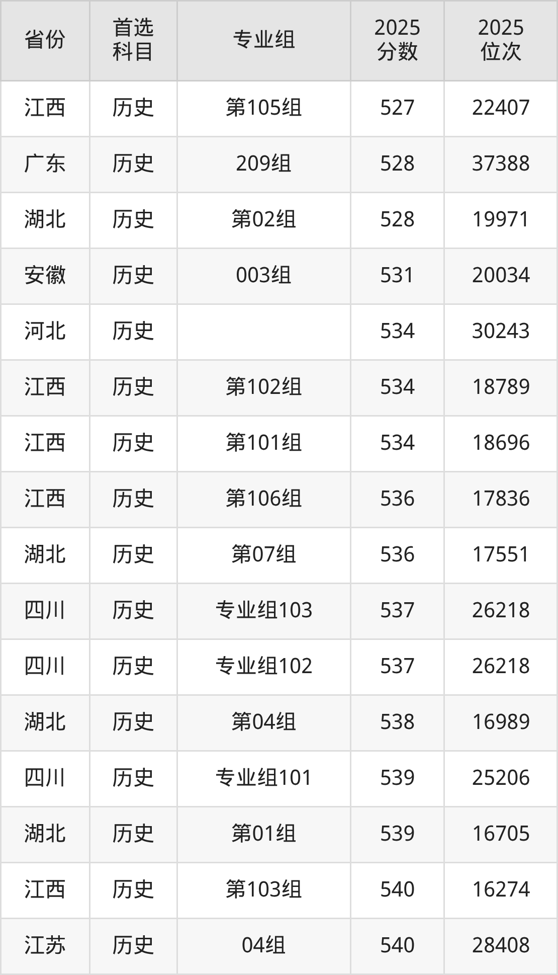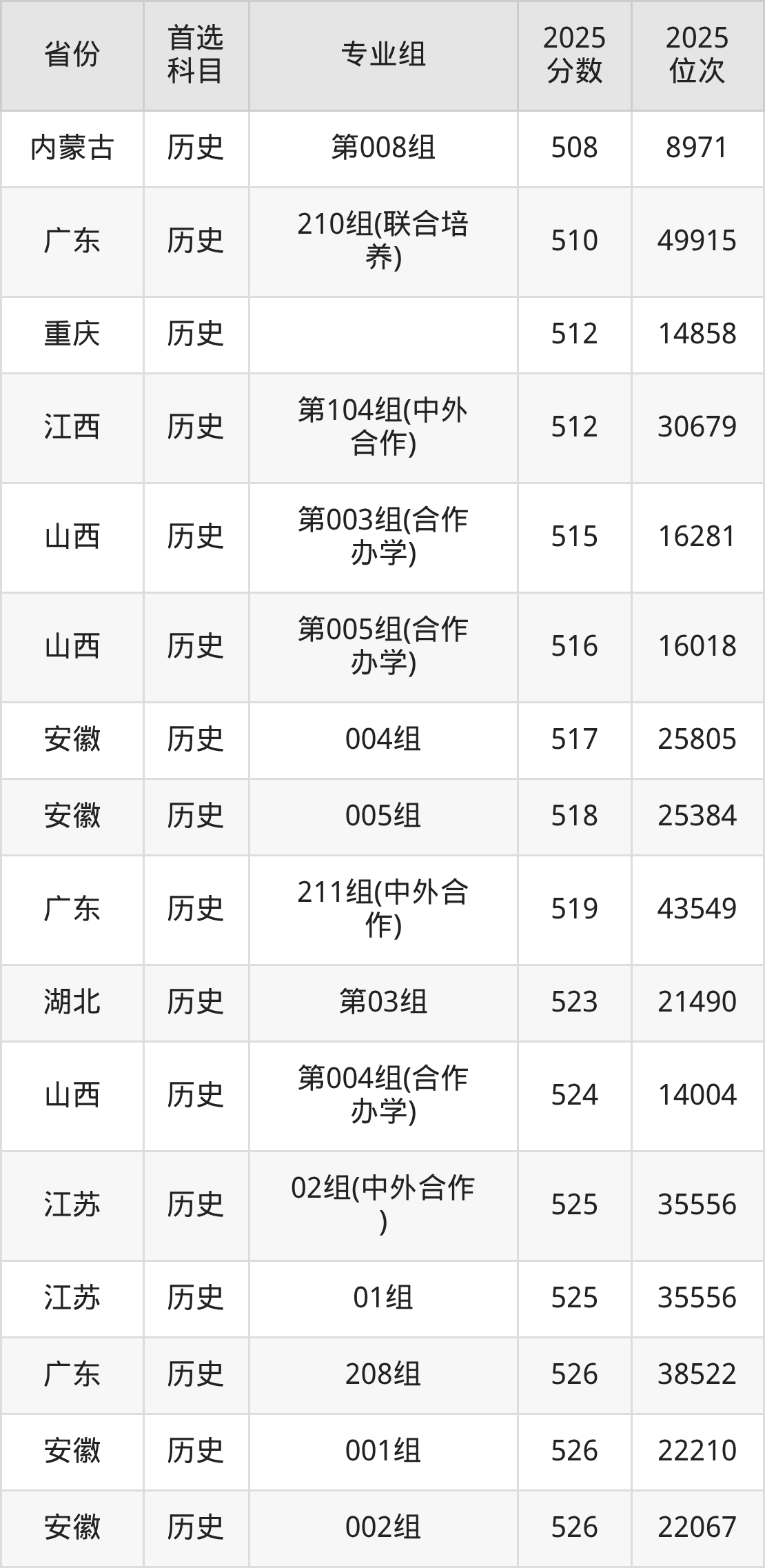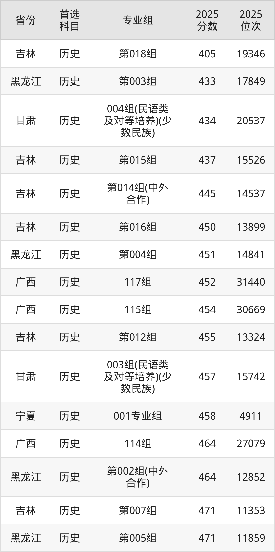 历史类最低分对应地区为吉林(第018组),录取位次为19346,超本科线21分;最高分对应地区为山西(第001组),录取位次为9550,超本科线101分。