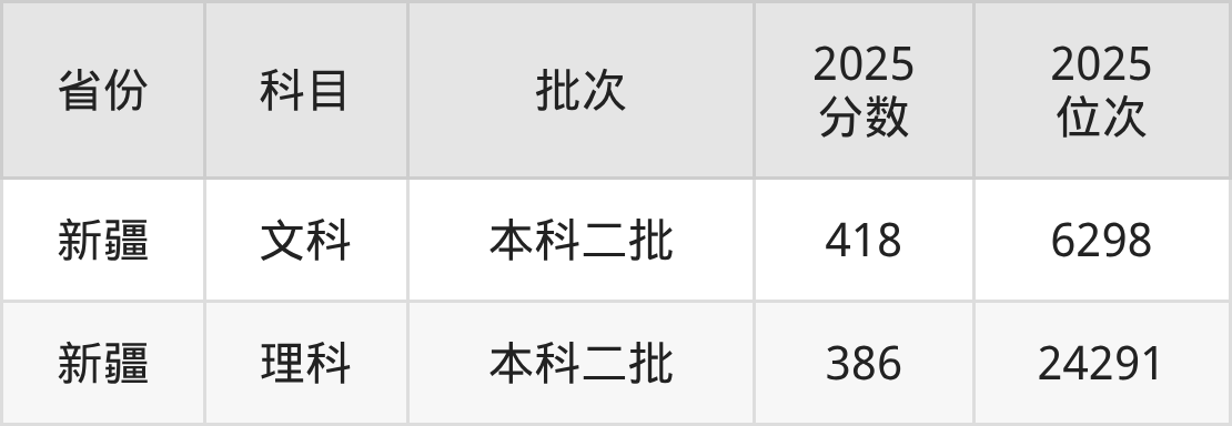 文科最低分对应地区为新疆,录取位次为6298,超二本线88分。