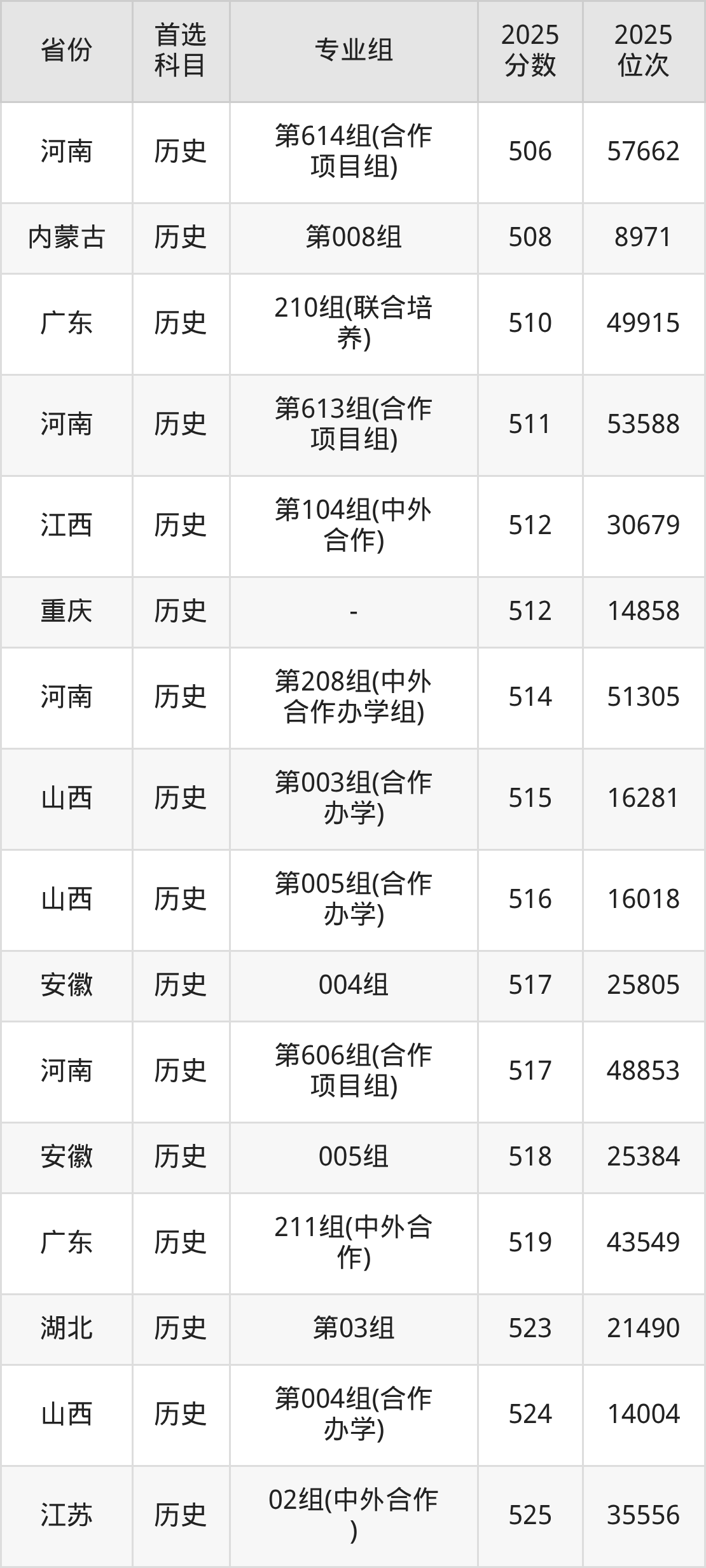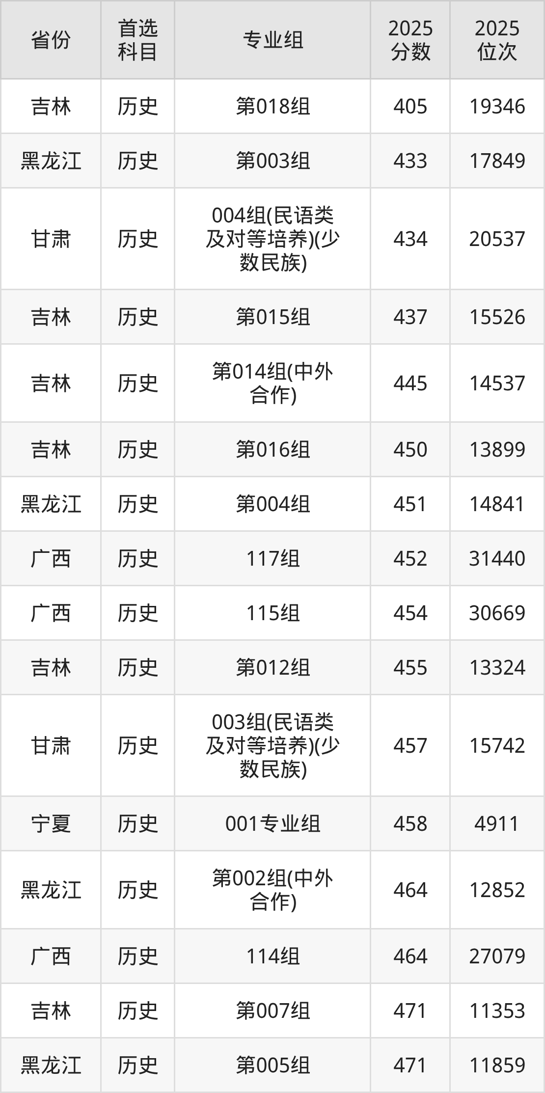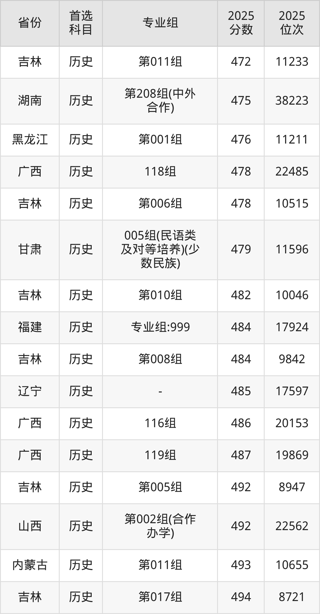 历史类:第001组489分、8343名,第002组489分、8343名,第003组496分、7646名,第004组486分、8652名,第005组463分、11238名,第006组461分、11450名,第007组469分、10530名,第008组522分、5267名,第009组470分、10418名,第010组462分、11333名,第011组445分、13372名,第012组484分、8860名,第013组(中外合作)434分、14697名;