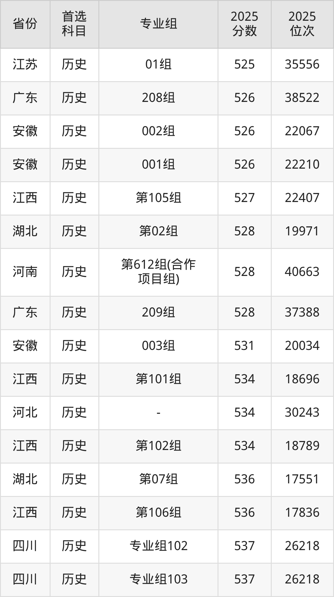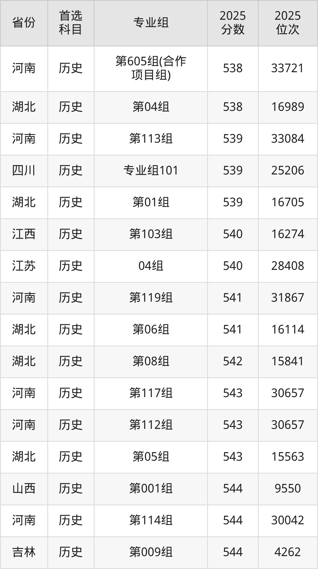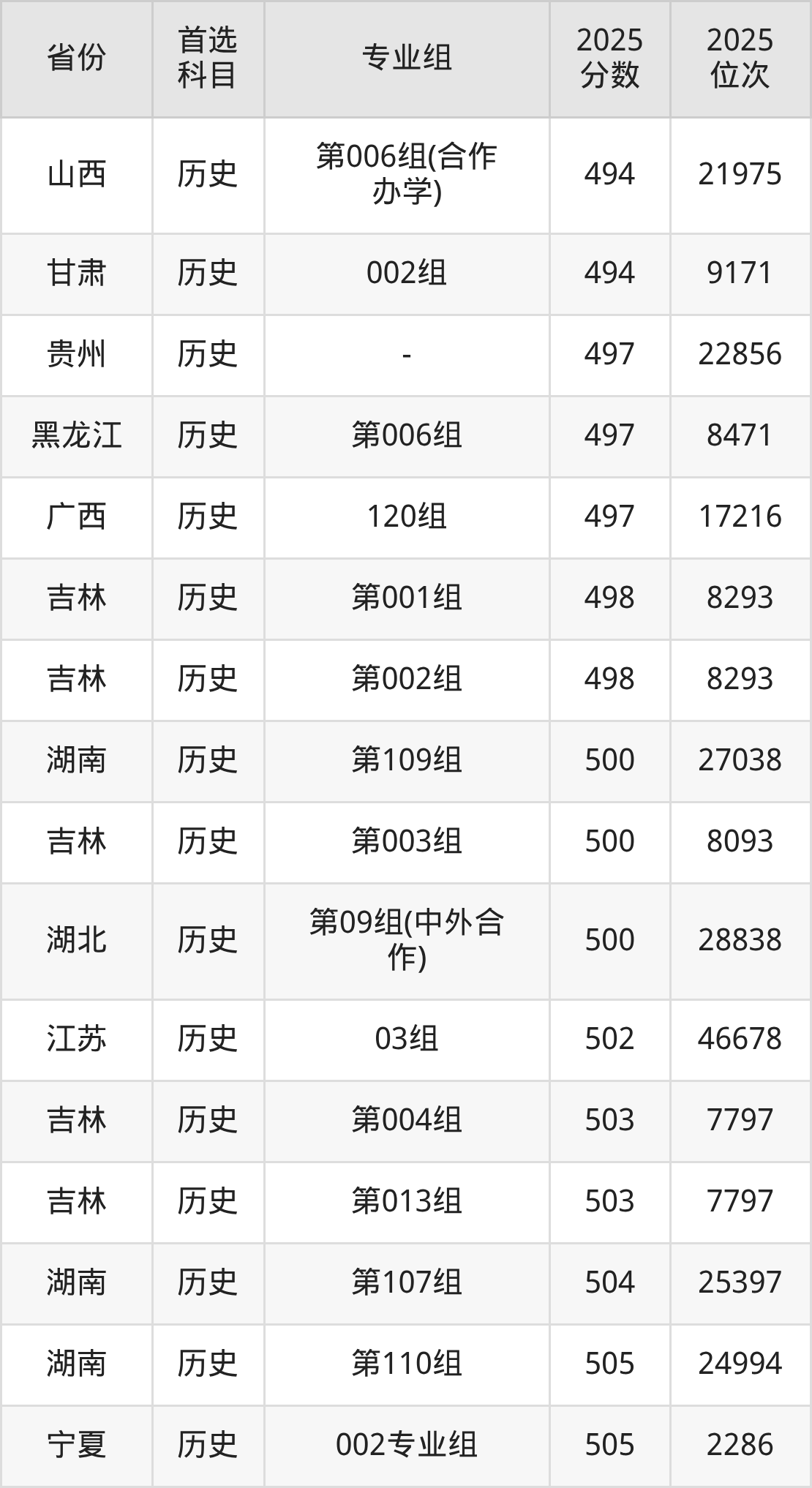 历史类最低分对应地区为吉林(第018组),录取位次为19346,超本科线21分;最高分对应地区为河南(第118组),录取位次为19144,超本科线93分。