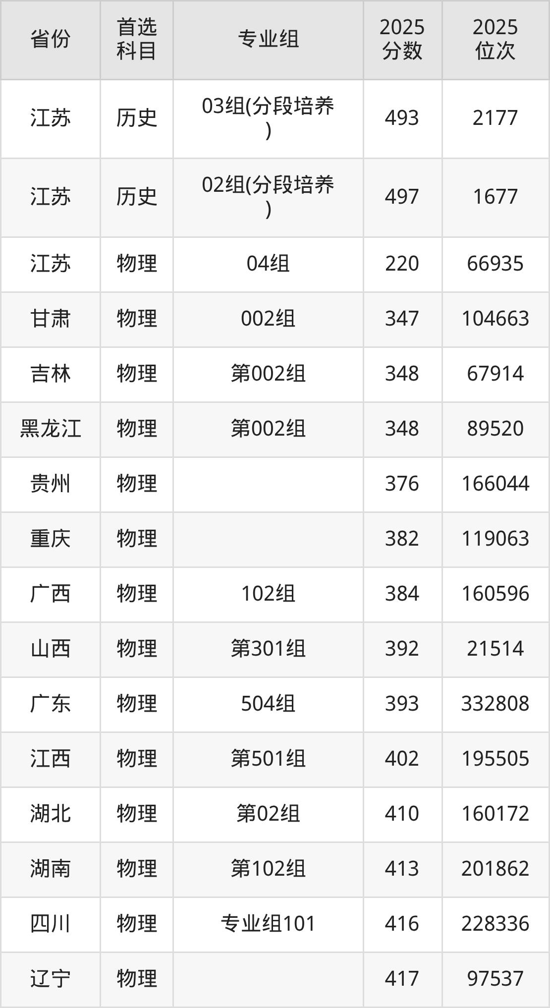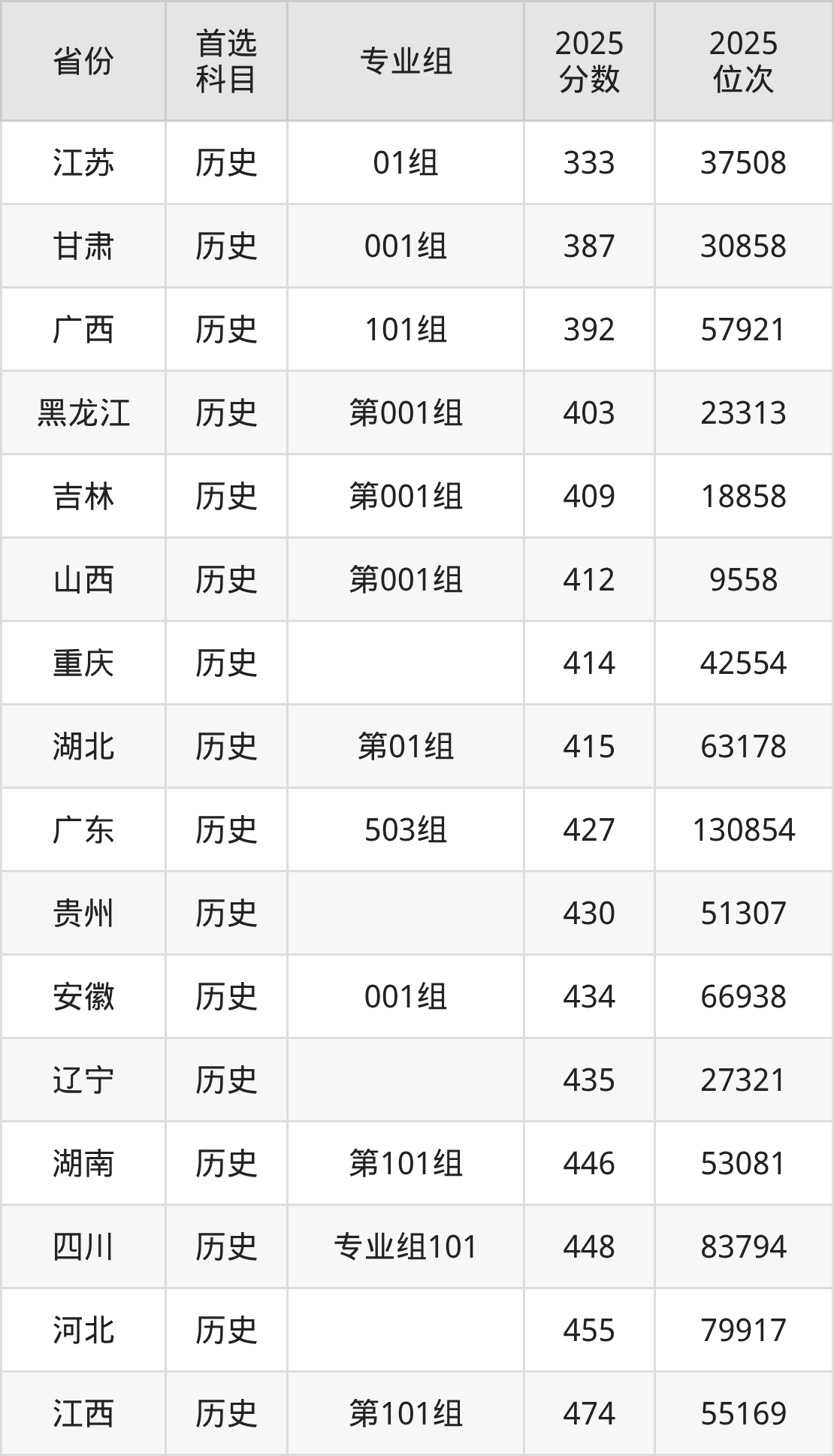 历史类:01组333分、37508名,02组(分段培养)497分、1677名,03组(分段培养)493分、2177名;