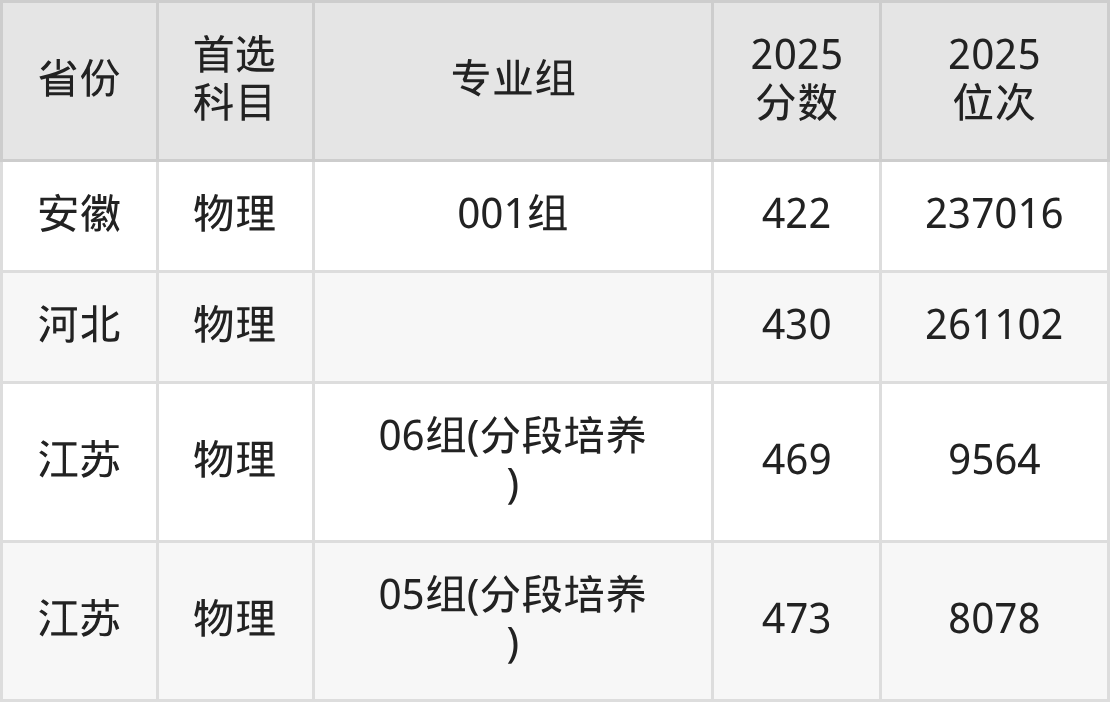物理类最低分对应地区为江苏(04组),录取位次为66935;最高分对应地区为江苏(05组(分段培养)),录取位次为8078,超专科线253分。