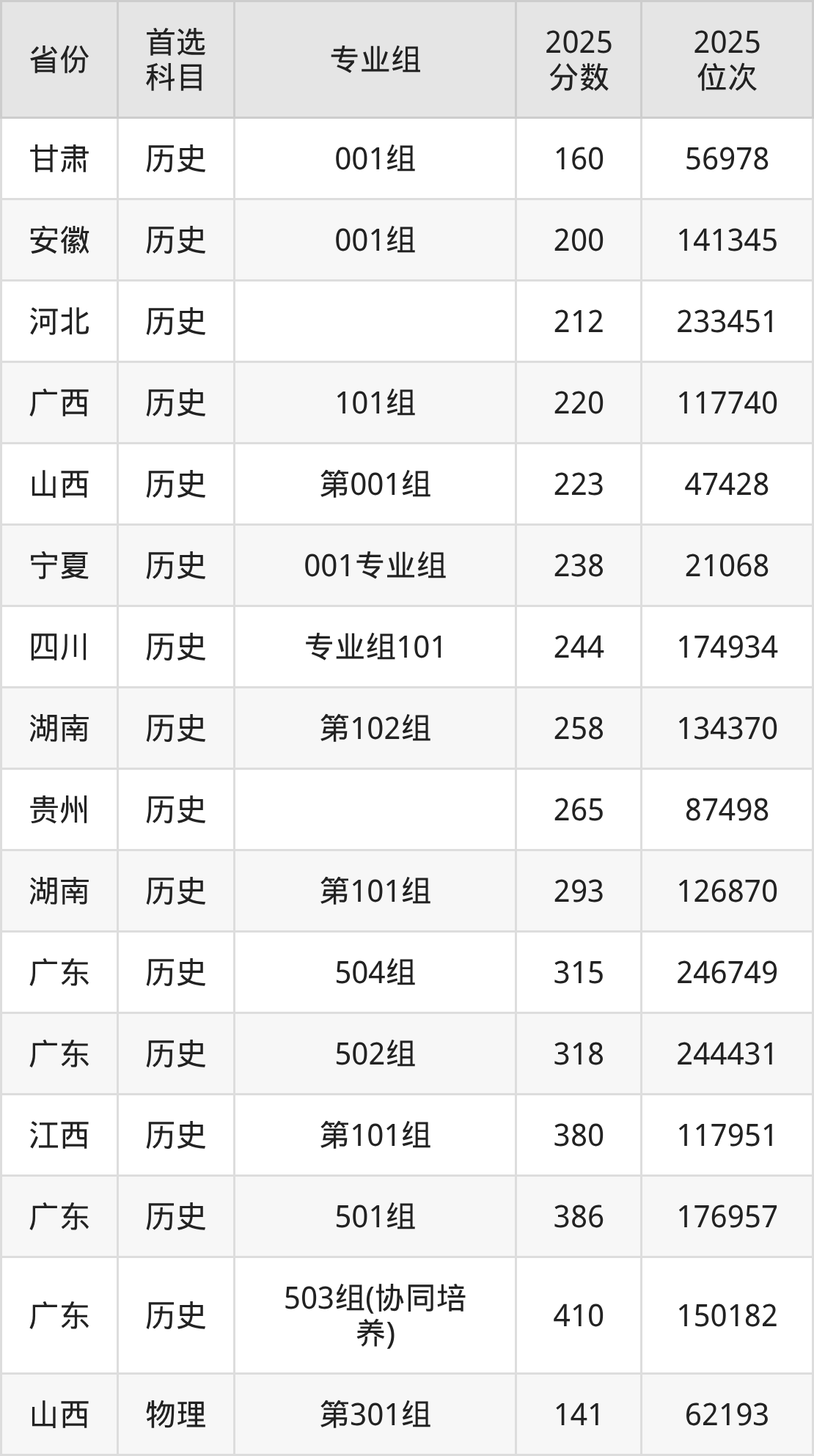 历史类最低分对应地区为甘肃(001组),录取位次为56978;最高分对应地区为广东(503组(协同培养)),录取位次为150182,超专科线195分。