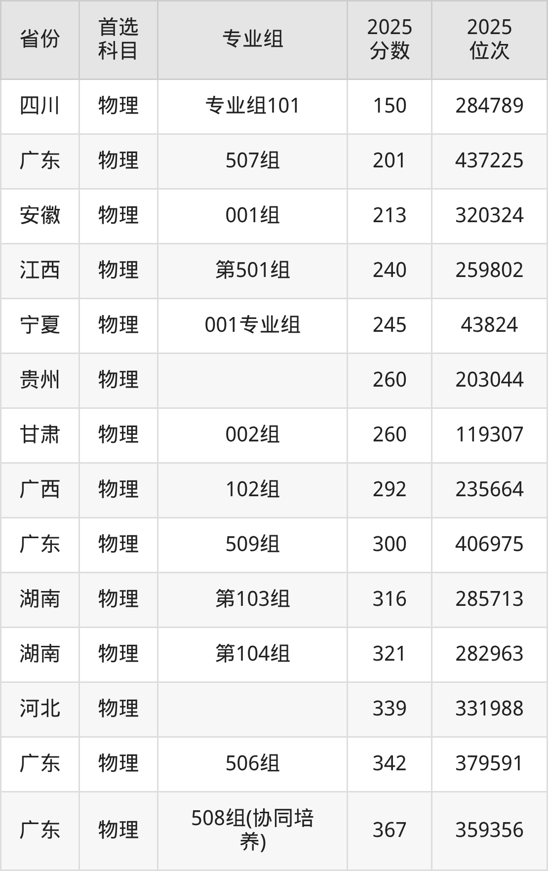 物理类:506组342分、379591名,507组201分、437225名,508组(协同培养)367分、359356名,509组300分、406975名;