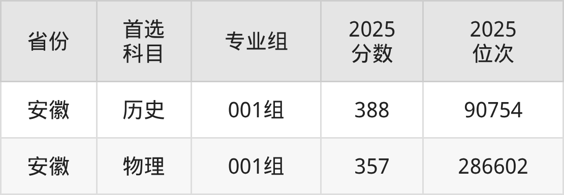 物理类最低分对应地区为安徽(001组),录取位次为286602,超专科线157分。