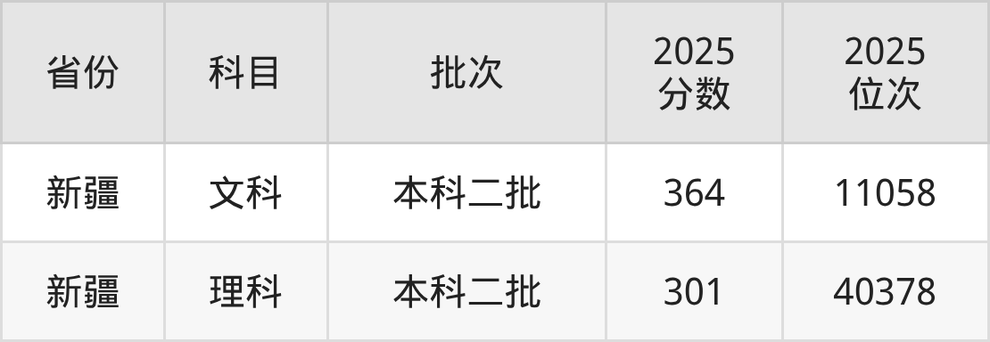 文科最低分对应地区为新疆,录取位次为11058,超二本线34分。